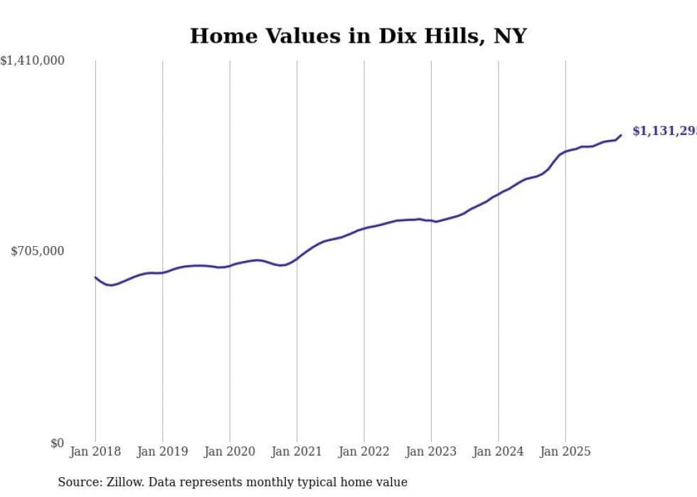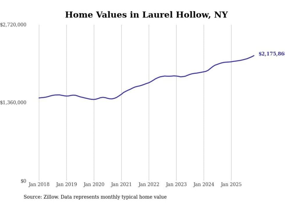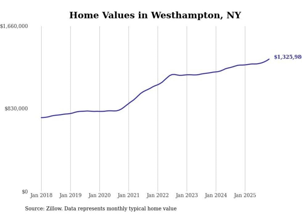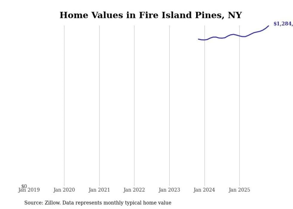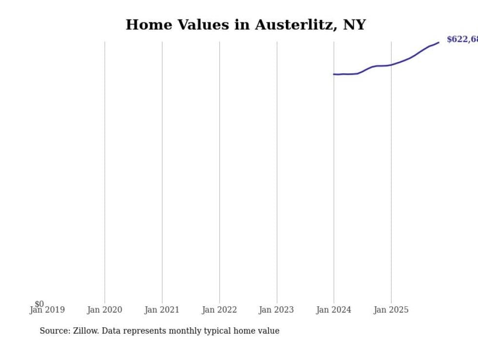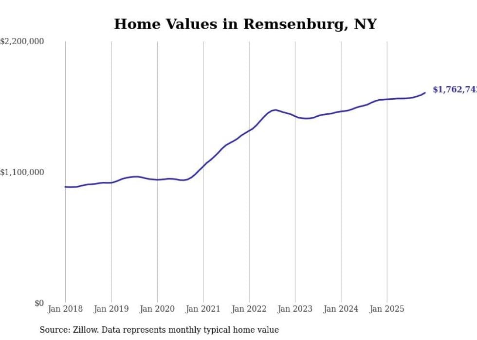 Stacker compiled a list of cities with the fastest-growing home prices in New York using data from Zillow. Cities are ranked by the dollar change in the Zillow Home Values Index for all homes from the 12 months ending November 2025. The charts in this story were created automatically using Matplotlib. Data was available for 50 cities and towns in New York.
