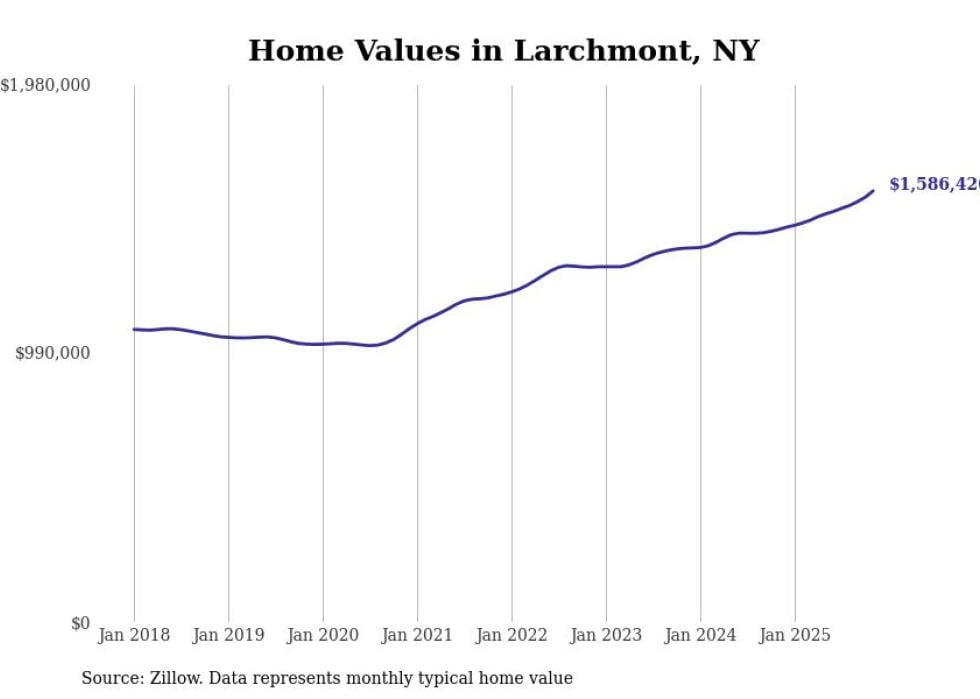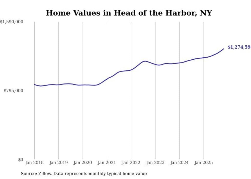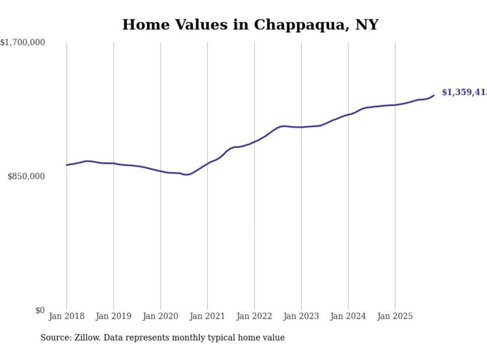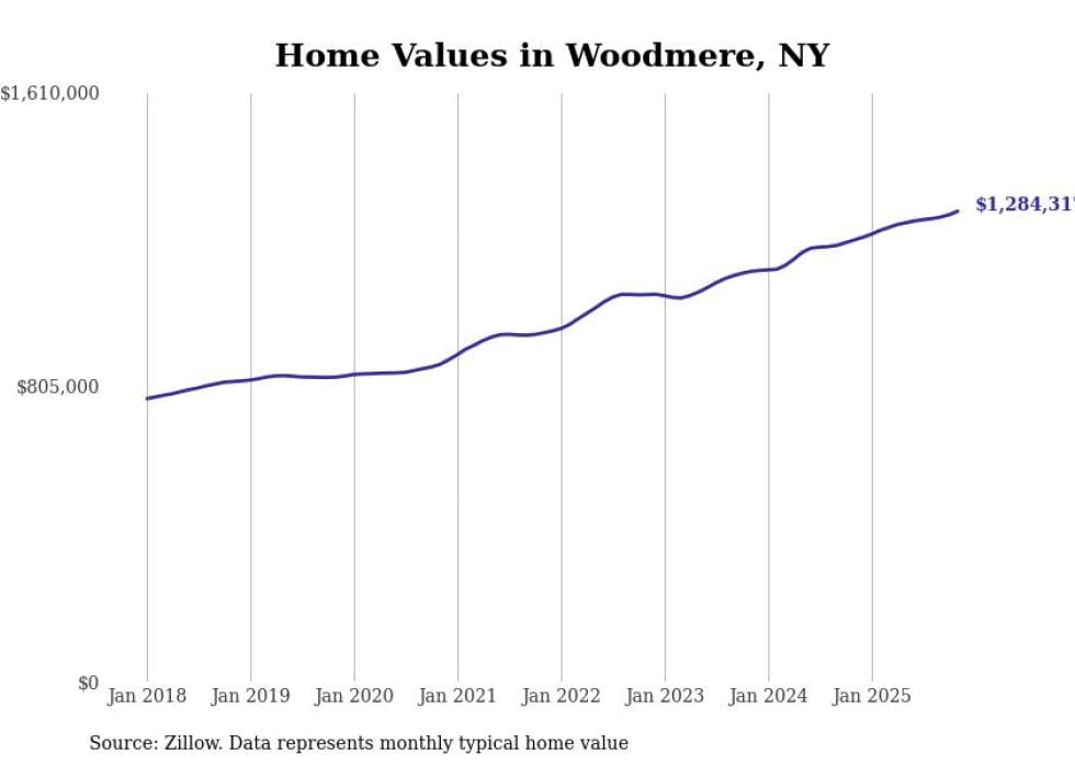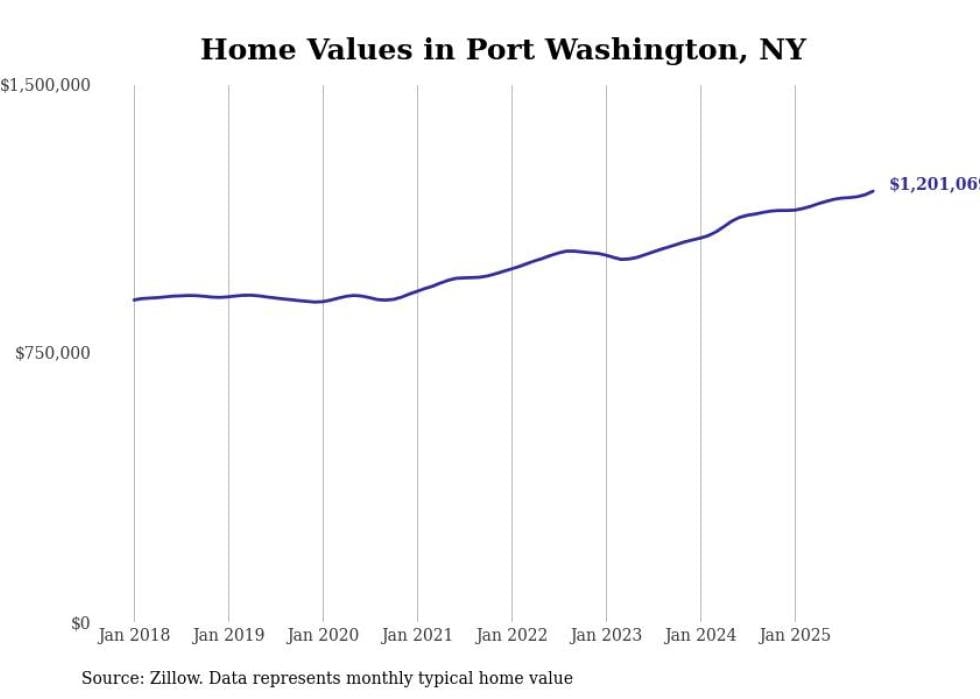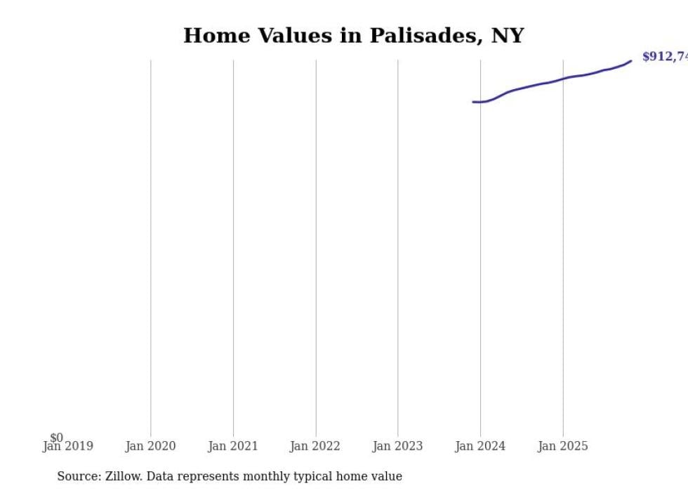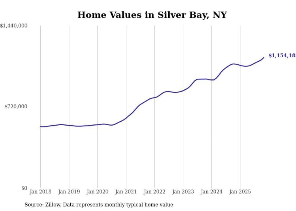Stacker compiled a list of cities with the fastest-growing home prices in New York using data from Zillow. Cities are ranked by the dollar change in the Zillow Home Values Index for all homes from the 12 months ending November 2025. The charts in this story were created automatically using Matplotlib. Data was available for 50 cities and towns in New York.