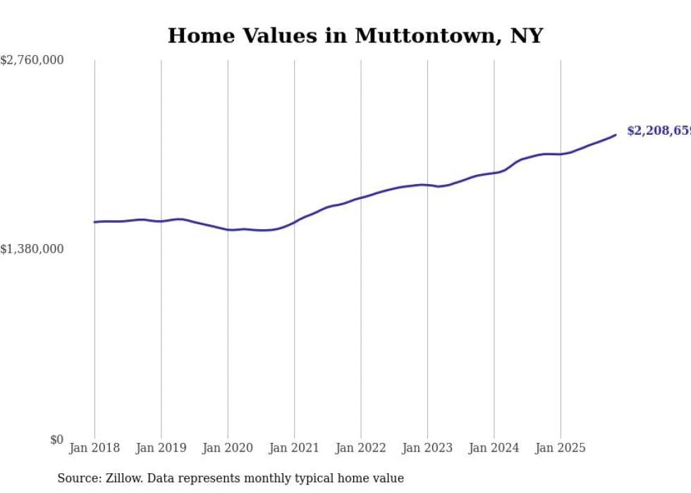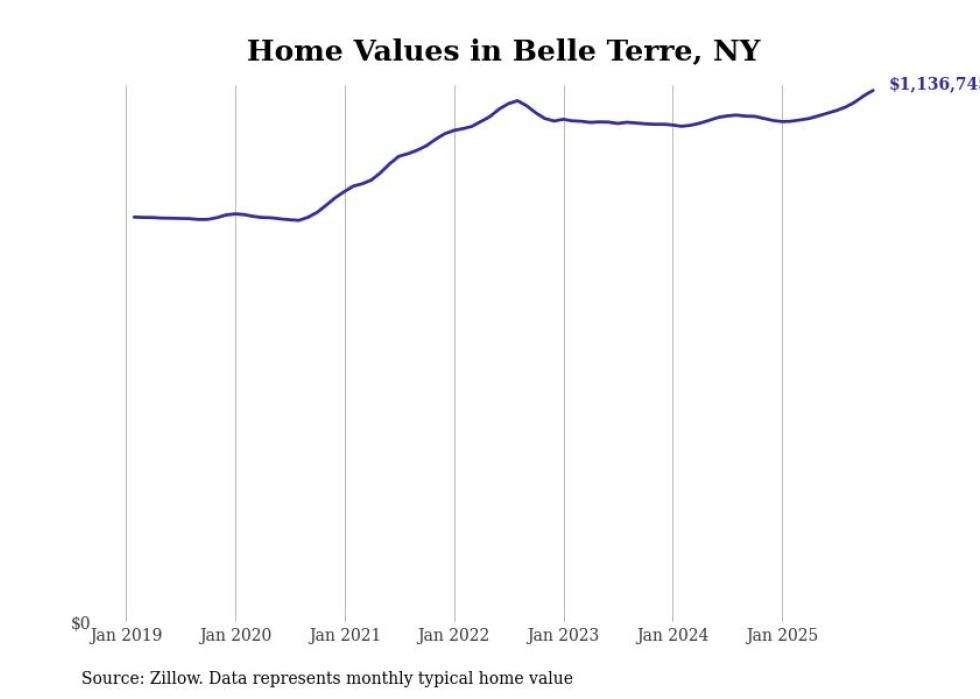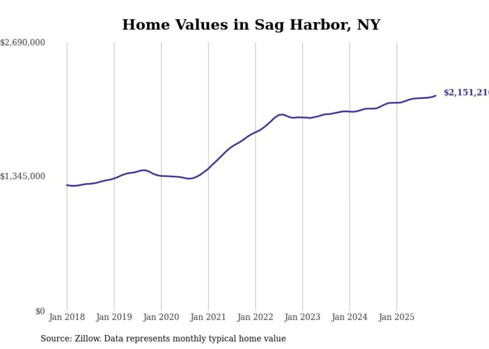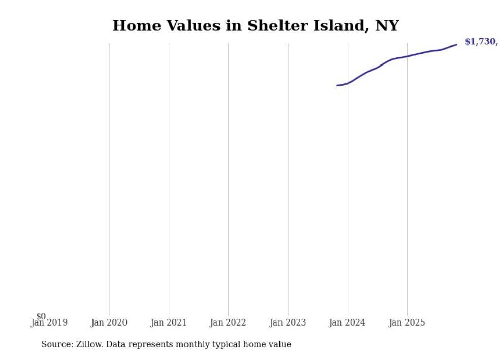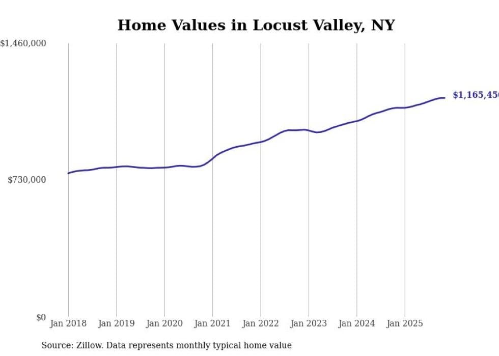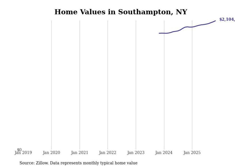 Stacker compiled a list of cities with the fastest-growing home prices in New York using data from Zillow. Cities are ranked by the dollar change in the Zillow Home Values Index for all homes from the 12 months ending November 2025. The charts in this story were created automatically using Matplotlib. Data was available for 50 cities and towns in New York.