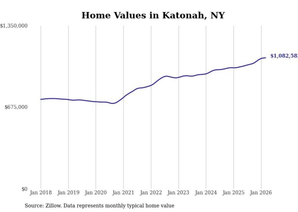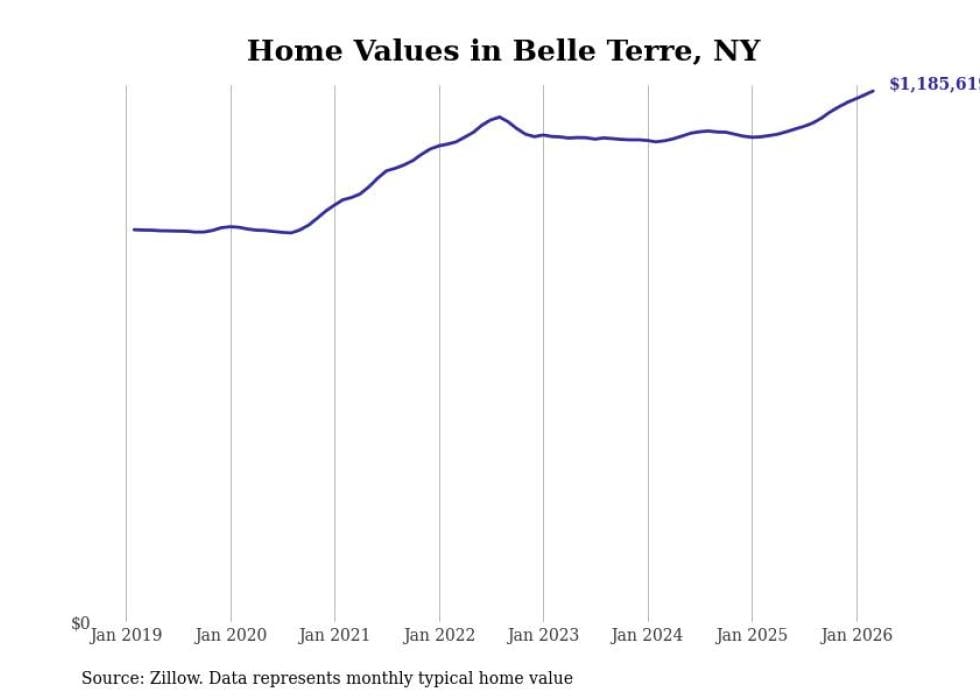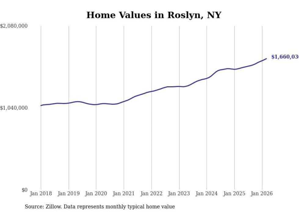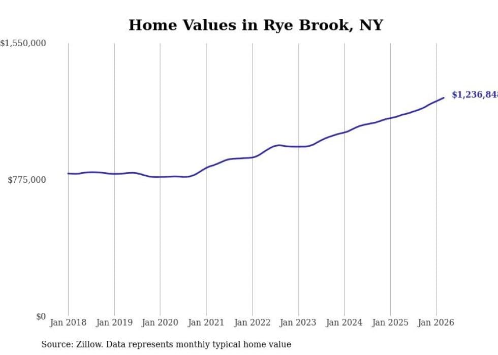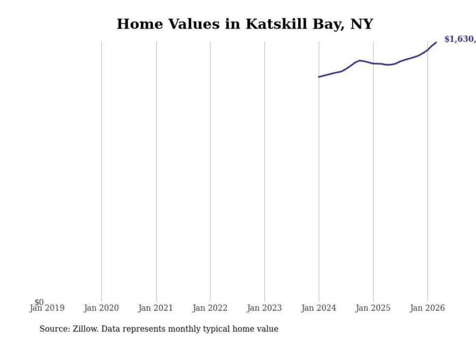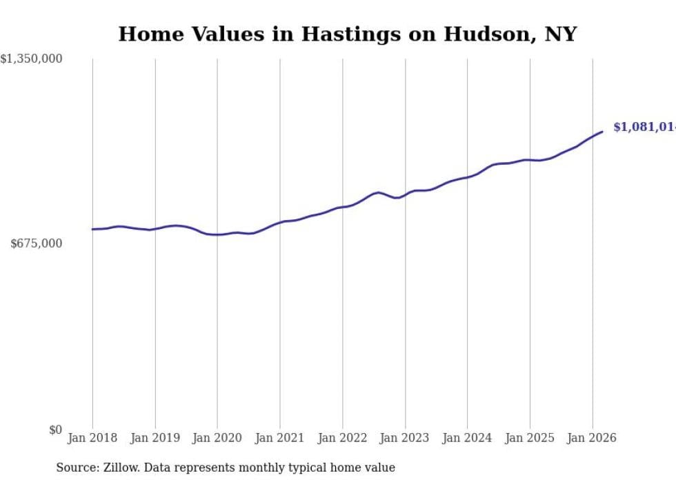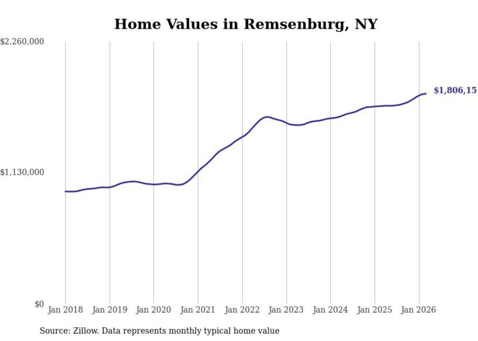 Stacker compiled a list of cities with the fastest-growing home prices in New York using data from Zillow. Cities are ranked by the dollar change in the Zillow Home Values Index for all homes from the 12 months ending March 2026. The charts in this story were created automatically using Matplotlib. Data was available for 50 cities and towns in New York.