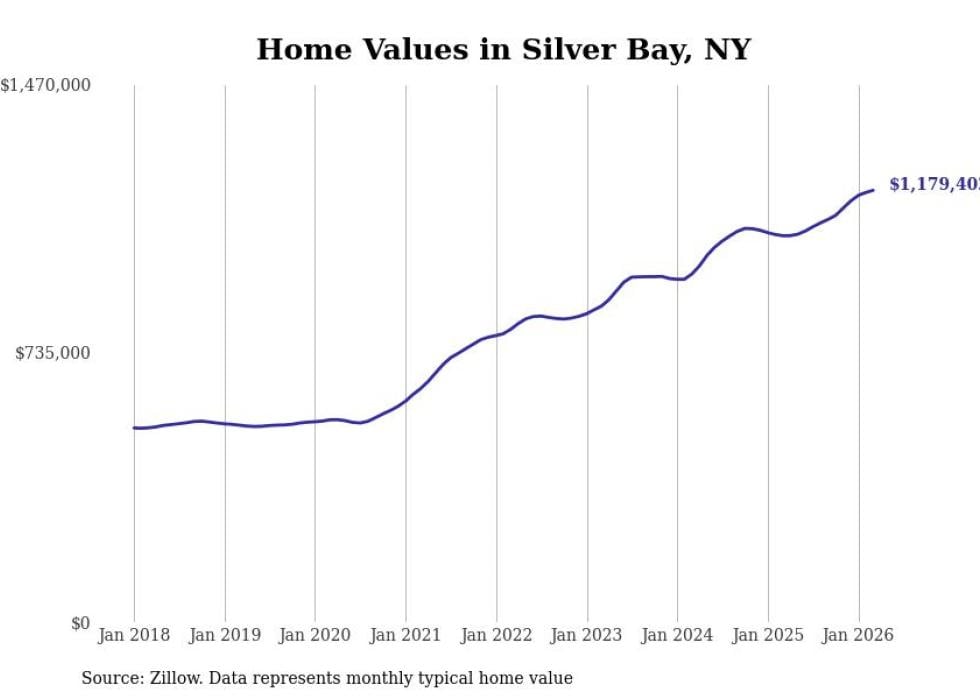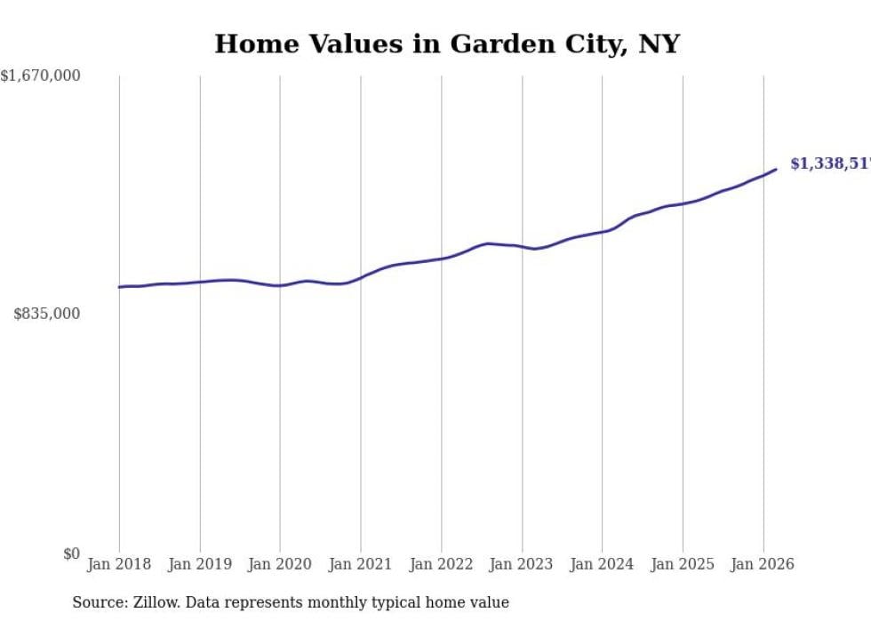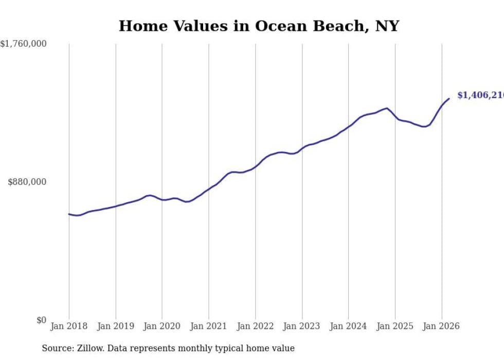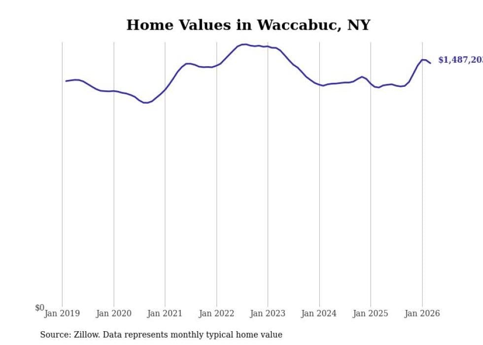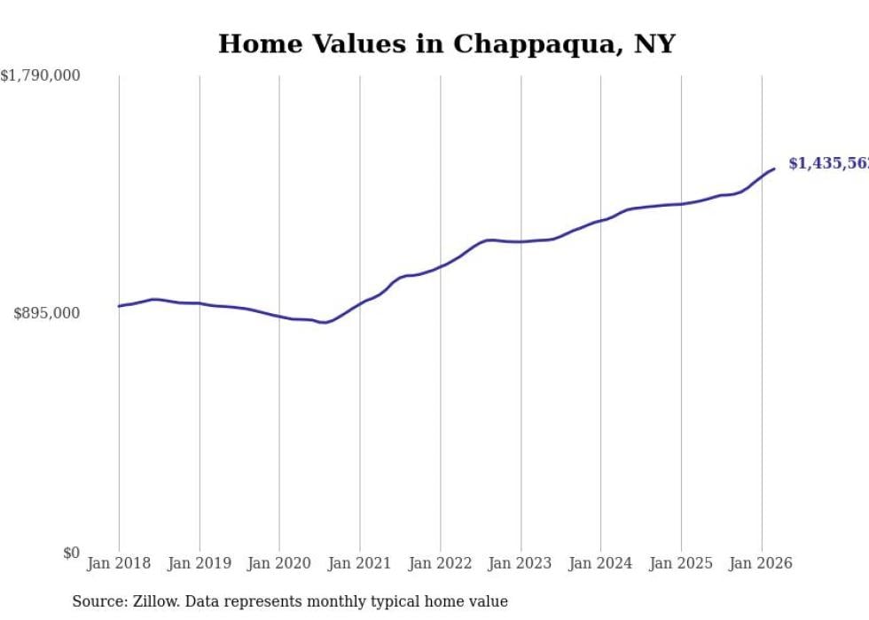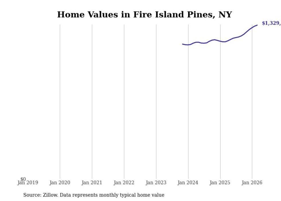 Stacker compiled a list of cities with the fastest-growing home prices in New York using data from Zillow. Cities are ranked by the dollar change in the Zillow Home Values Index for all homes from the 12 months ending March 2026. The charts in this story were created automatically using Matplotlib. Data was available for 50 cities and towns in New York.