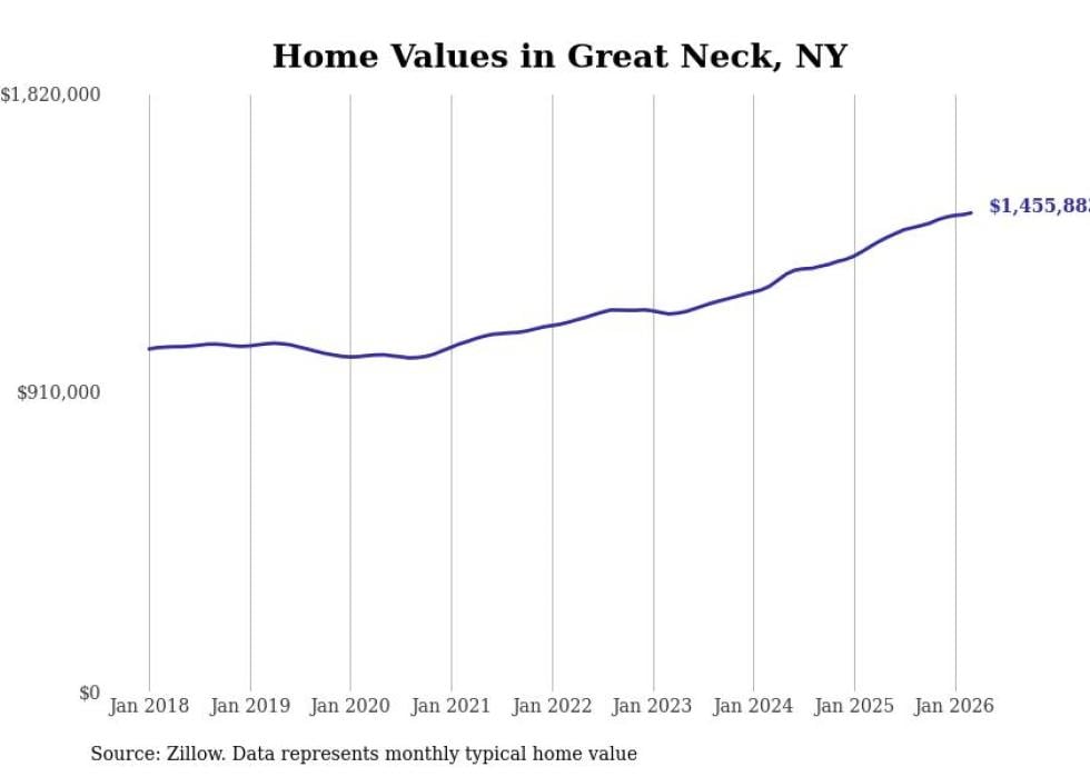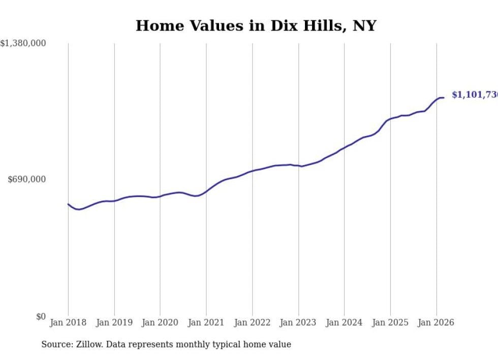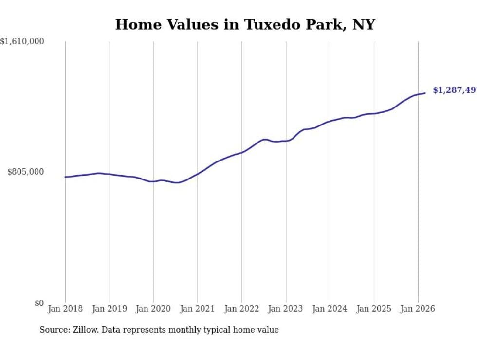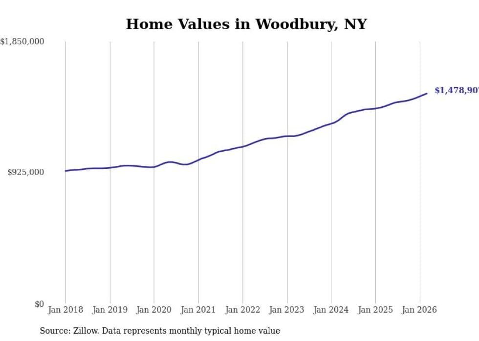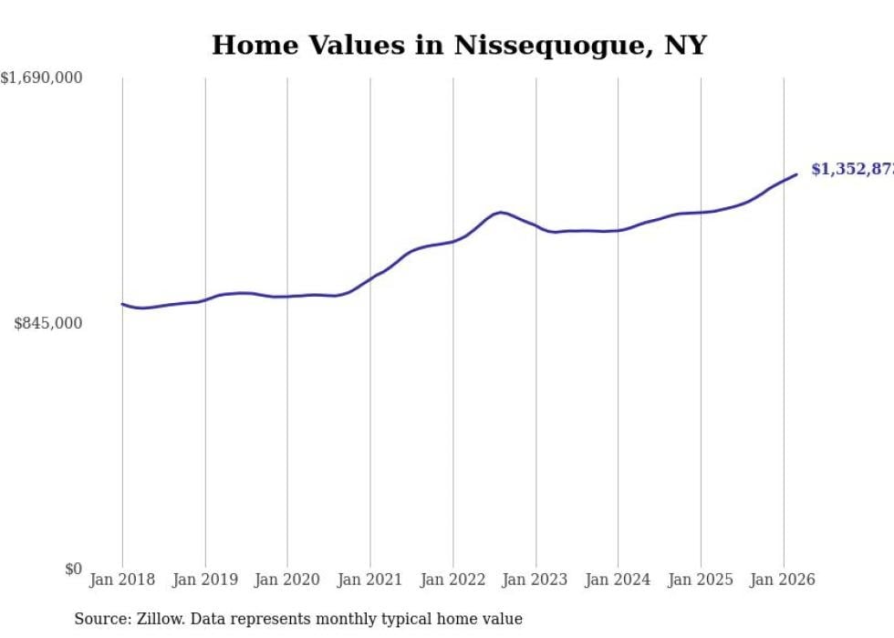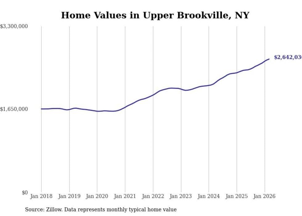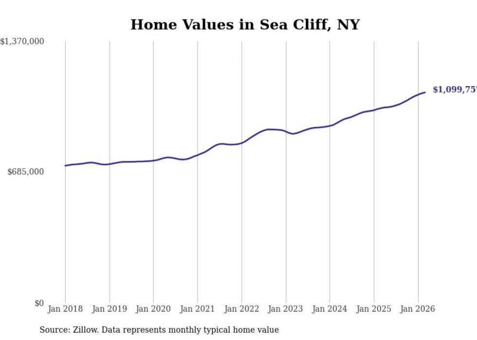 Stacker compiled a list of cities with the fastest-growing home prices in New York using data from Zillow. Cities are ranked by the dollar change in the Zillow Home Values Index for all homes from the 12 months ending March 2026. The charts in this story were created automatically using Matplotlib. Data was available for 50 cities and towns in New York.