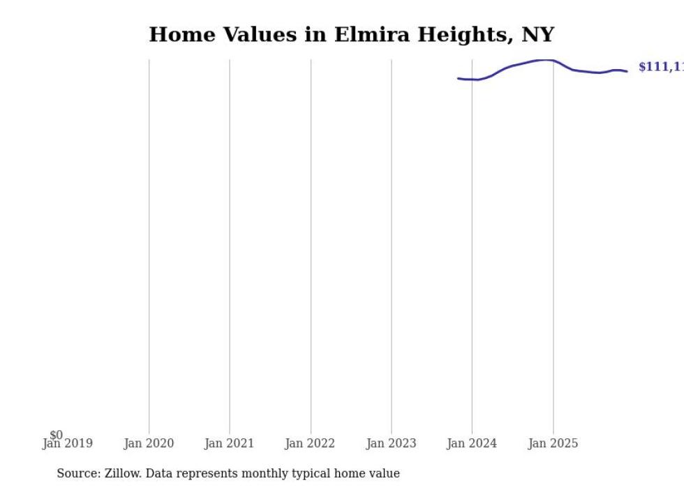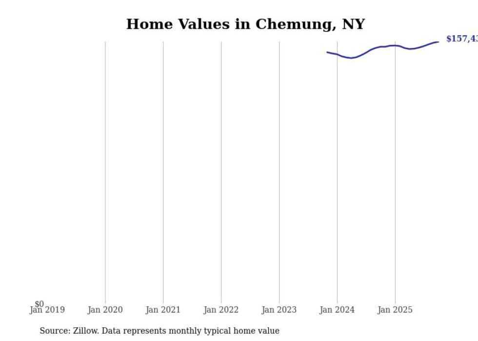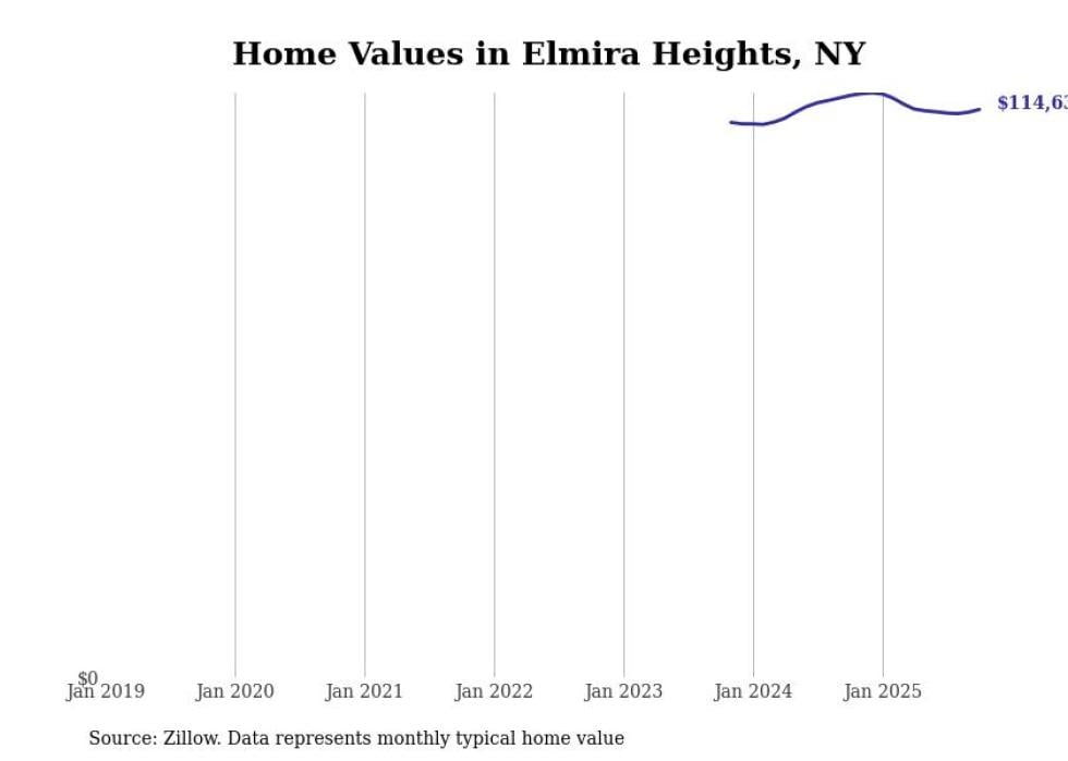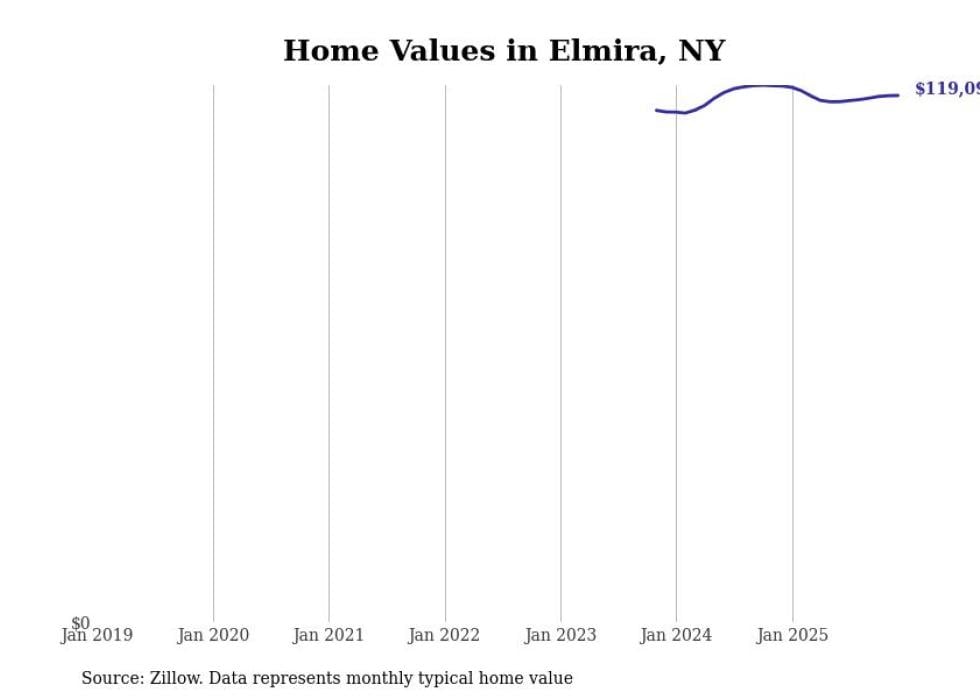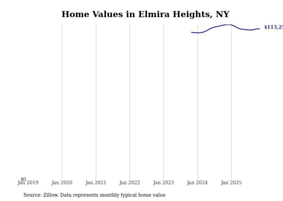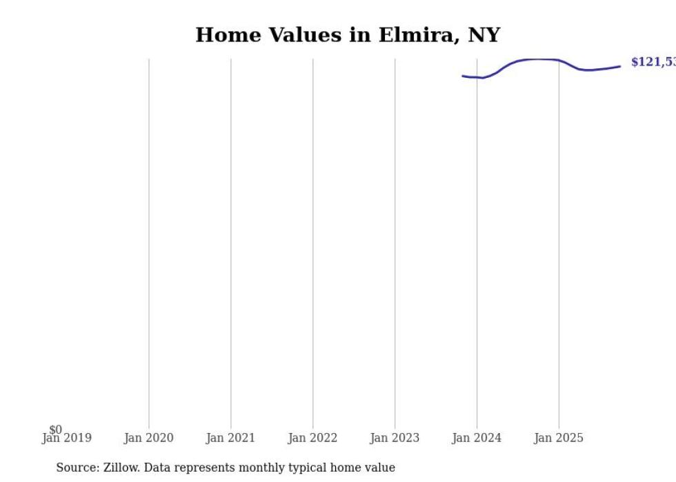 Stacker compiled a list of cities with the most expensive homes in the Elmira, NY metro area using data from Zillow. Charts show the monthly typical home value since January 2018.