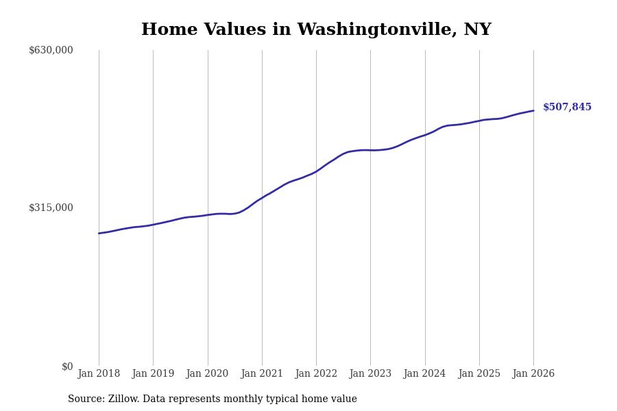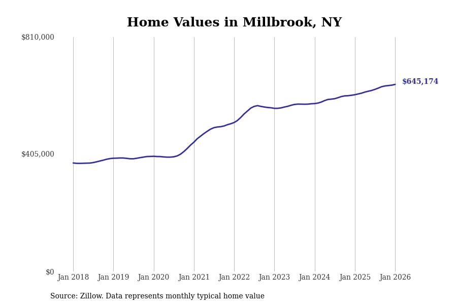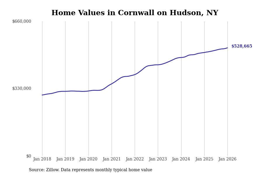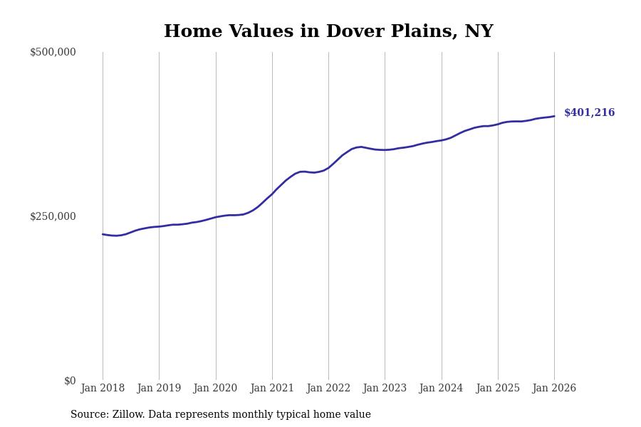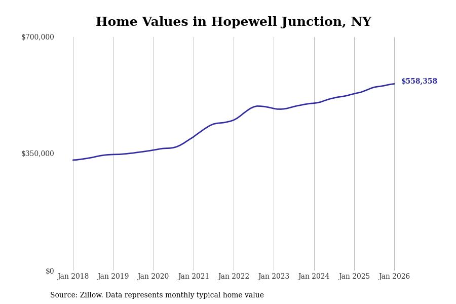 Stacker compiled a list of cities with the most expensive homes in the Poughkeepsie-Newburgh-Middletown, NY metro area using data from Zillow. Charts show the monthly typical home value since January 2018.