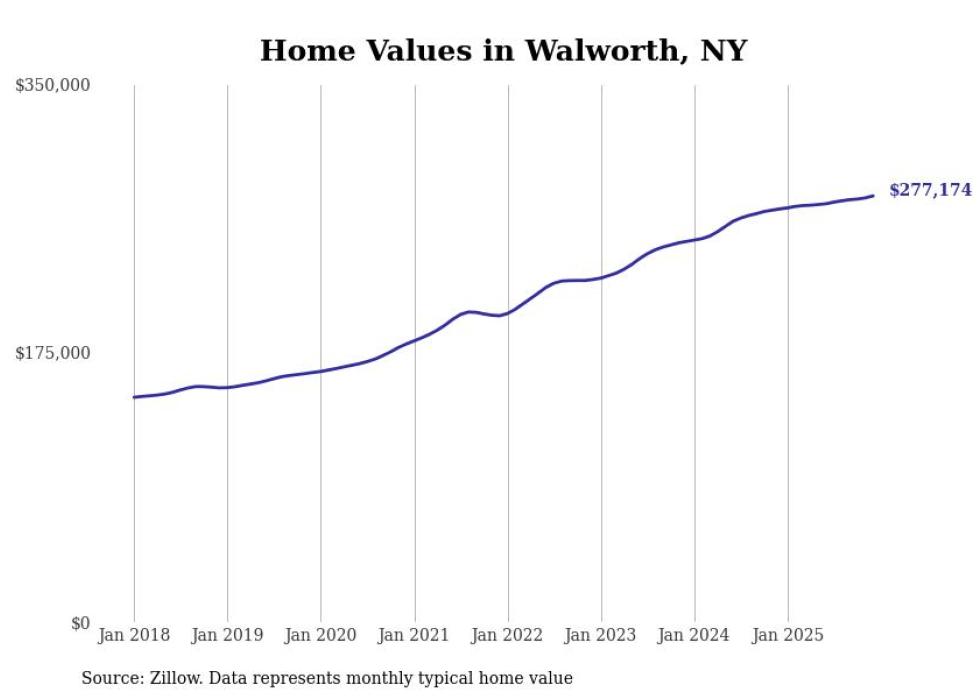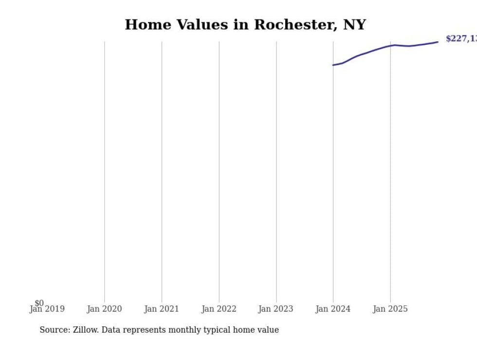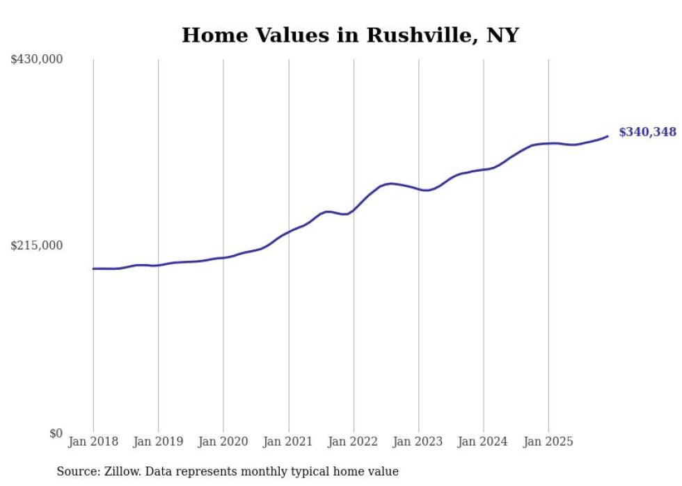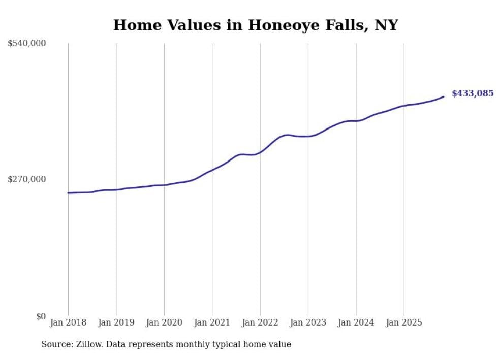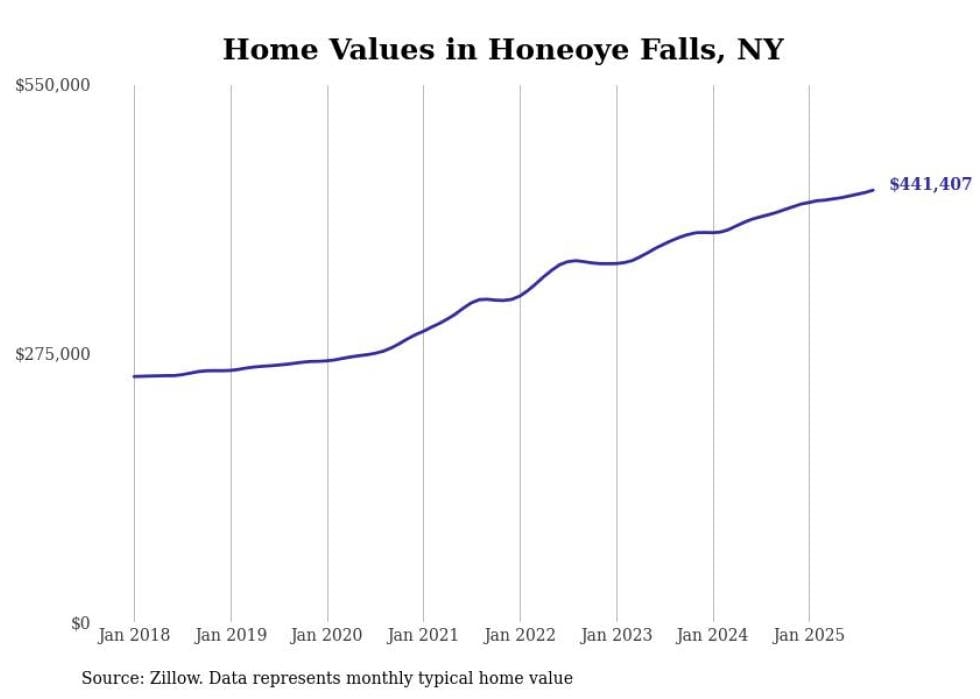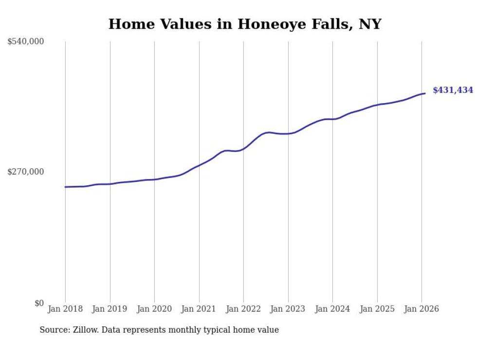 Stacker compiled a list of cities with the most expensive homes in the Rochester, NY metro area using data from Zillow. Charts show the monthly typical home value since January 2018.