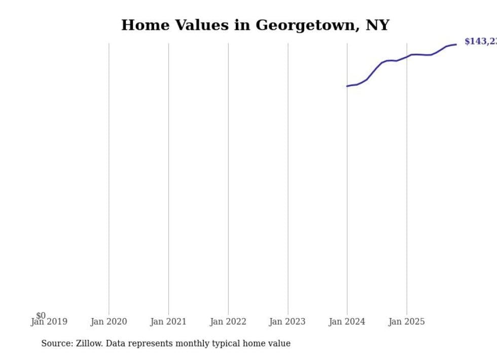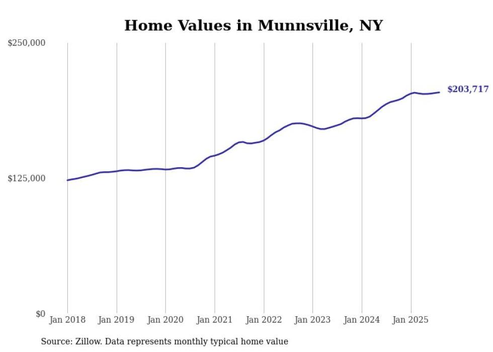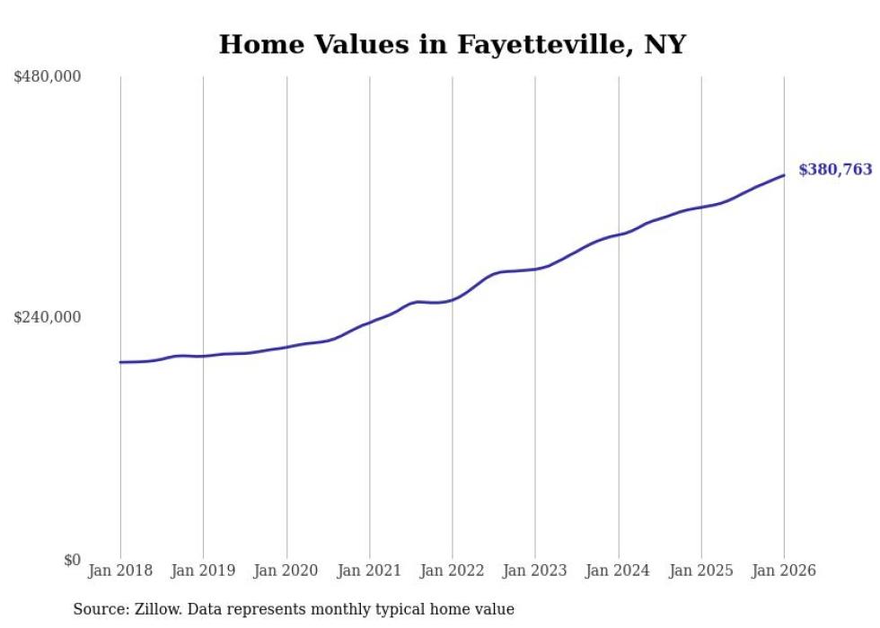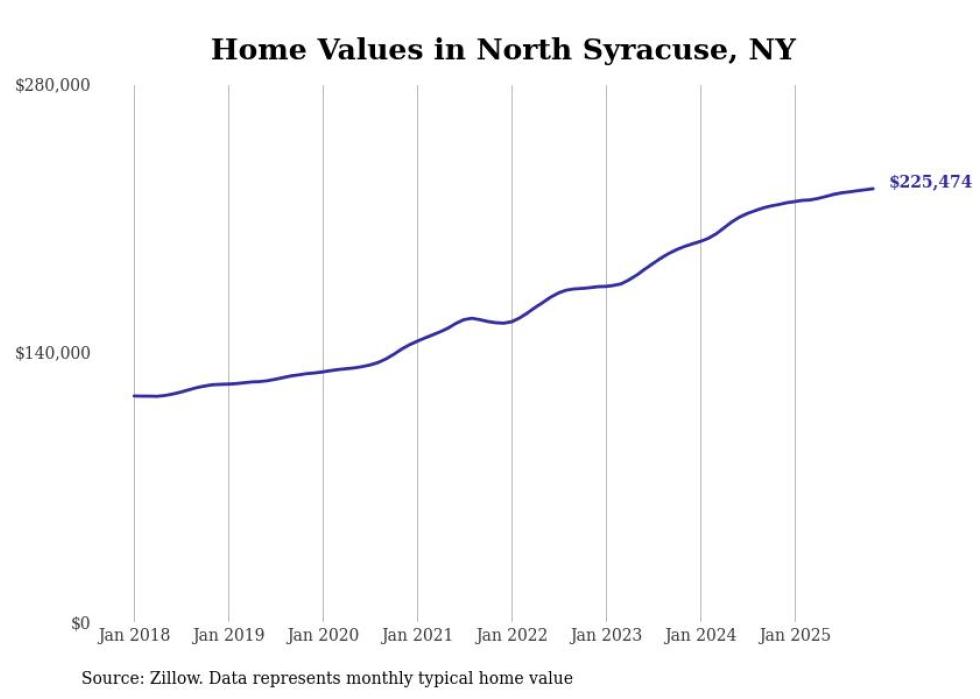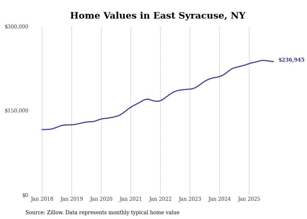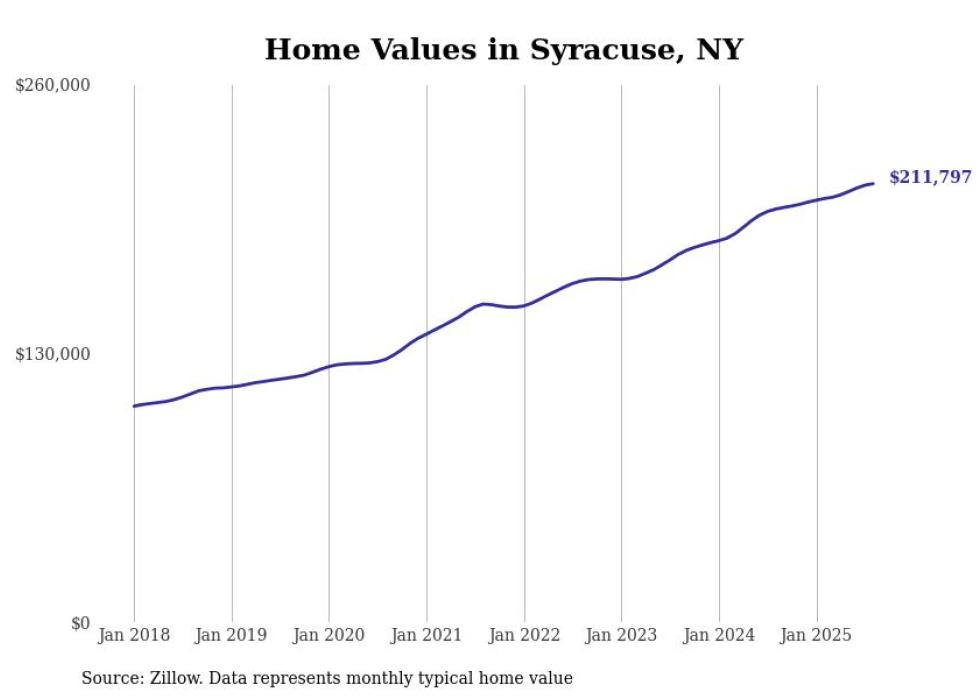 Stacker compiled a list of cities with the most expensive homes in the Syracuse, NY metro area using data from Zillow. Charts show the monthly typical home value since January 2018.