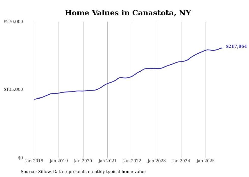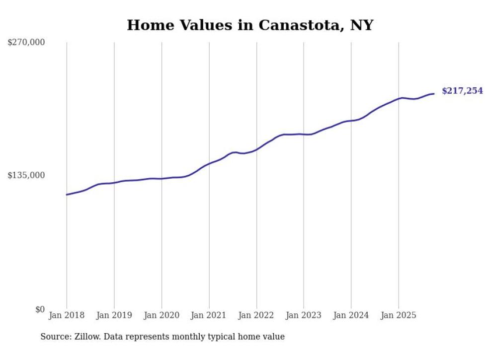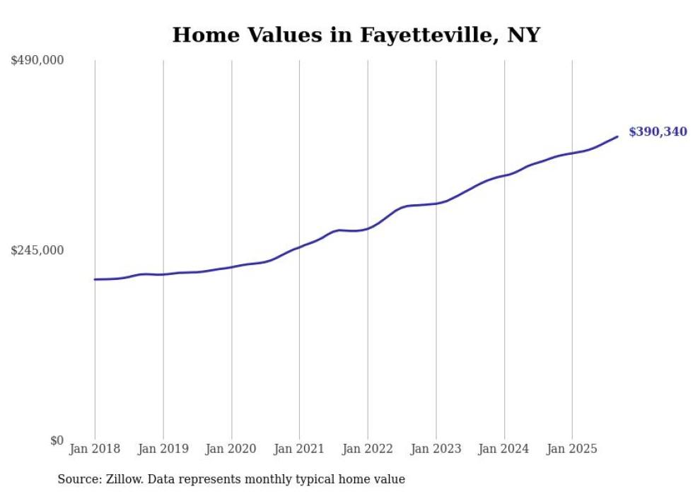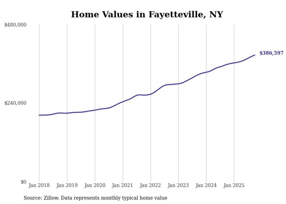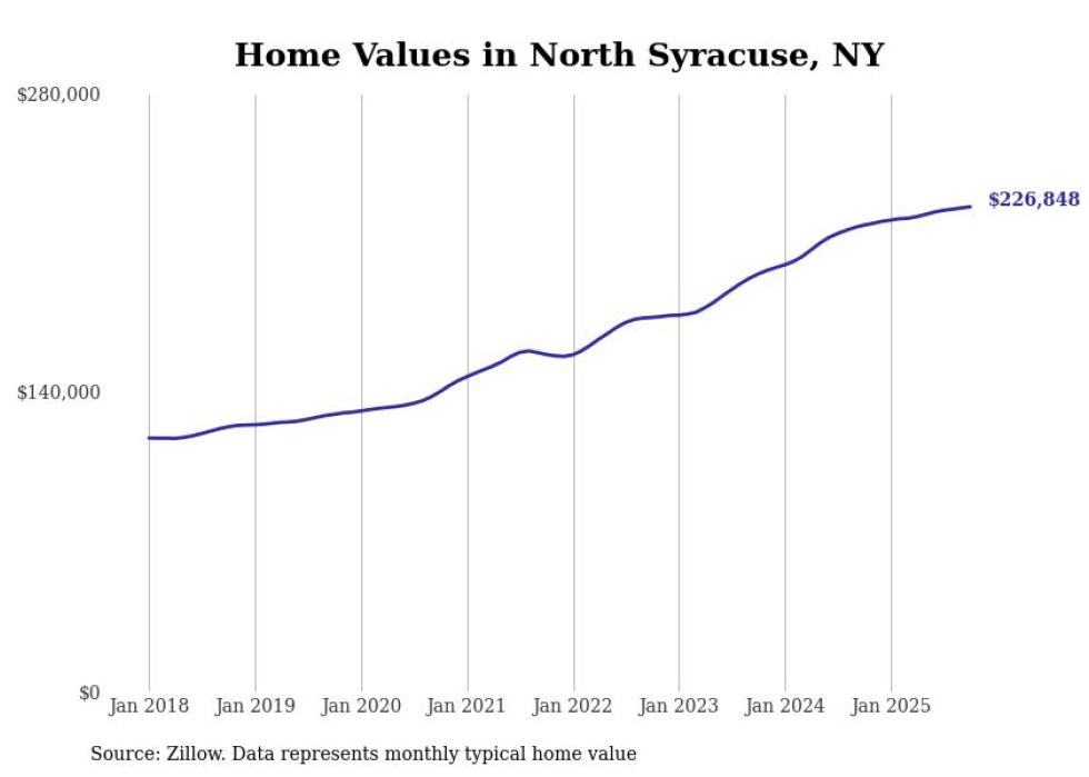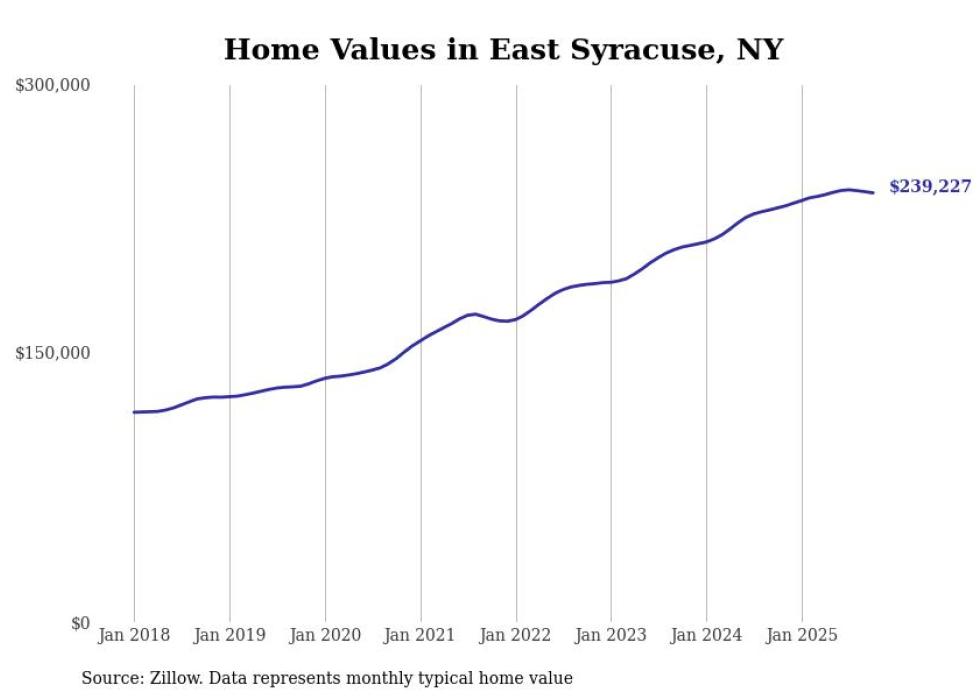 Stacker compiled a list of cities with the most expensive homes in the Syracuse metro area using data from Zillow. Charts show the monthly typical home value since January 2018. All 22 cities and towns with data available were included in the list.