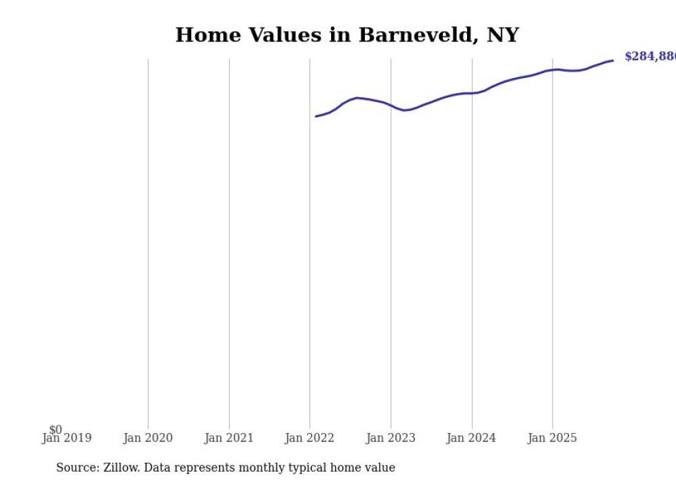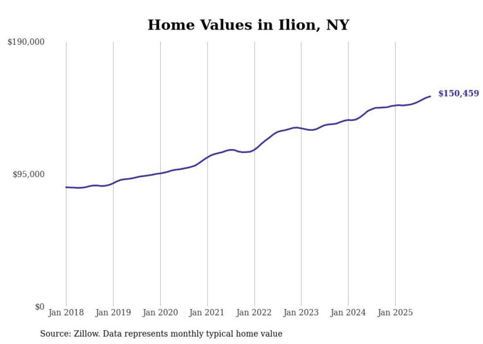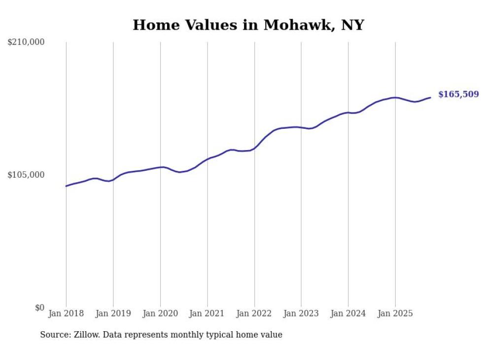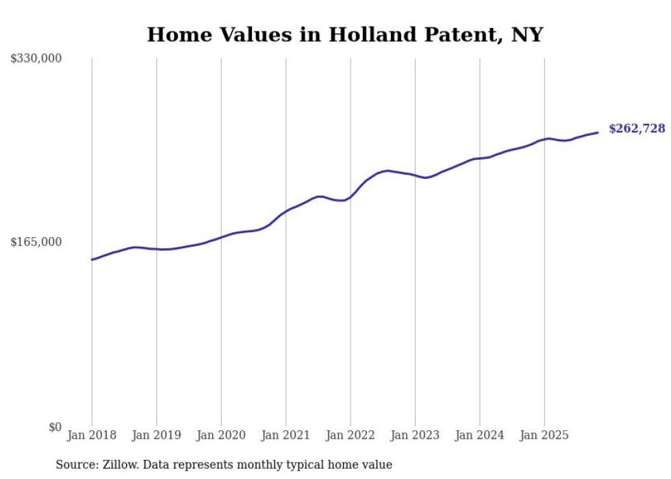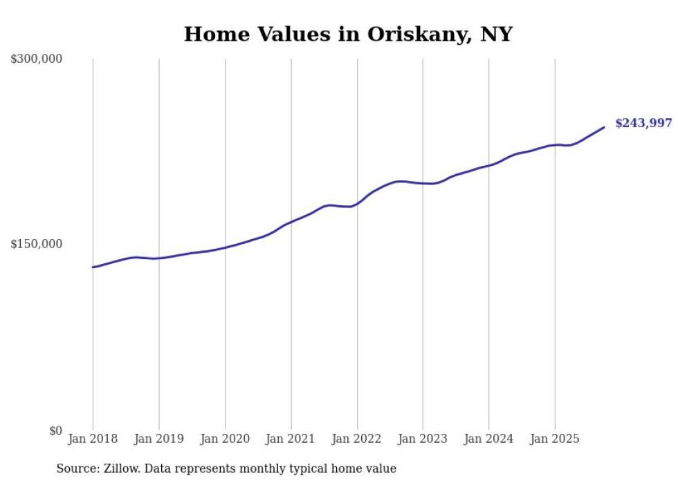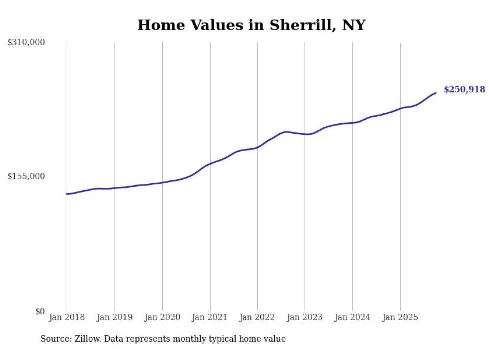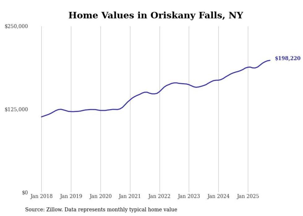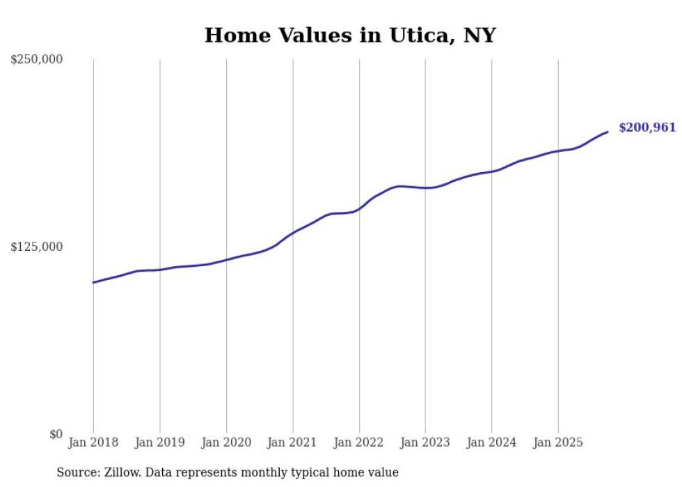 Stacker compiled a list of cities with the most expensive homes in the Utica-Rome, NY metro area using data from Zillow. Charts show the monthly typical home value since January 2018.