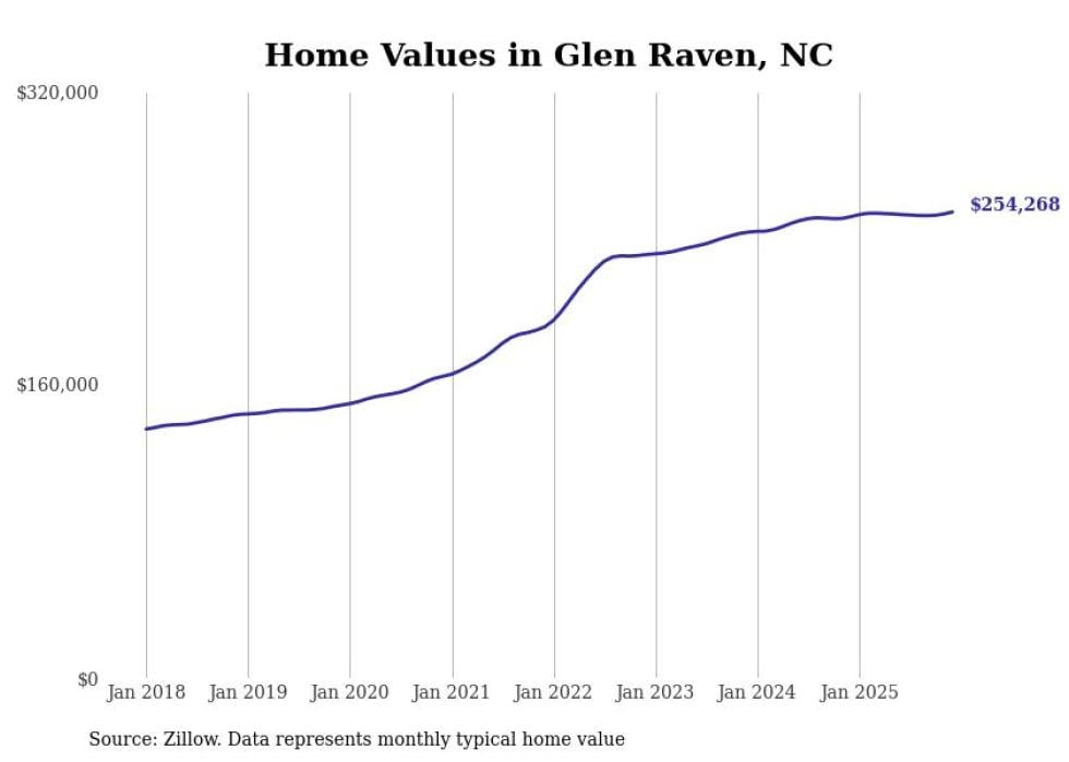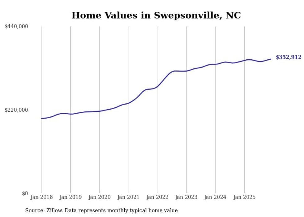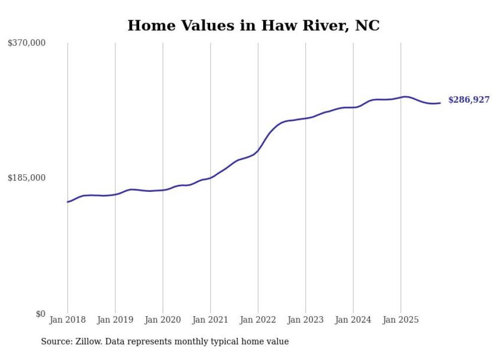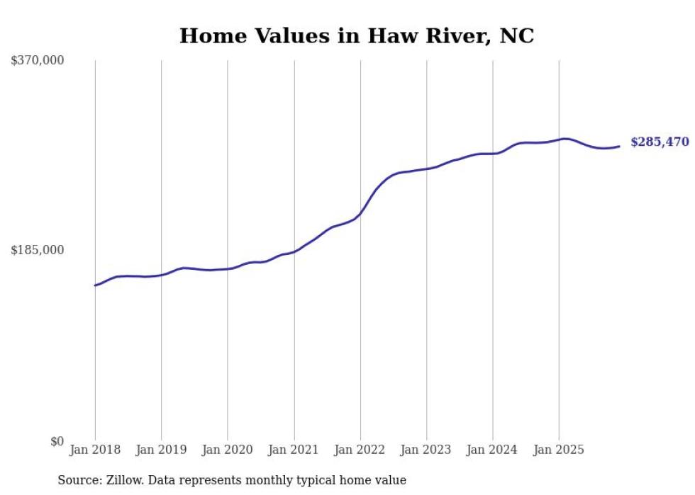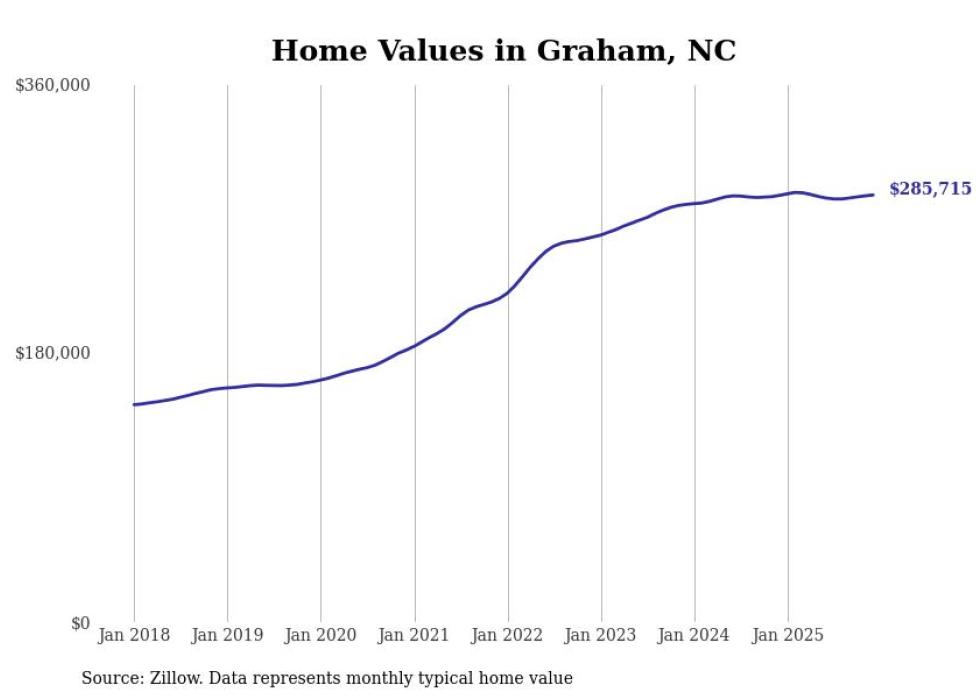 Stacker compiled a list of cities with the most expensive homes in the Burlington, North Carolina metro area using data from Zillow. Charts show the monthly typical home value since January 2018. All 8 cities and towns with data available were included in the list.
