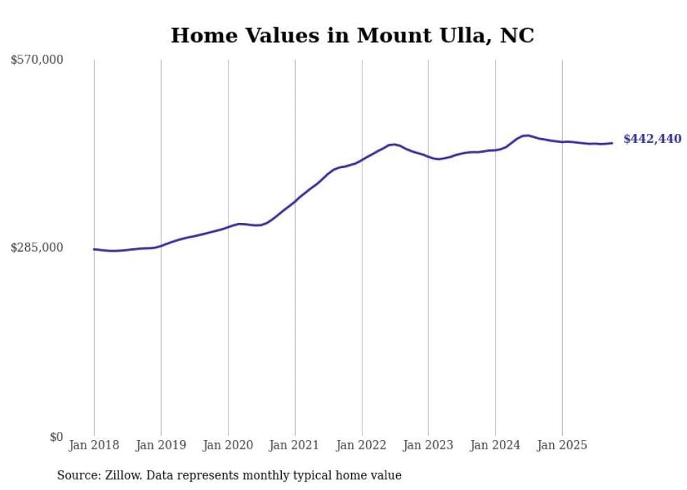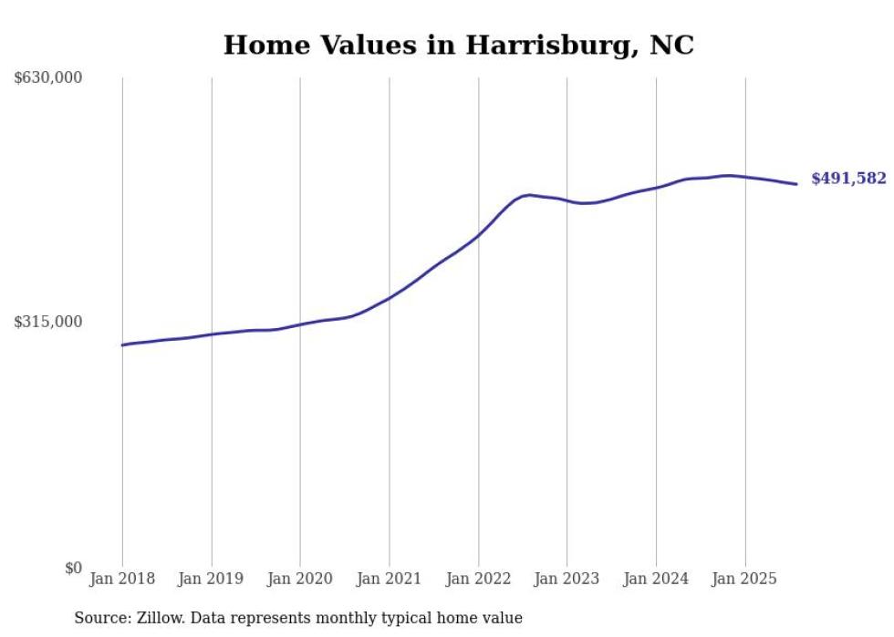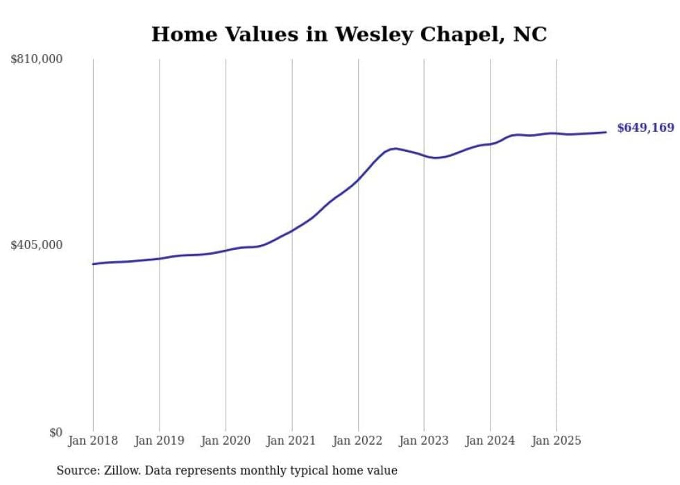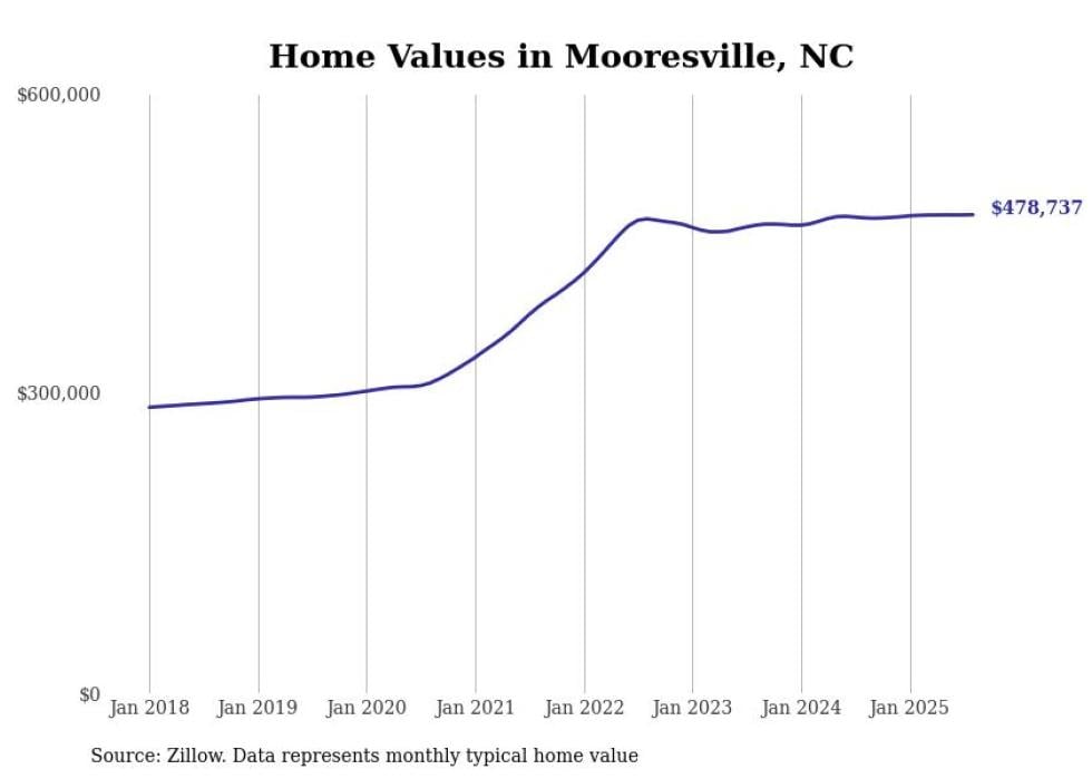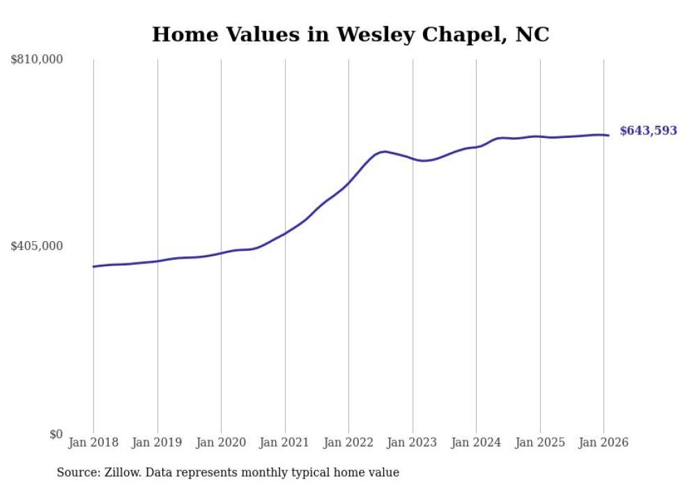 Stacker compiled a list of cities with the most expensive homes in the Charlotte metro area using data from Zillow. Charts show the monthly typical home value since January 2018. Data was available for 86 cities and towns.