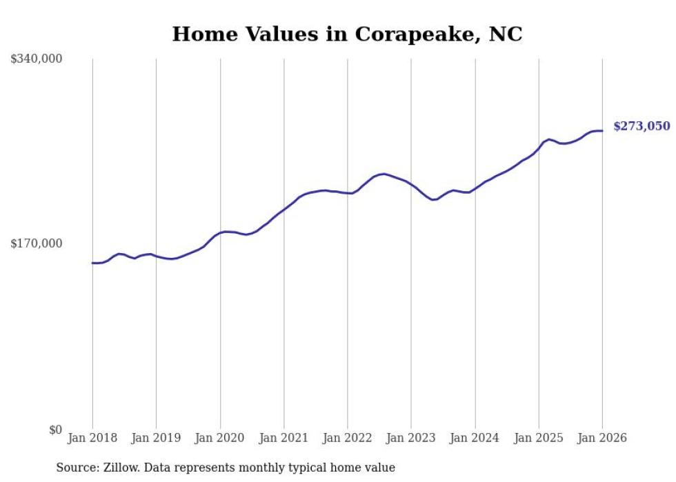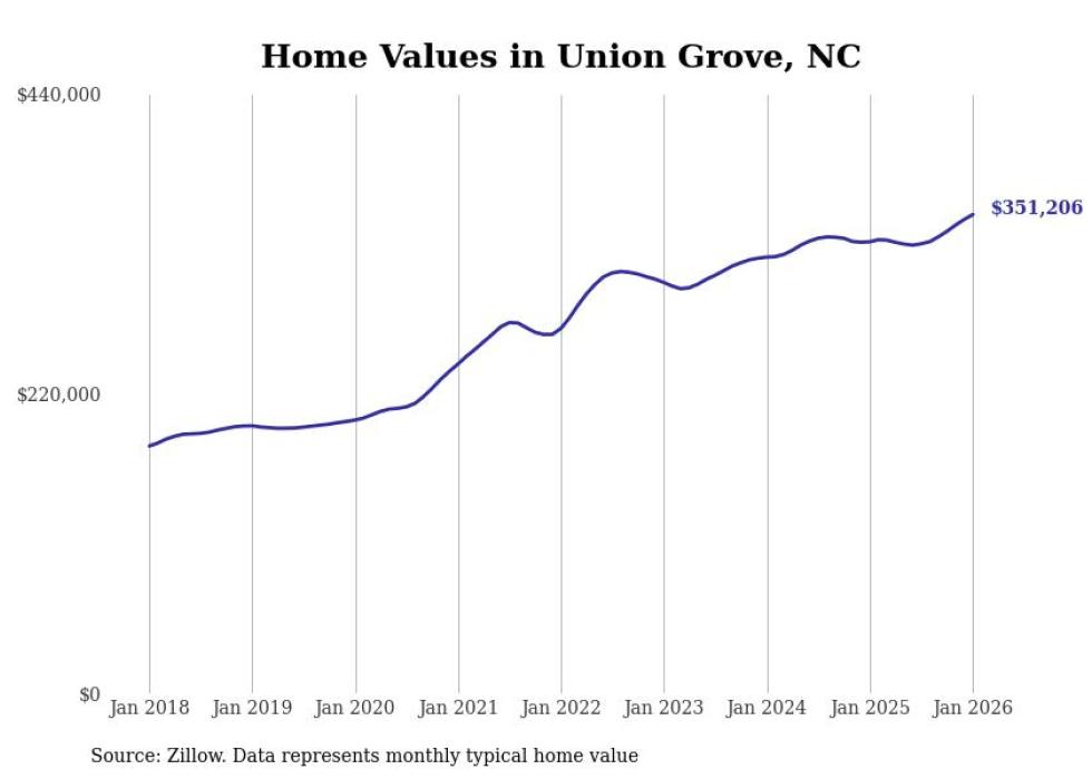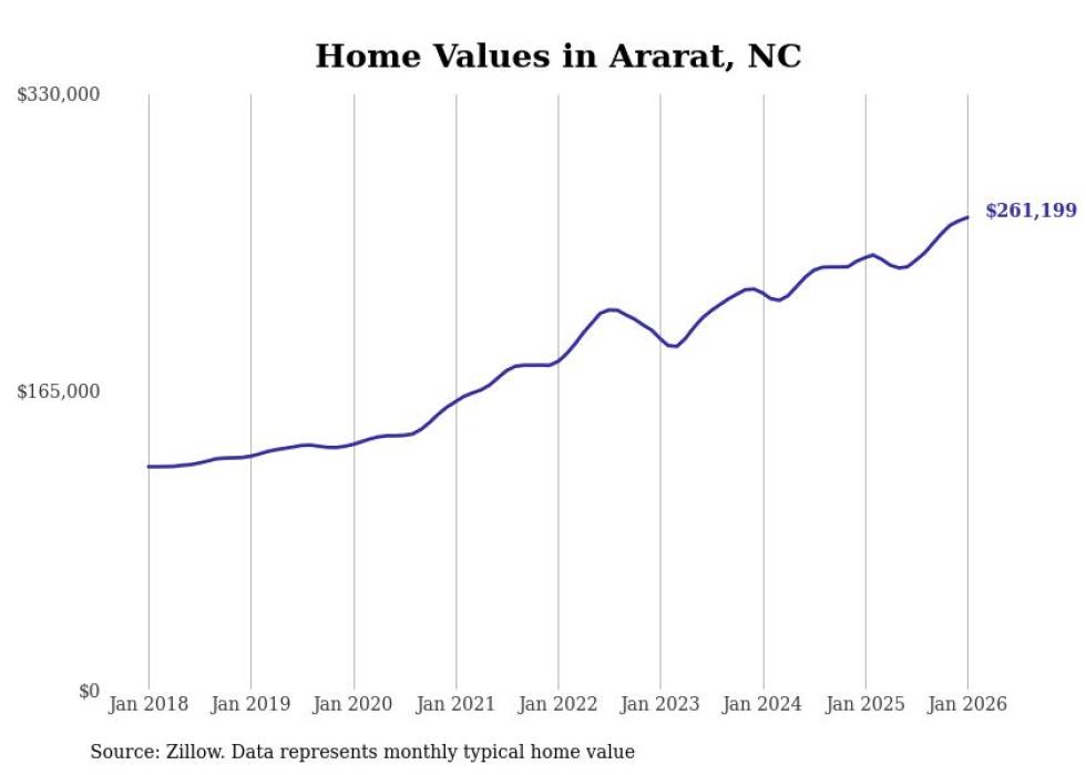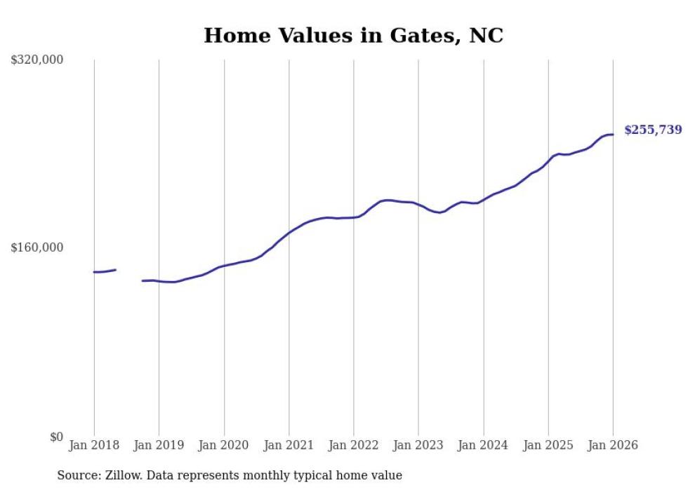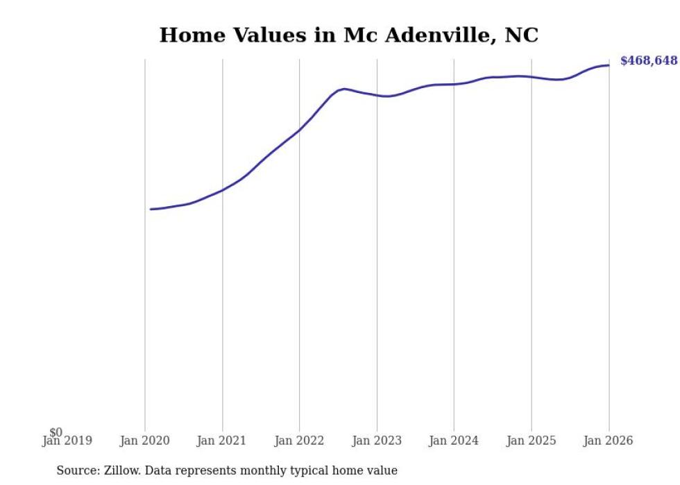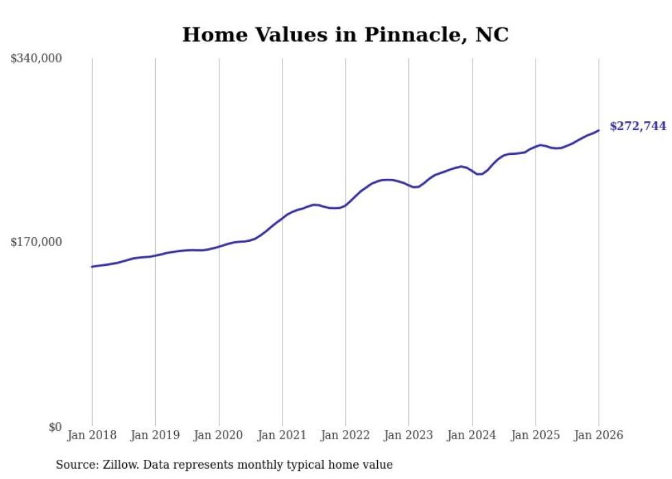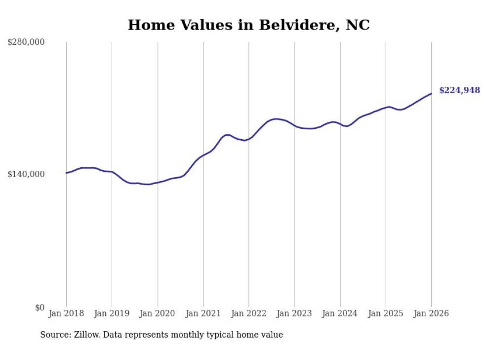 Stacker compiled a list of cities with the fastest-growing home prices in North Carolina using data from Zillow. Cities are ranked by the dollar change in the Zillow Home Values Index for all homes from the 12 months ending January 2026. The charts in this story were created automatically using Matplotlib. Data was available for 50 cities and towns in North Carolina.
