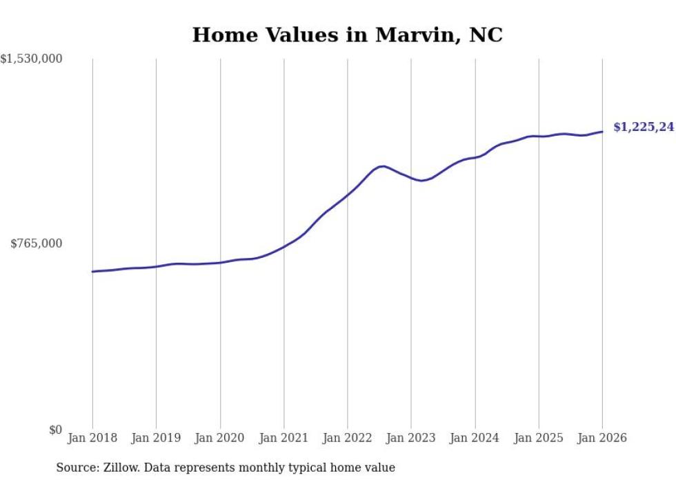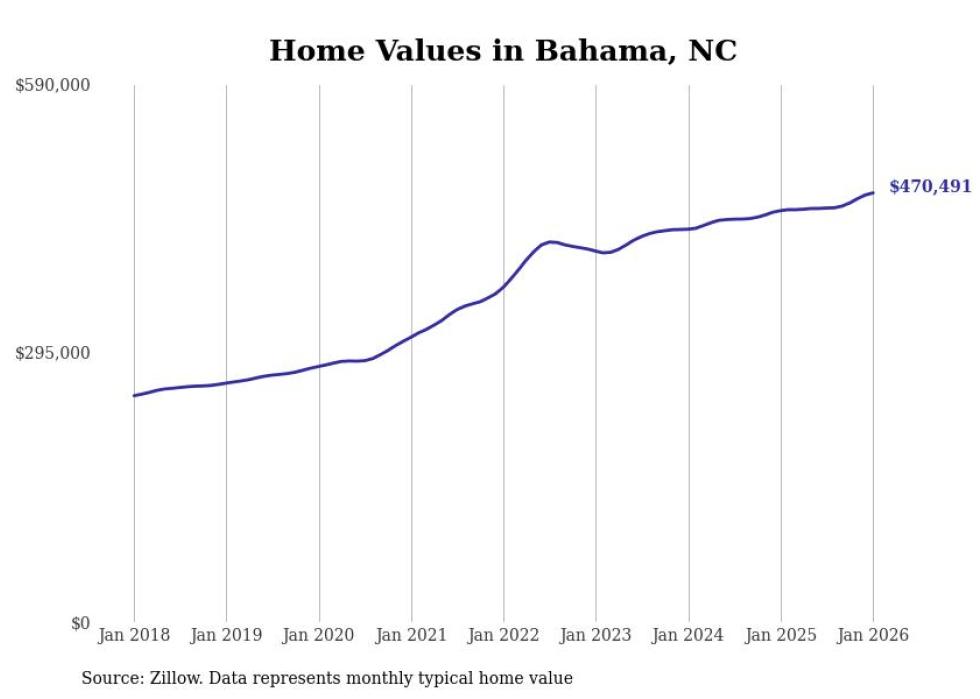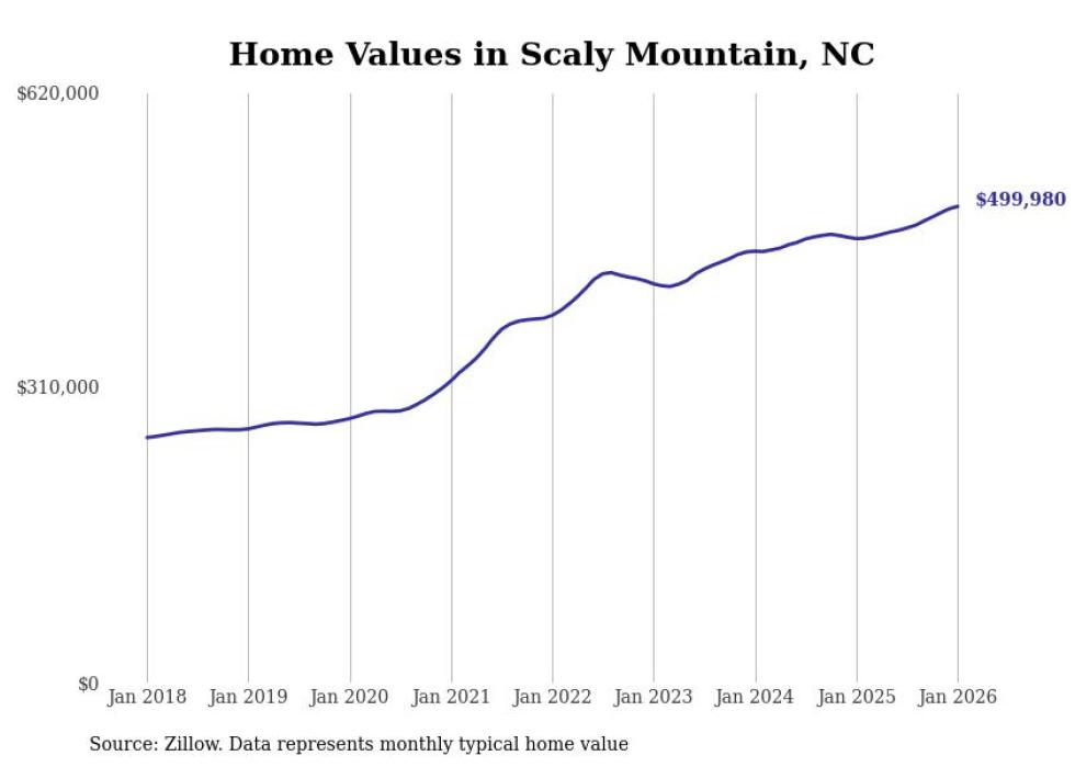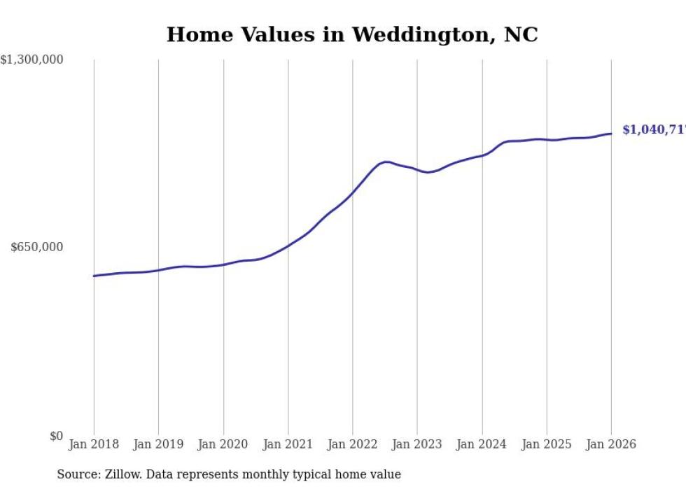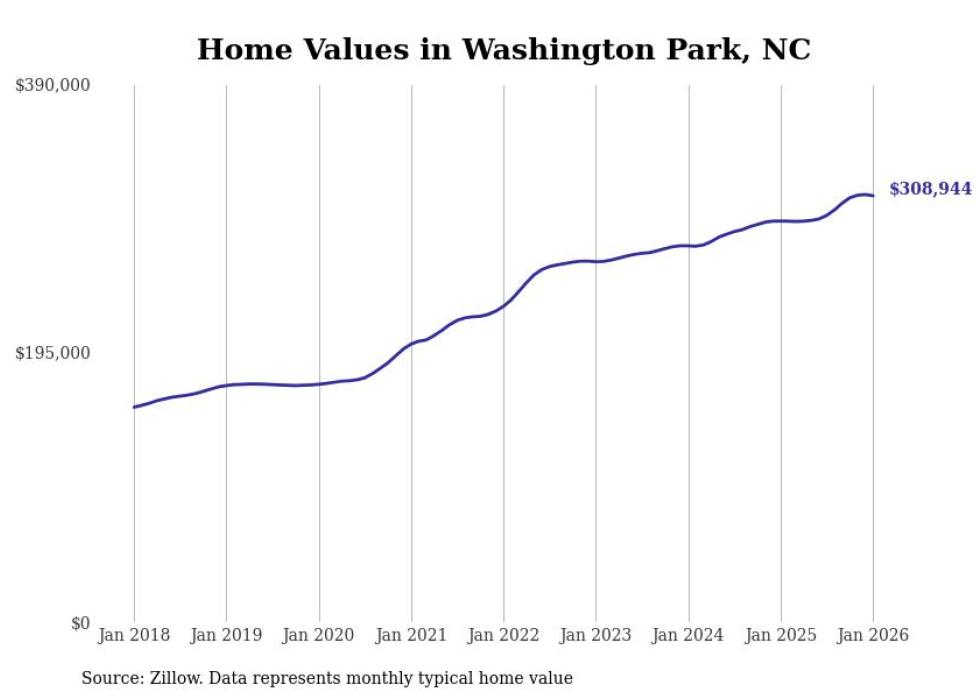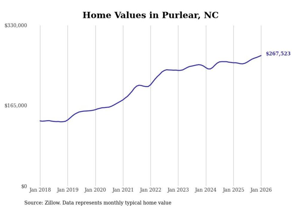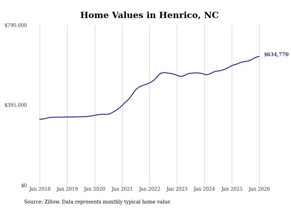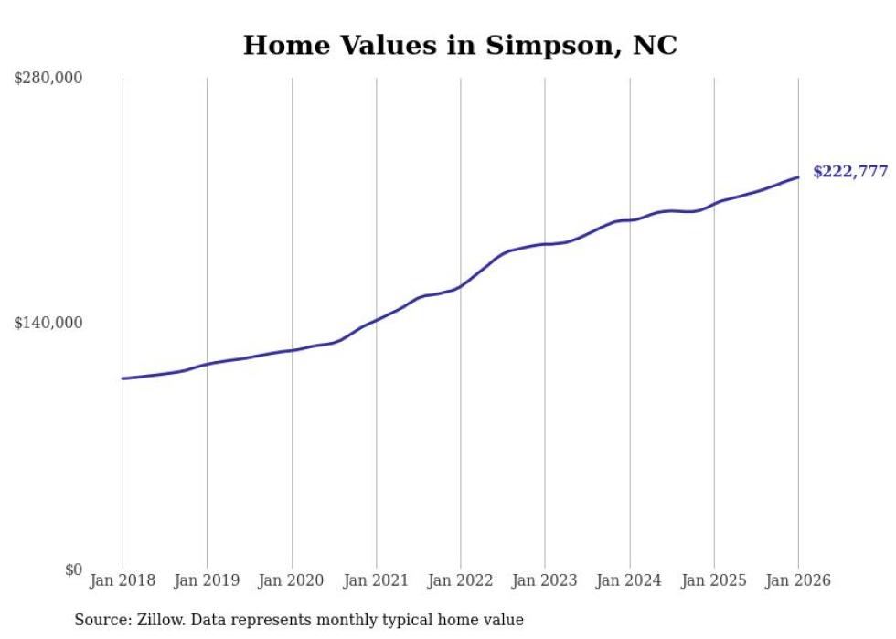 Stacker compiled a list of cities with the fastest-growing home prices in North Carolina using data from Zillow. Cities are ranked by the dollar change in the Zillow Home Values Index for all homes from the 12 months ending January 2026. The charts in this story were created automatically using Matplotlib. Data was available for 50 cities and towns in North Carolina.