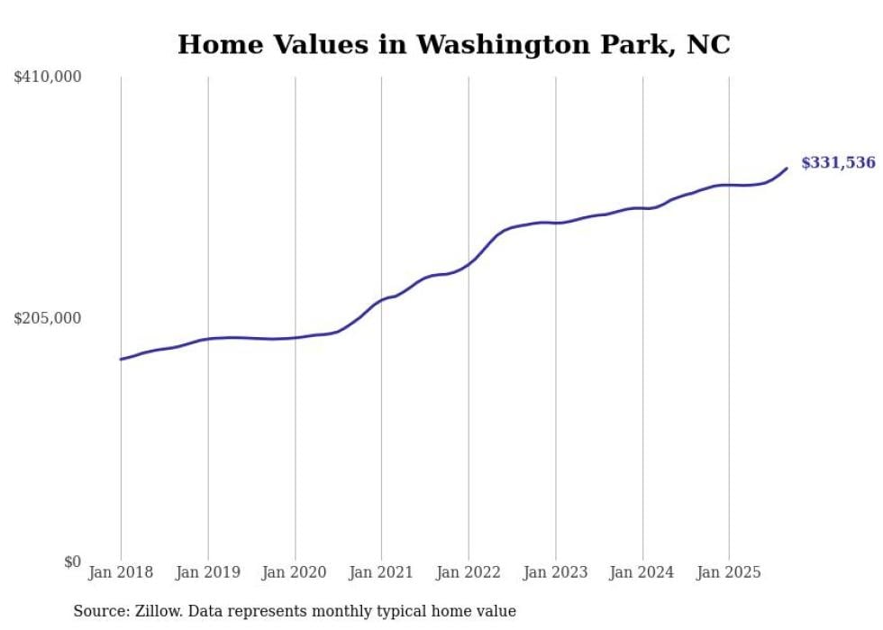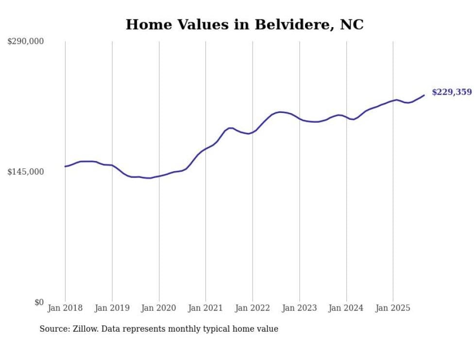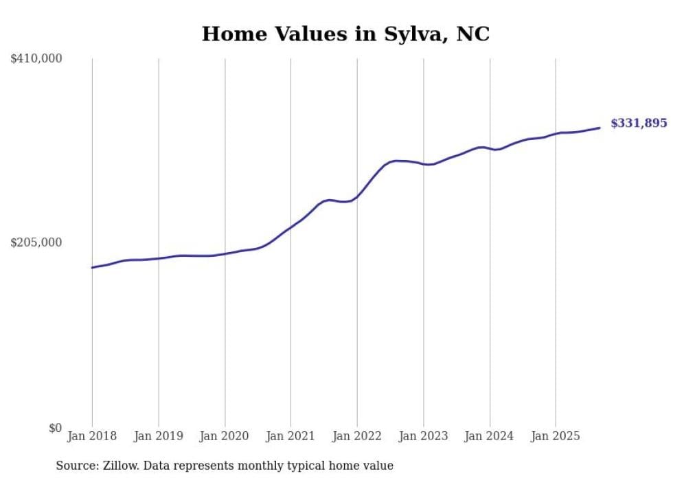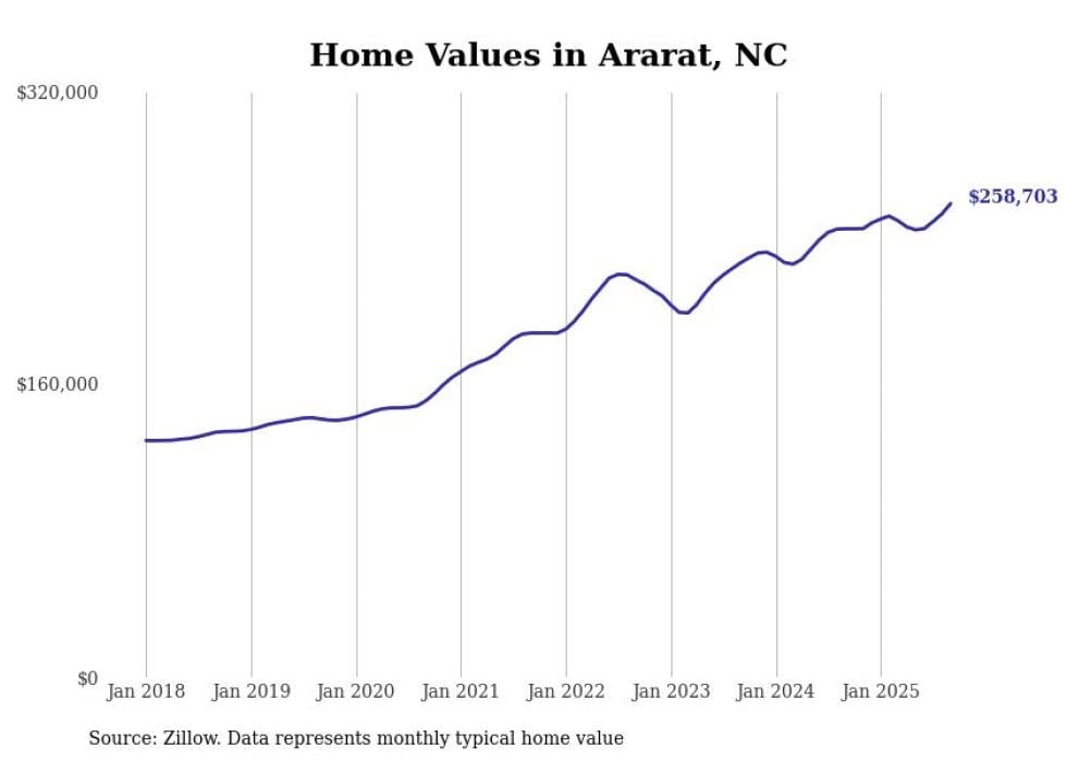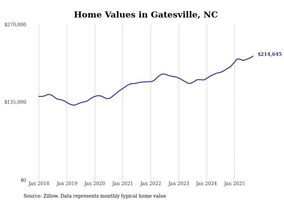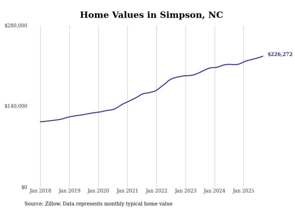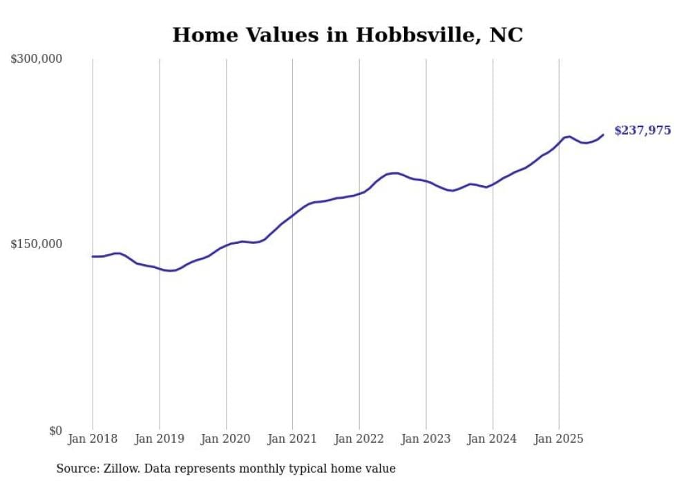 Stacker compiled a list of cities with the fastest-growing home prices in North Carolina using data from Zillow. Cities are ranked by the dollar change in the Zillow Home Values Index for all homes from the 12 months ending September 2025. The charts in this story were created automatically using Matplotlib. Data was available for 50 cities and towns in North Carolina.