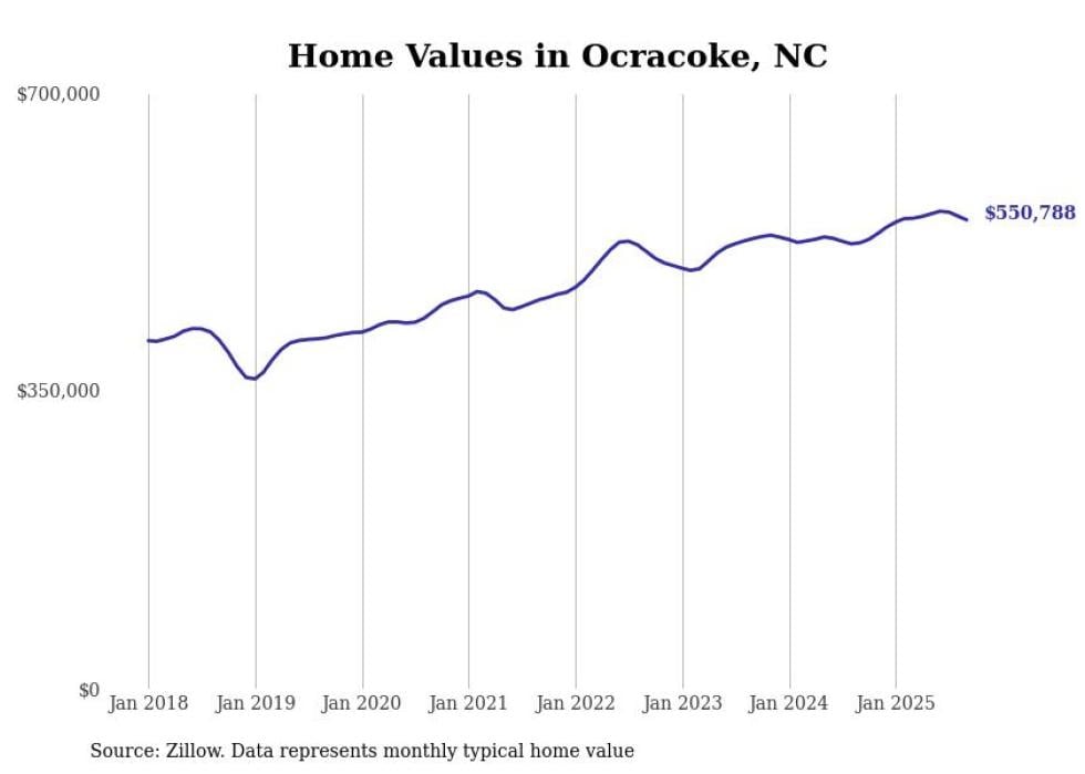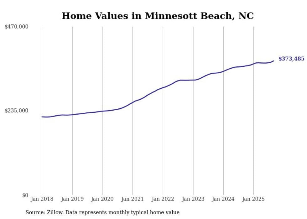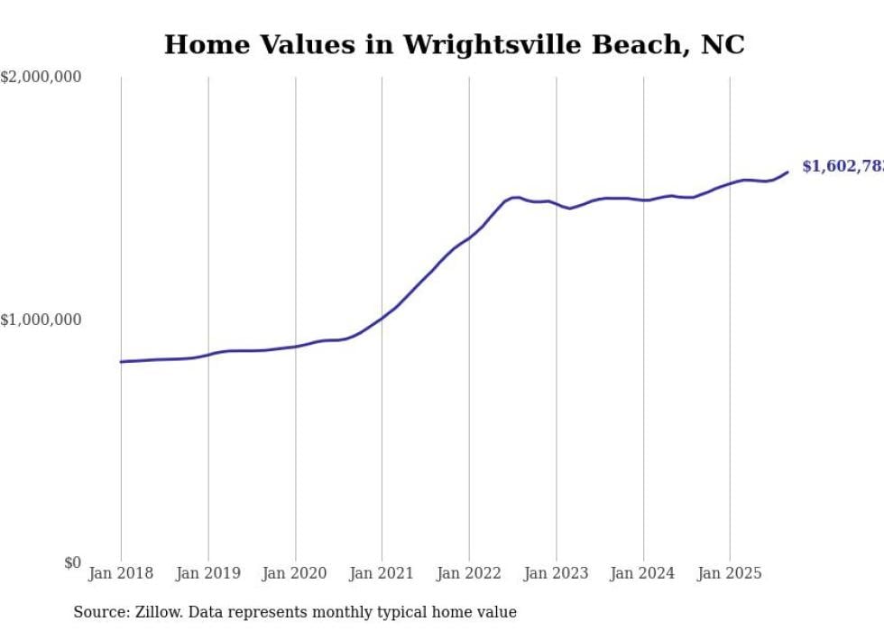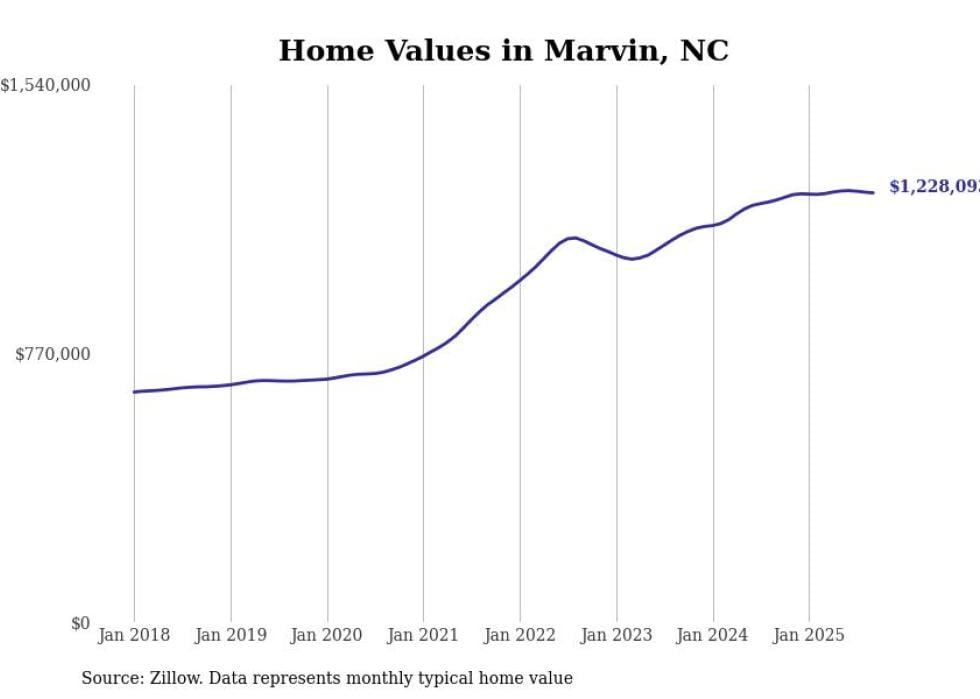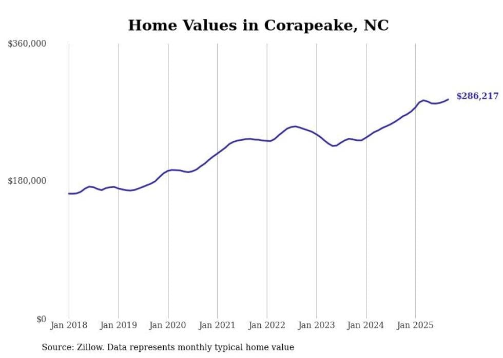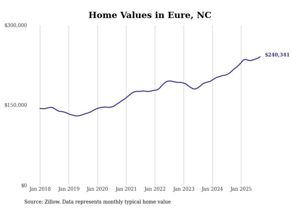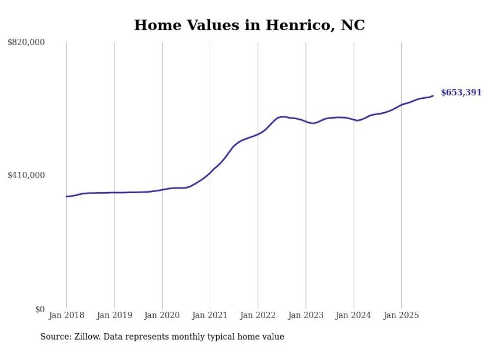 Stacker compiled a list of cities with the fastest-growing home prices in North Carolina using data from Zillow. Cities are ranked by the dollar change in the Zillow Home Values Index for all homes from the 12 months ending September 2025. The charts in this story were created automatically using Matplotlib. Data was available for 50 cities and towns in North Carolina.