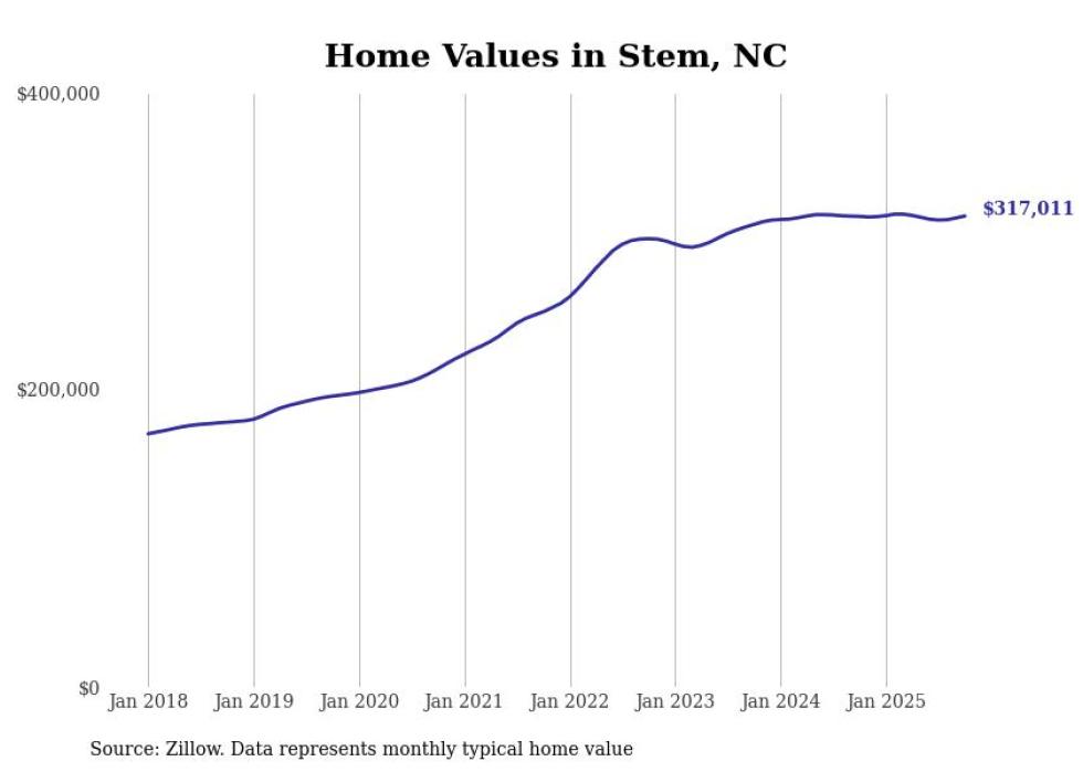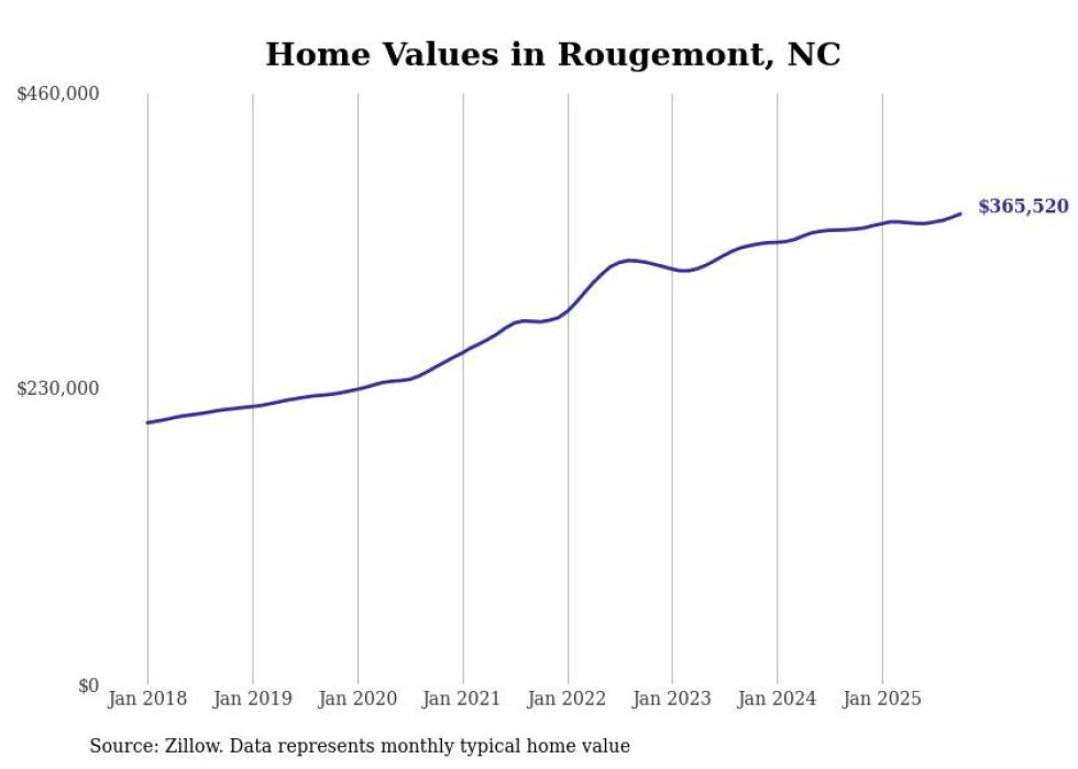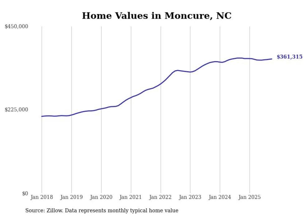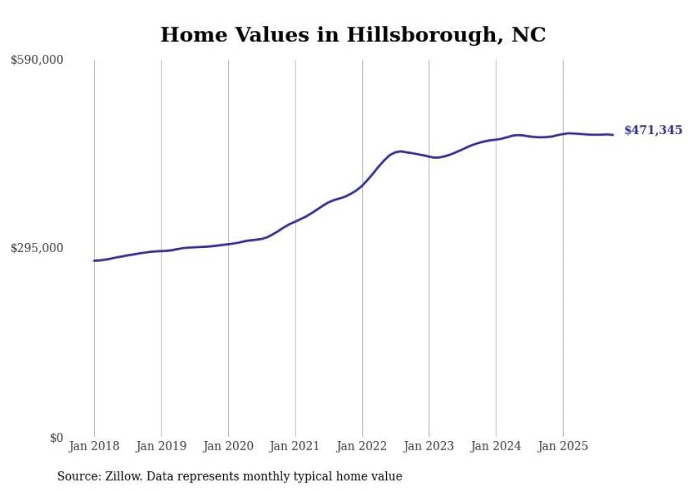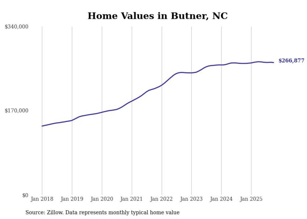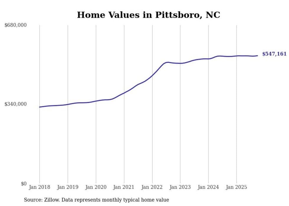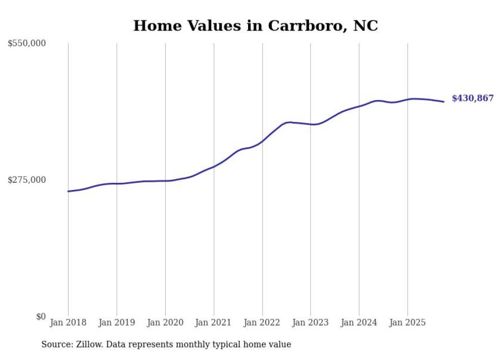 Stacker compiled a list of cities with the most expensive homes in the Durham-Chapel Hill, NC metro area using data from Zillow. Charts show the monthly typical home value since January 2018.