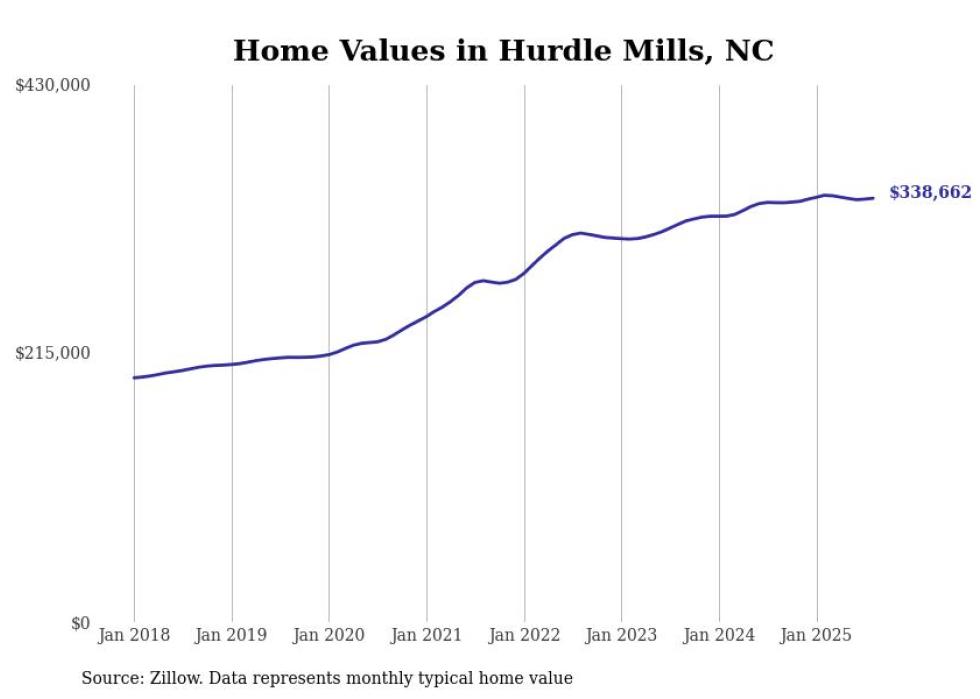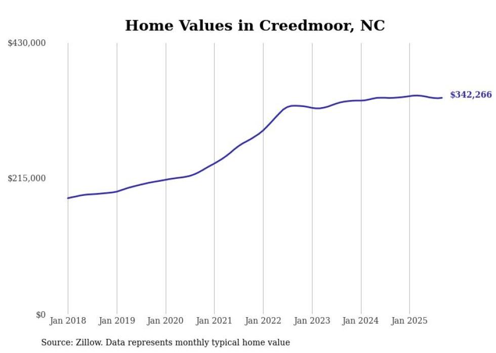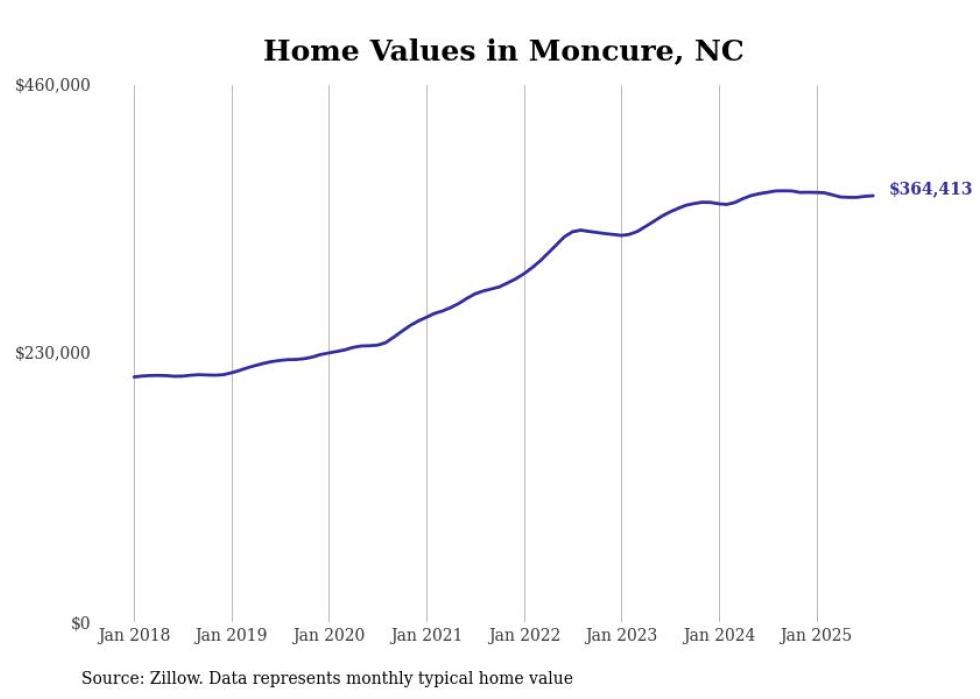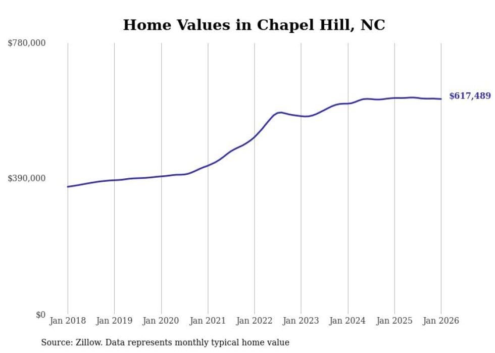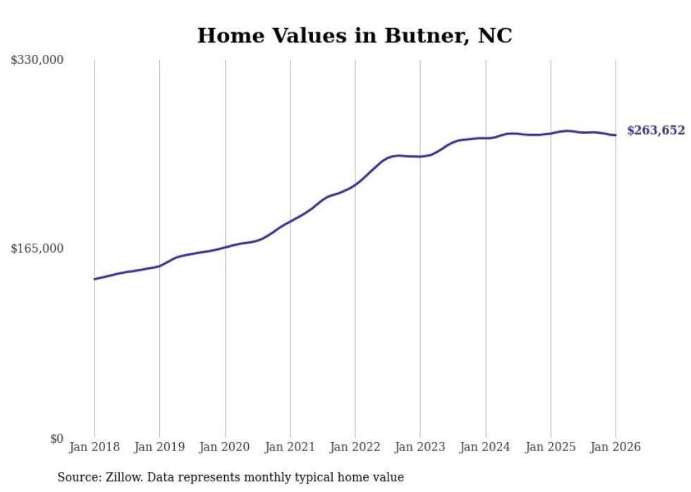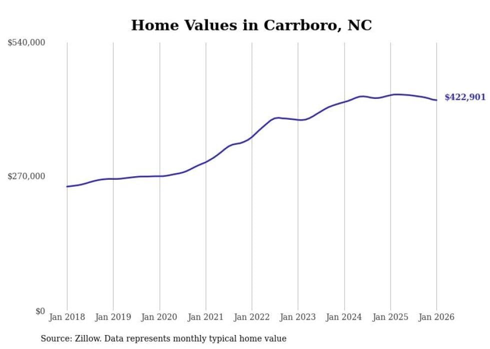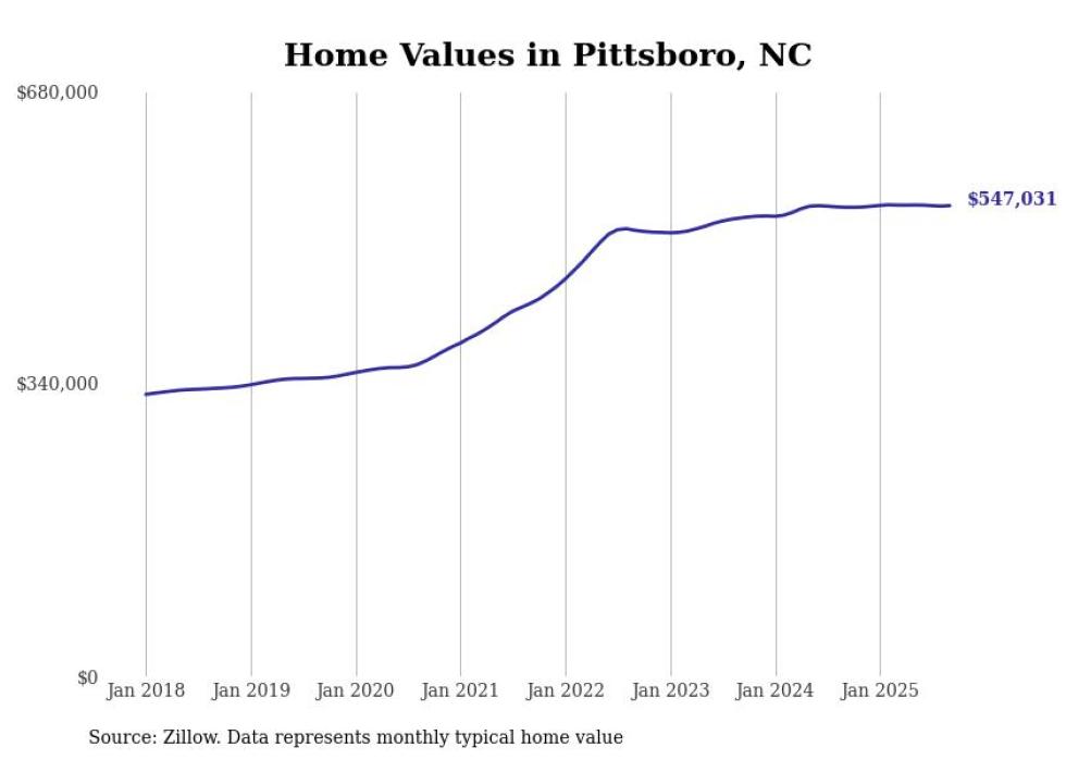 Stacker compiled a list of cities with the most expensive homes in the Durham metro area using data from Zillow. Charts show the monthly typical home value since January 2018. All 25 cities and towns with data available were included in the list.