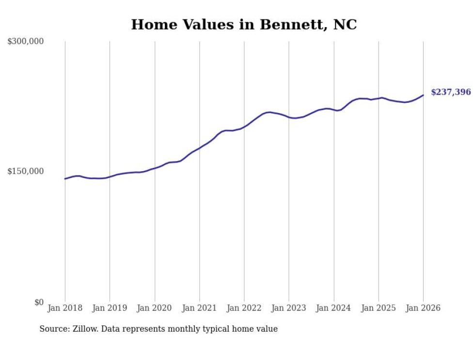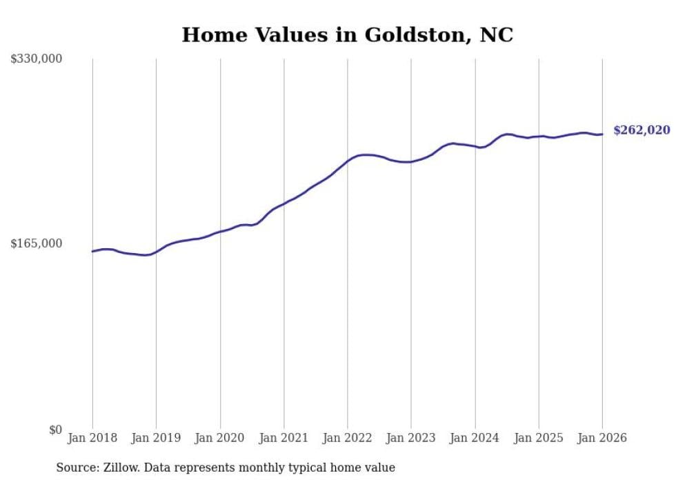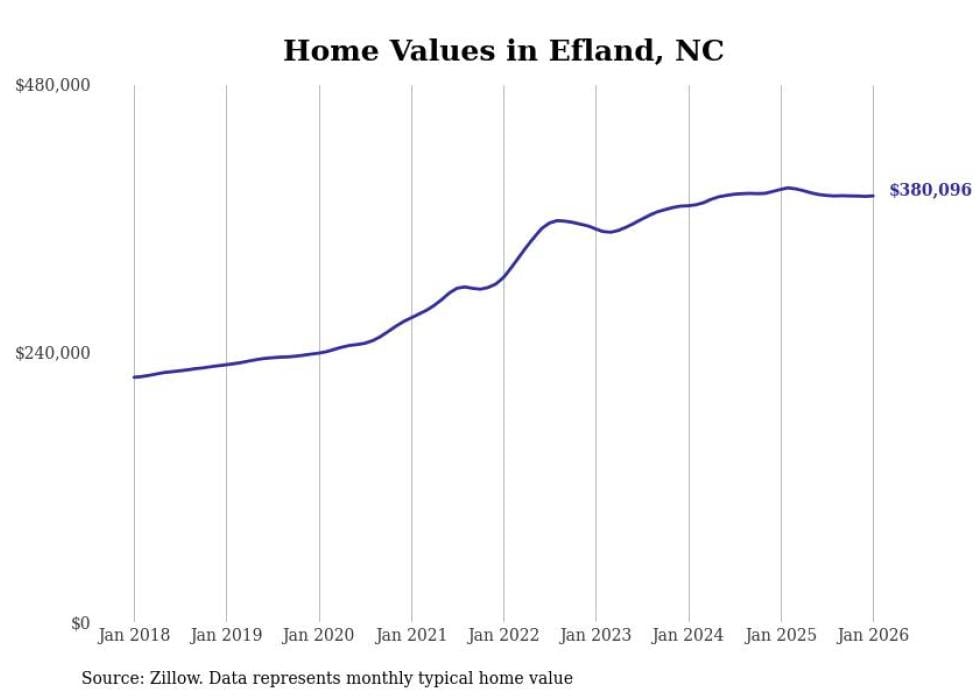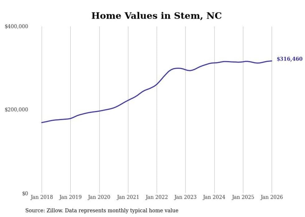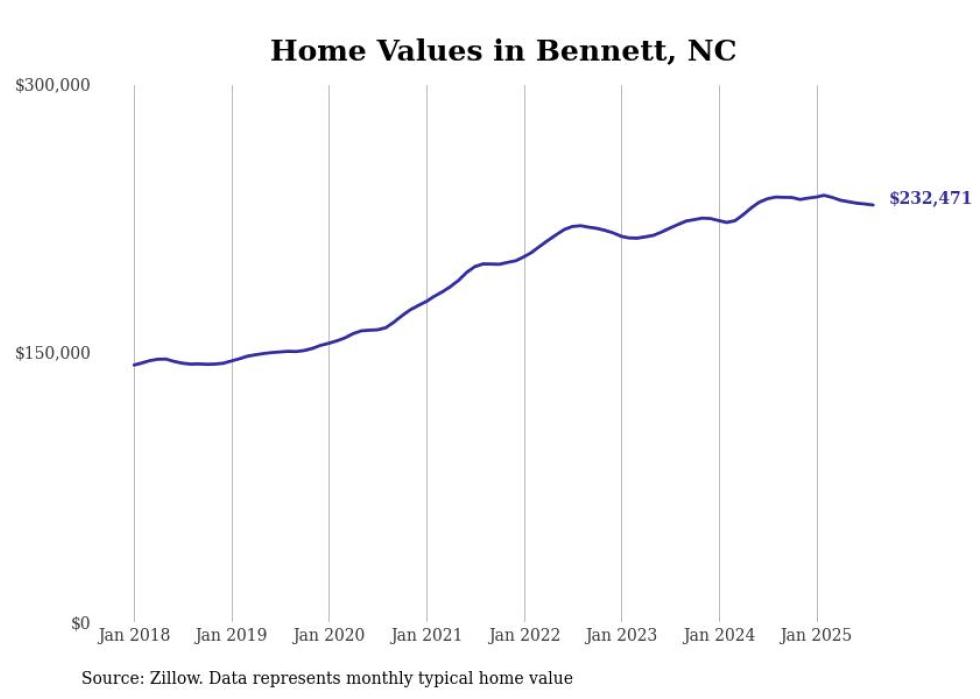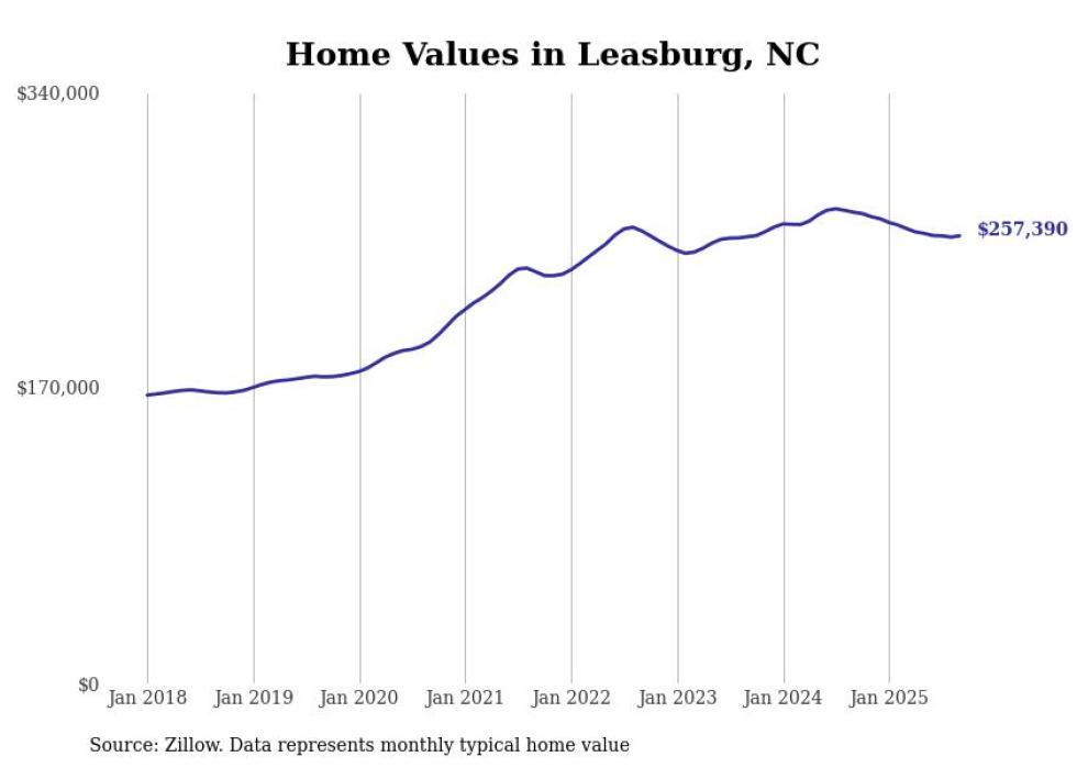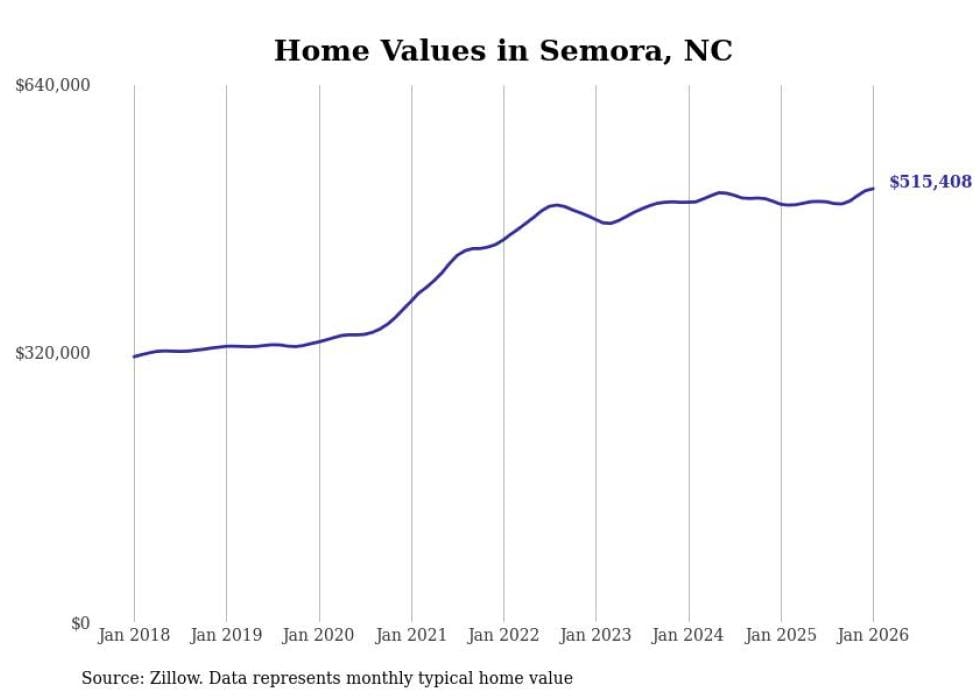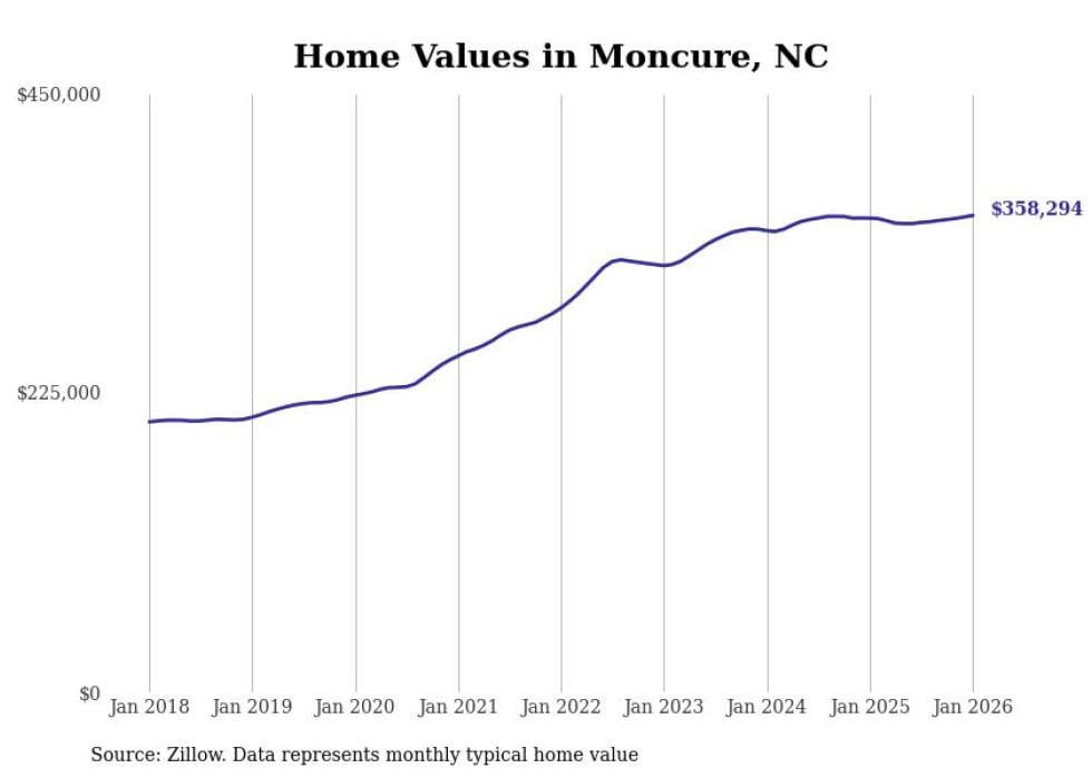 Stacker compiled a list of cities with the most expensive homes in the Durham metro area using data from Zillow. Charts show the monthly typical home value since January 2018. All 25 cities and towns with data available were included in the list.