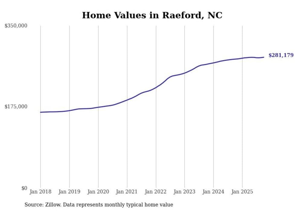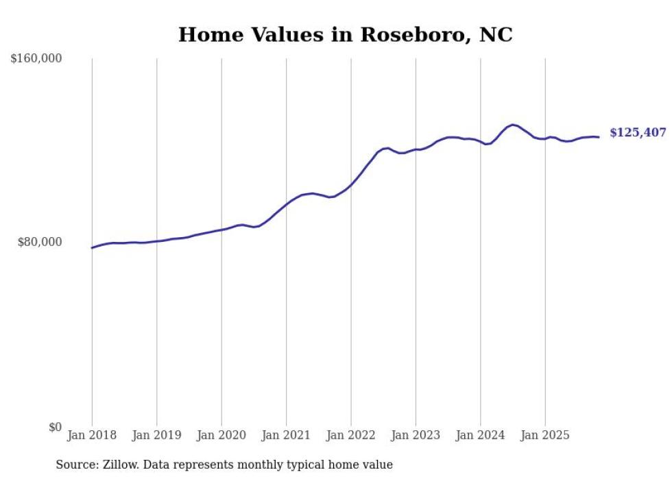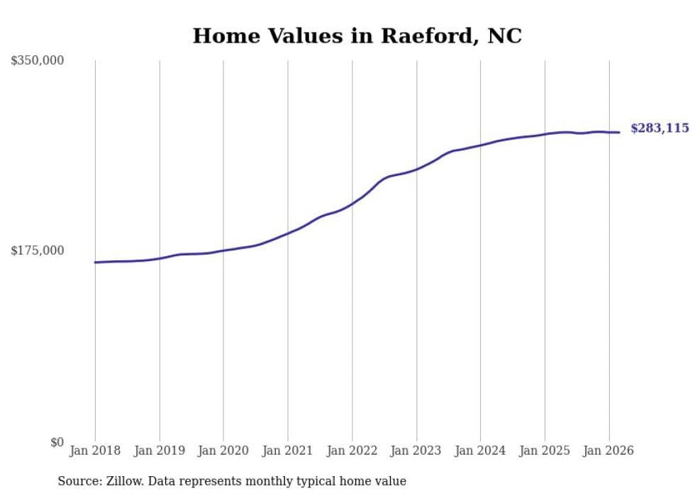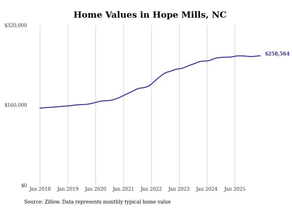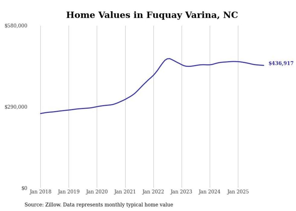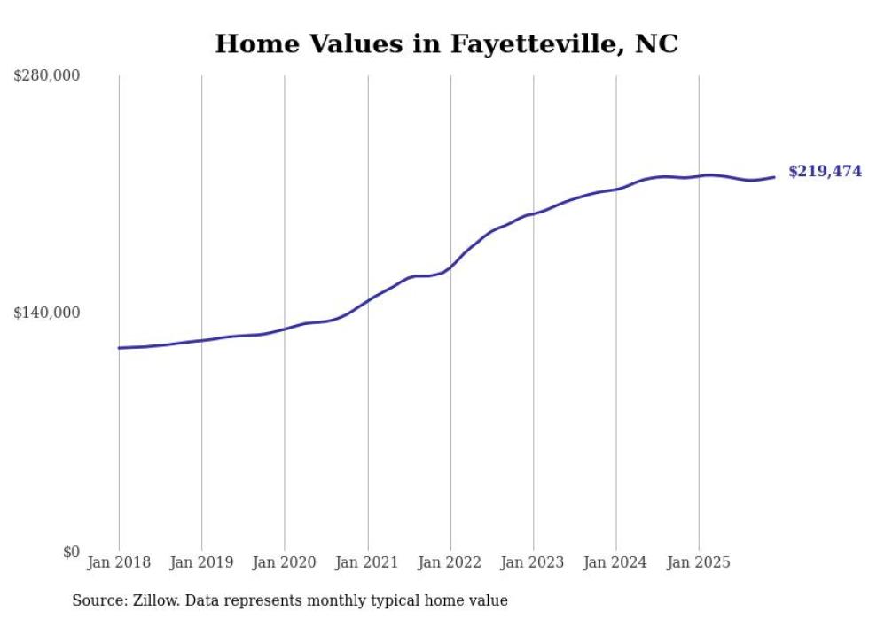 Stacker compiled a list of cities with the most expensive homes in the Fayetteville, North Carolina metro area using data from Zillow. Charts show the monthly typical home value since January 2018. All 20 cities and towns with data available were included in the list.