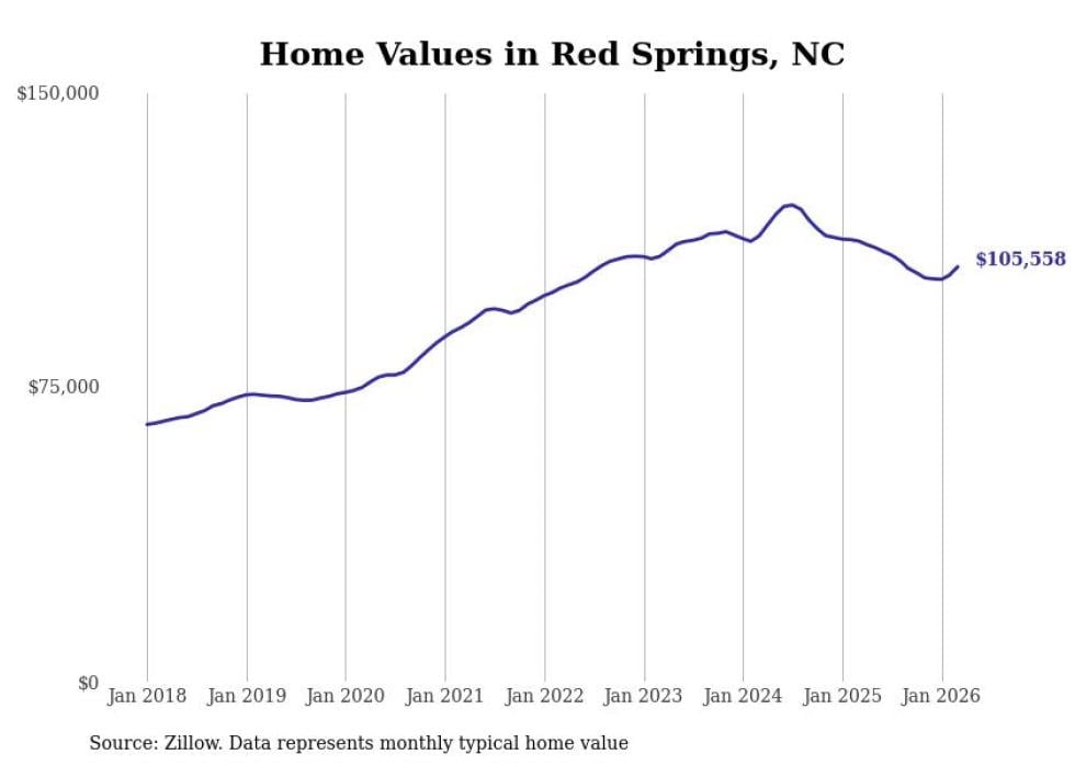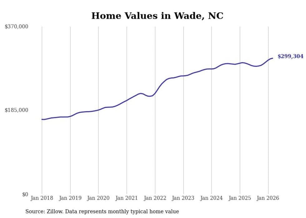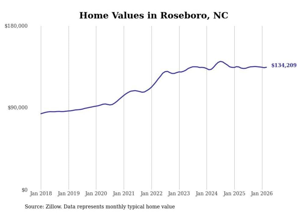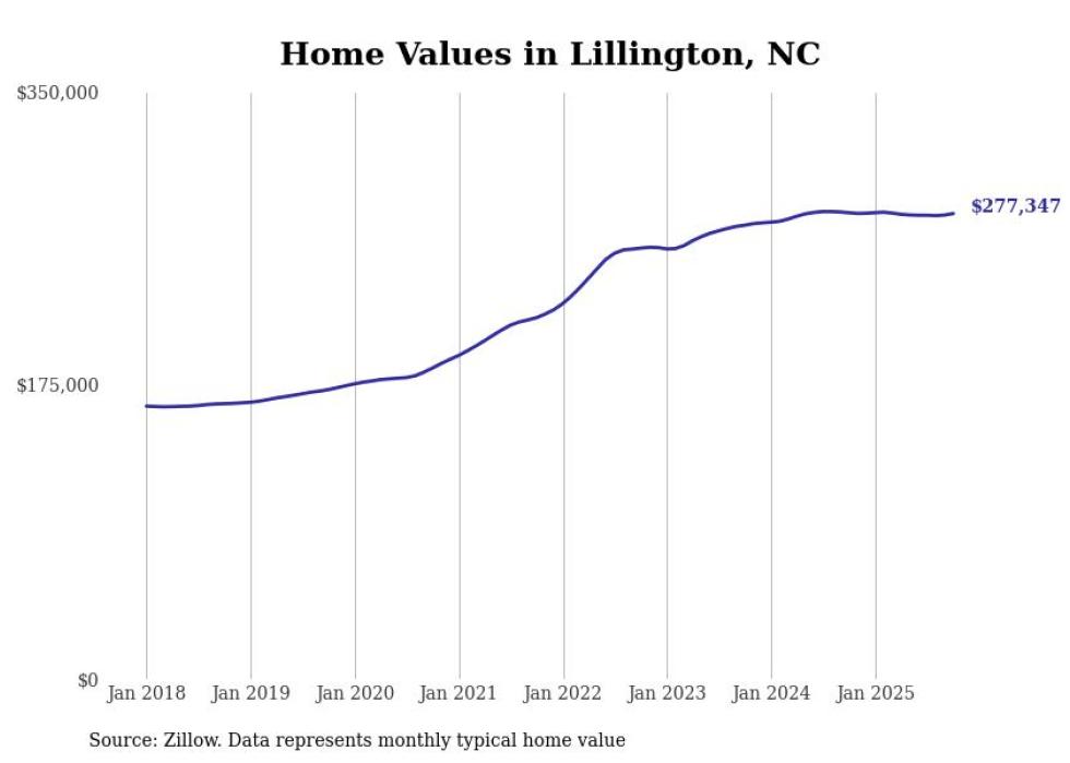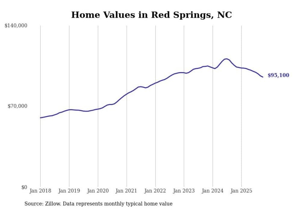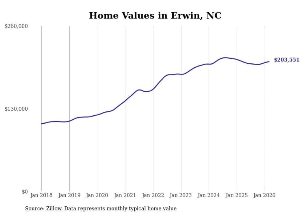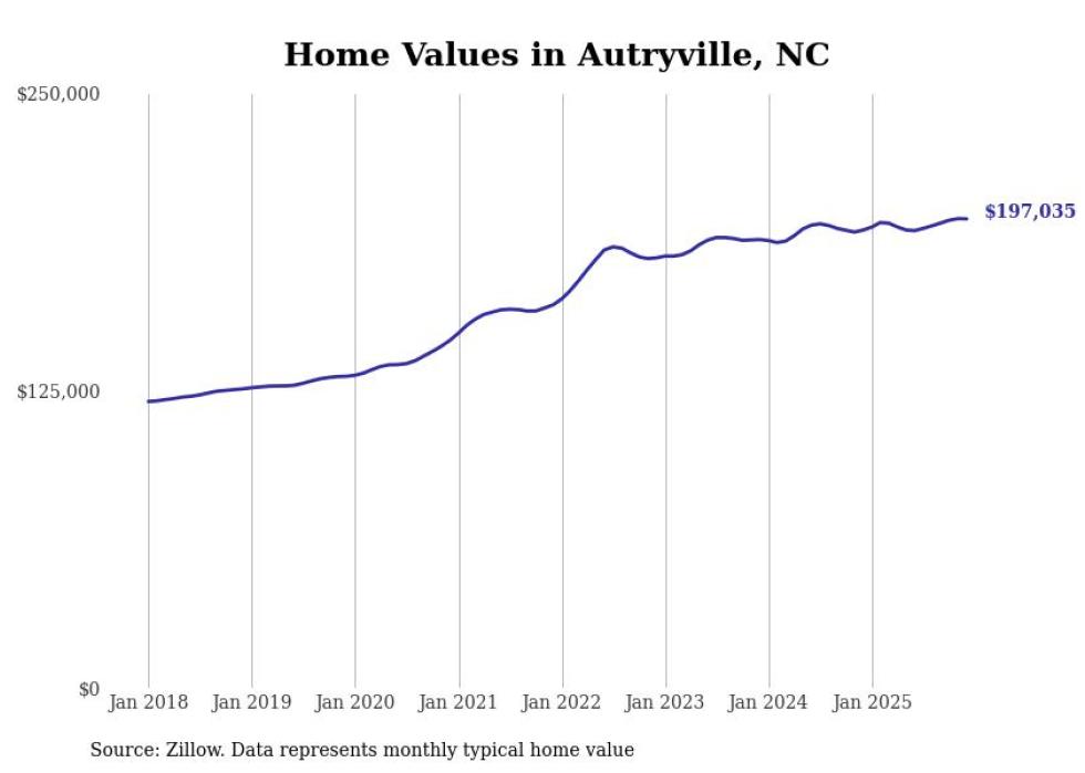 Stacker compiled a list of cities with the most expensive homes in the Fayetteville, North Carolina metro area using data from Zillow. Charts show the monthly typical home value since January 2018. All 20 cities and towns with data available were included in the list.