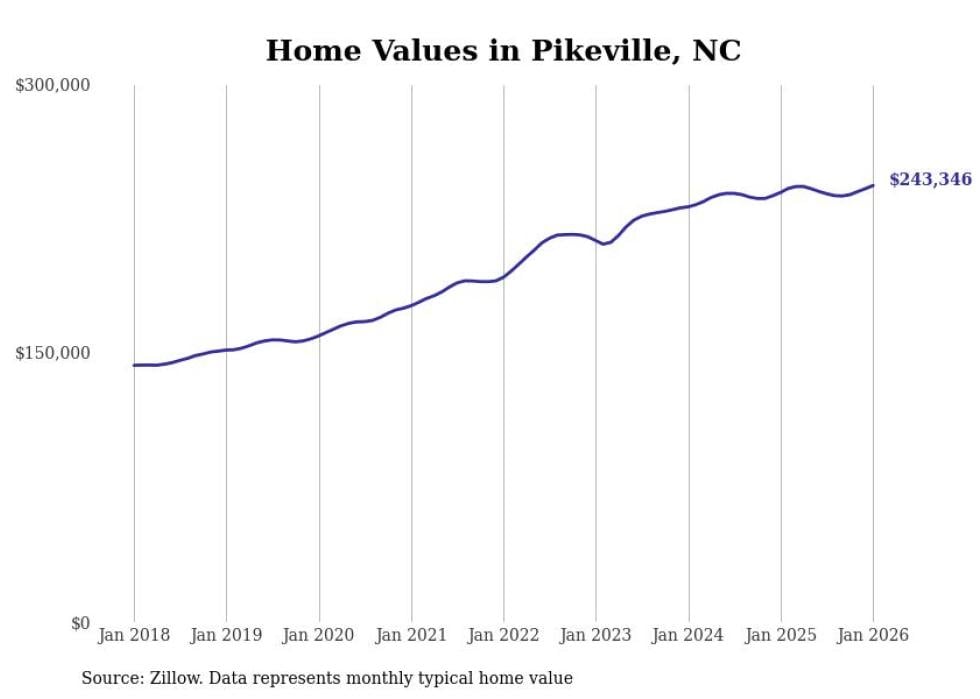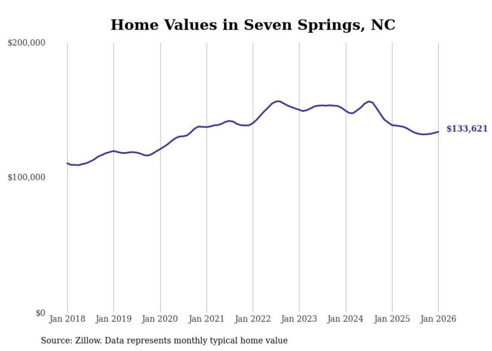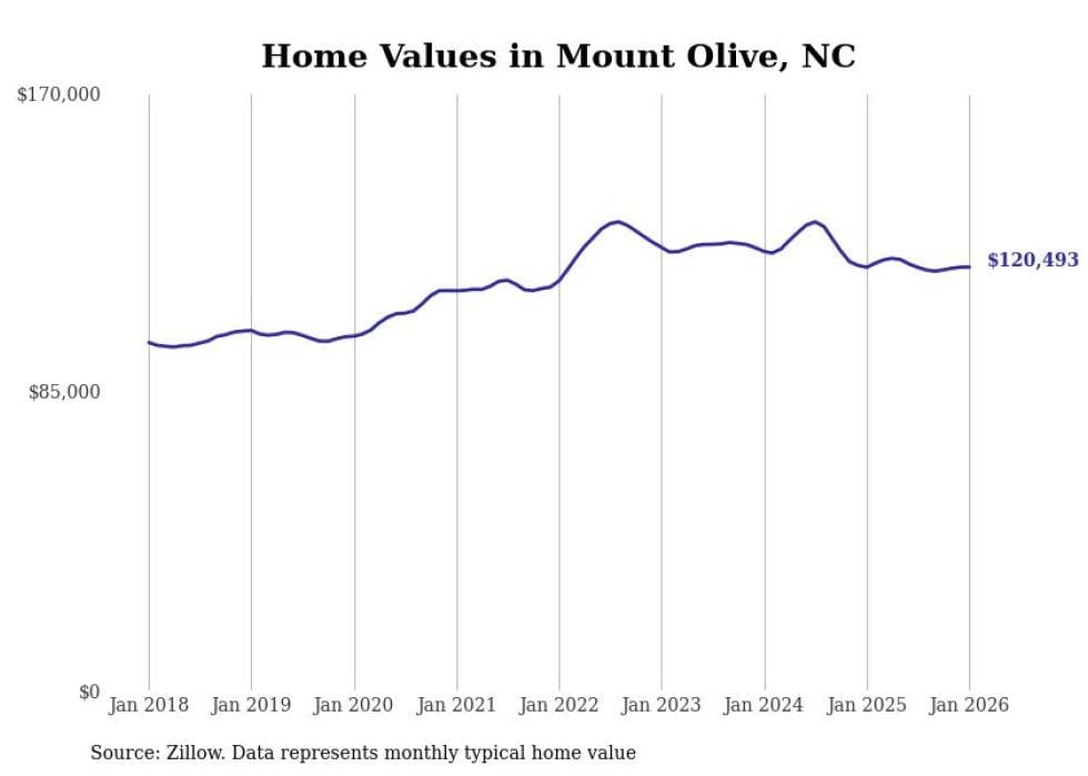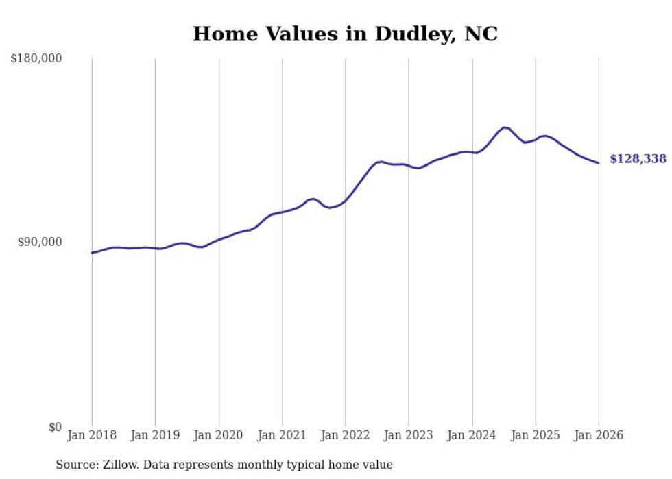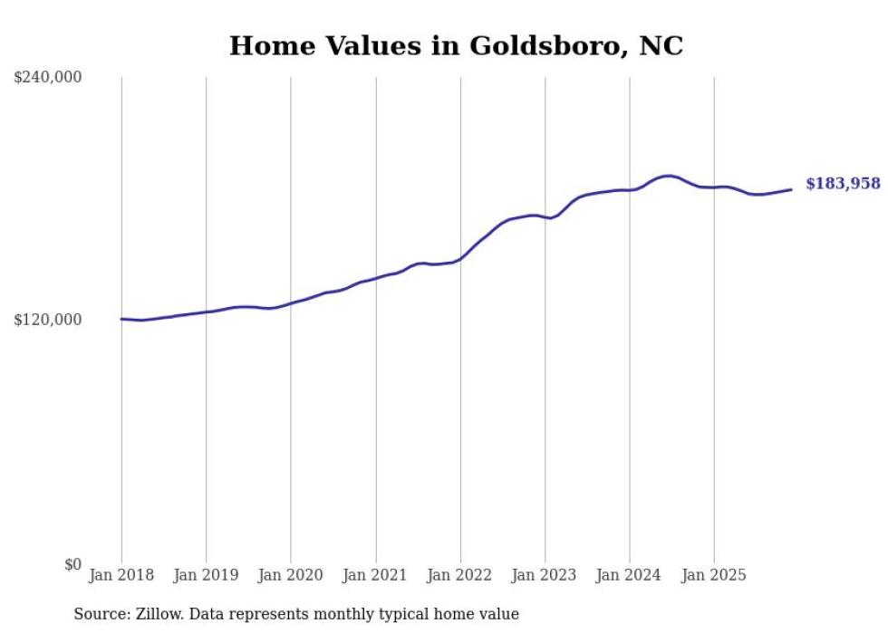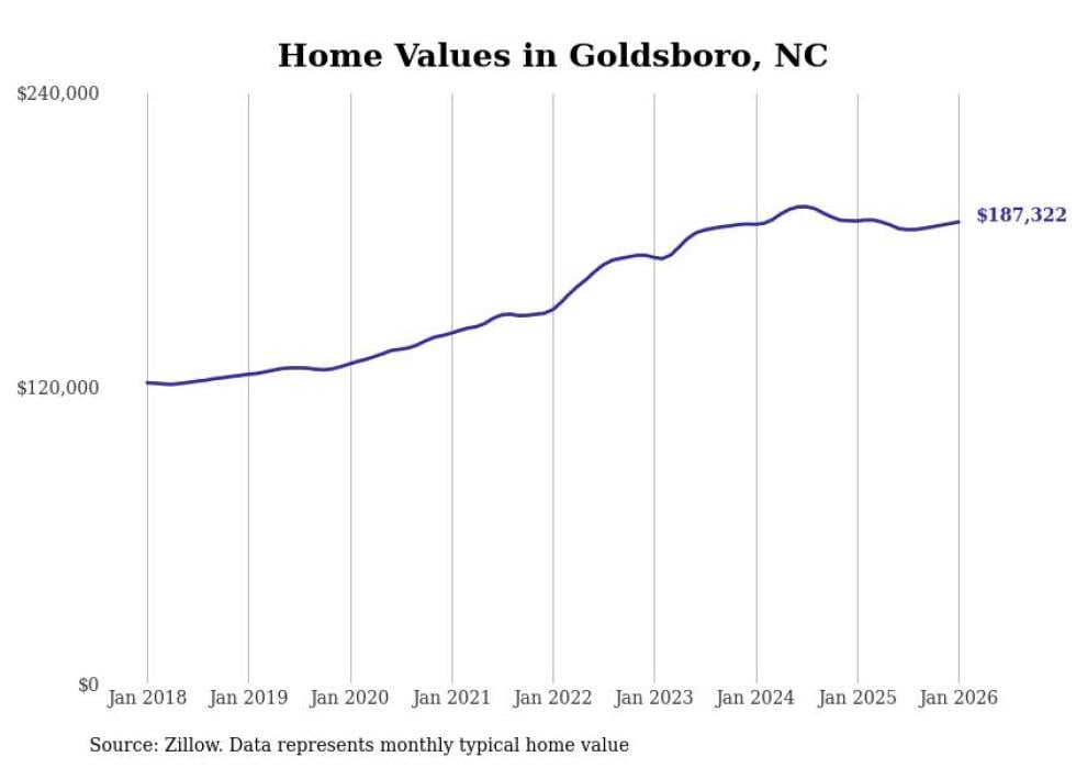 Stacker compiled a list of cities with the most expensive homes in the Goldsboro metro area using data from Zillow. Charts show the monthly typical home value since January 2018. All 8 cities and towns with data available were included in the list.