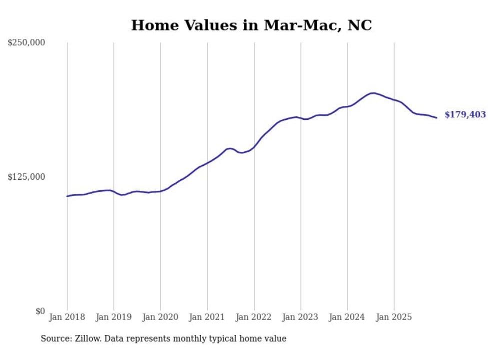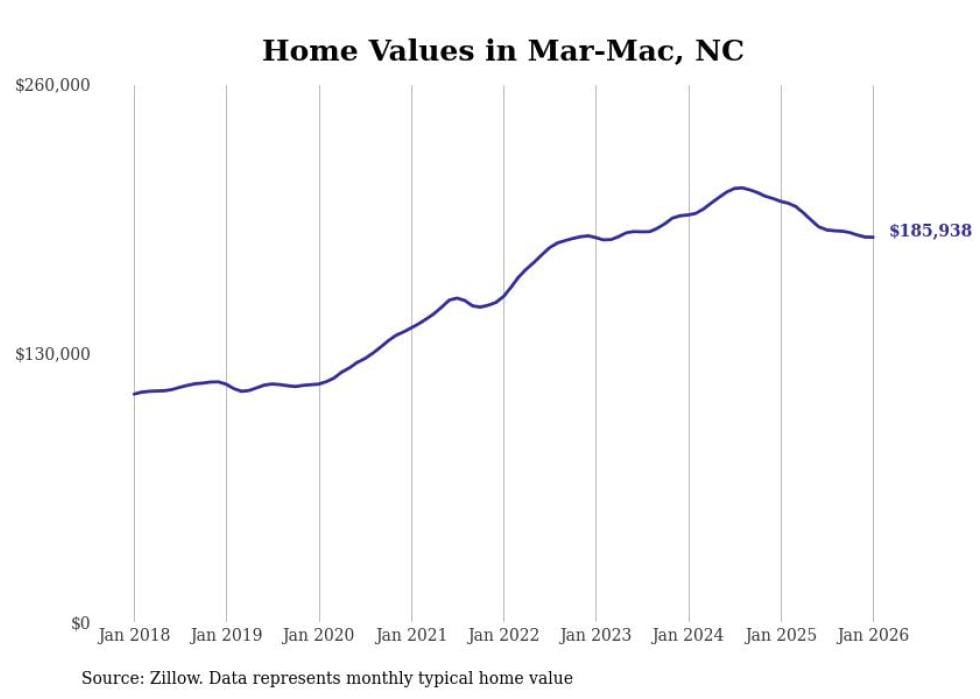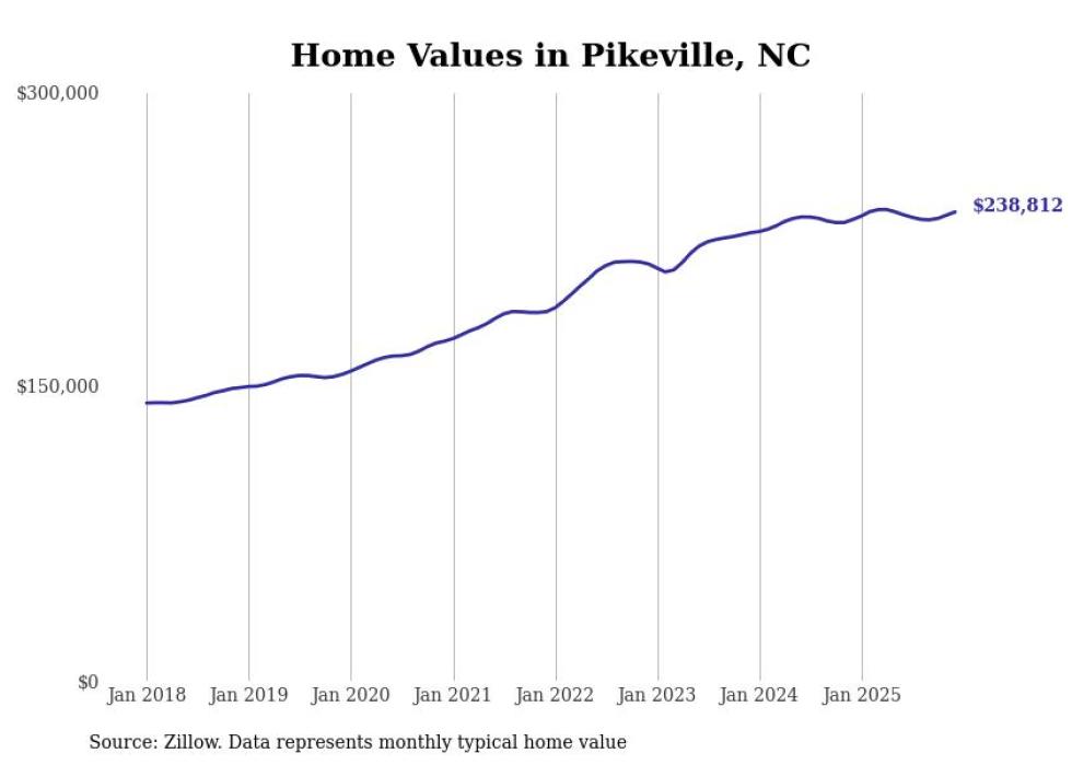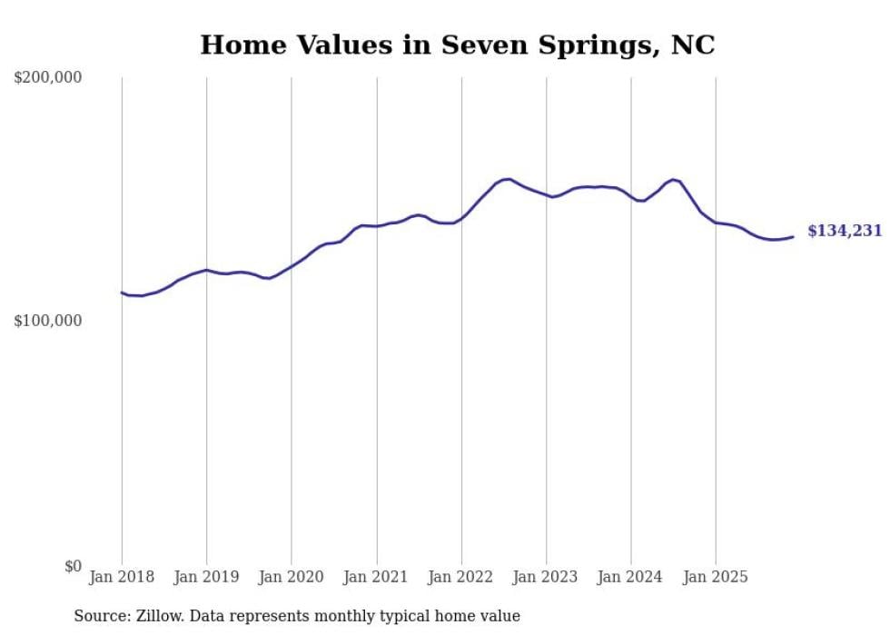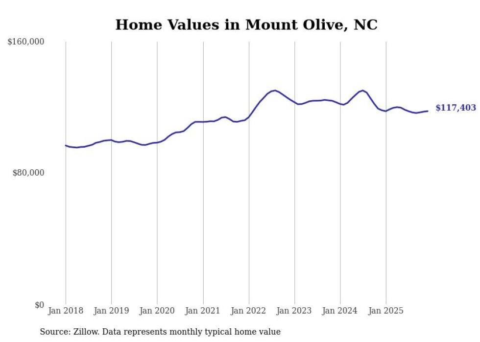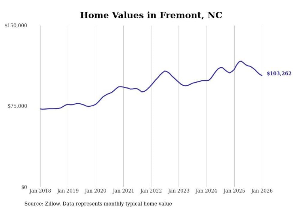 Stacker compiled a list of cities with the most expensive homes in the Goldsboro metro area using data from Zillow. Charts show the monthly typical home value since January 2018. All 8 cities and towns with data available were included in the list.