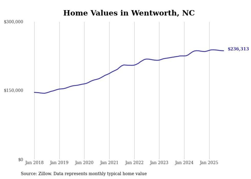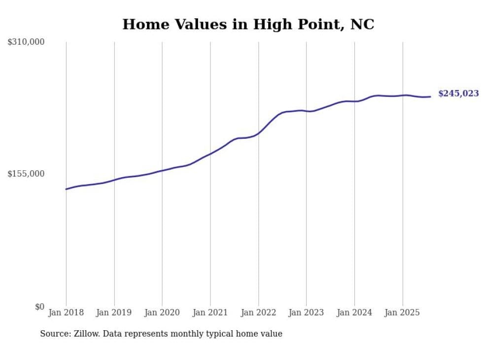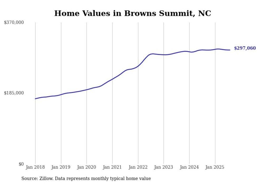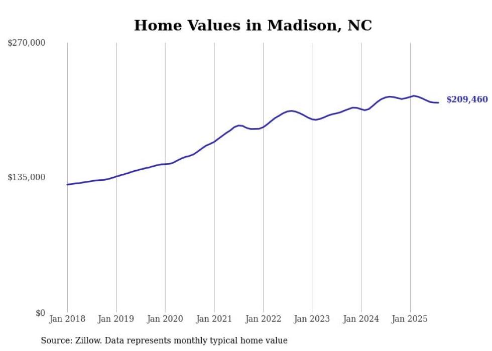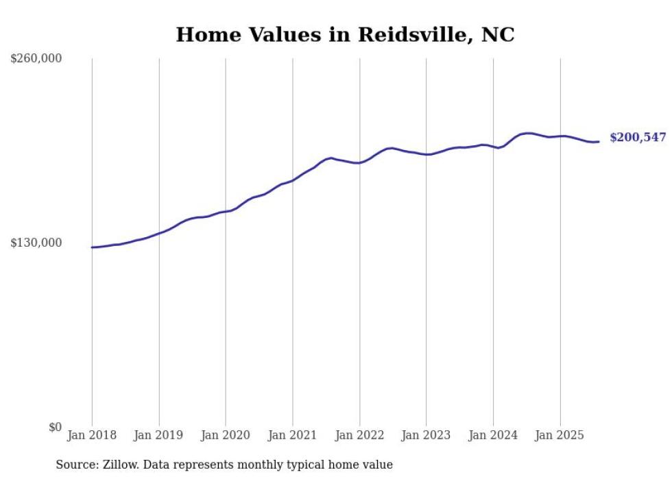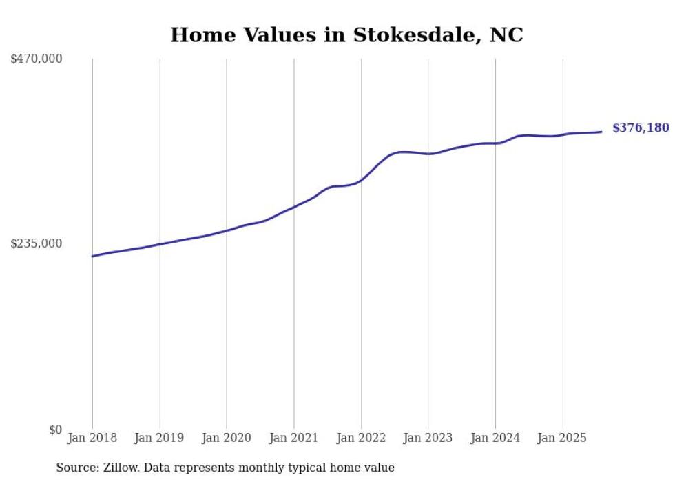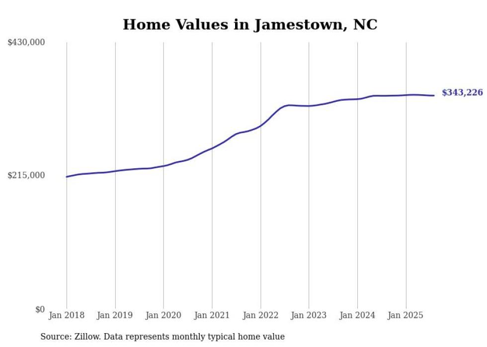 Stacker compiled a list of cities with the most expensive homes in the Greensboro metro area using data from Zillow. Charts show the monthly typical home value since January 2018. Data was available for 32 cities and towns.