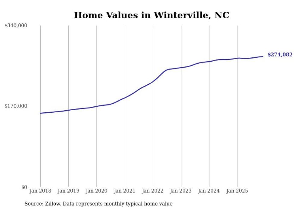 Stacker compiled a list of cities with the most expensive homes in the Greenville, North Carolina metro area using data from Zillow. Charts show the monthly typical home value since January 2018. All 9 cities and towns with data available were included in the list.