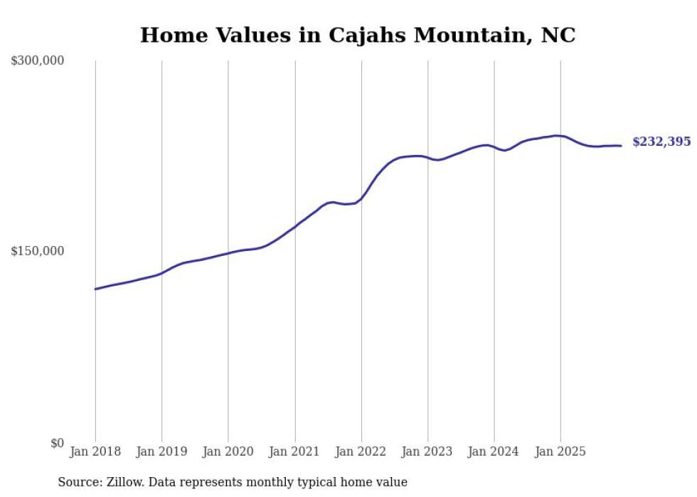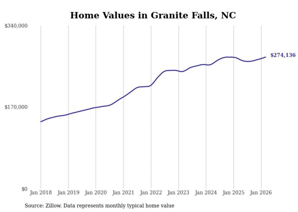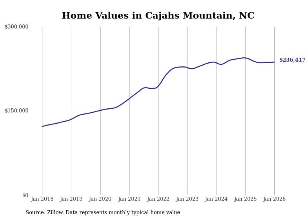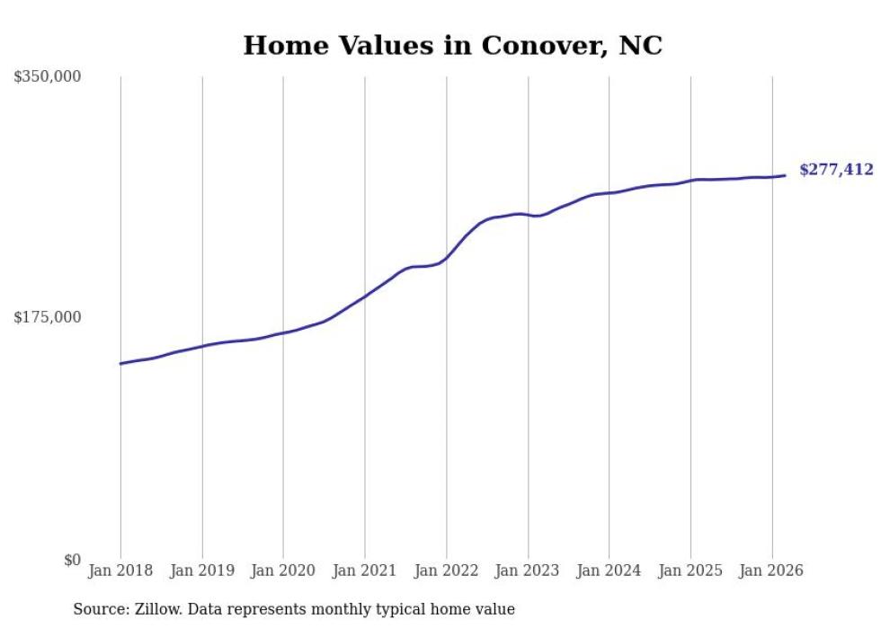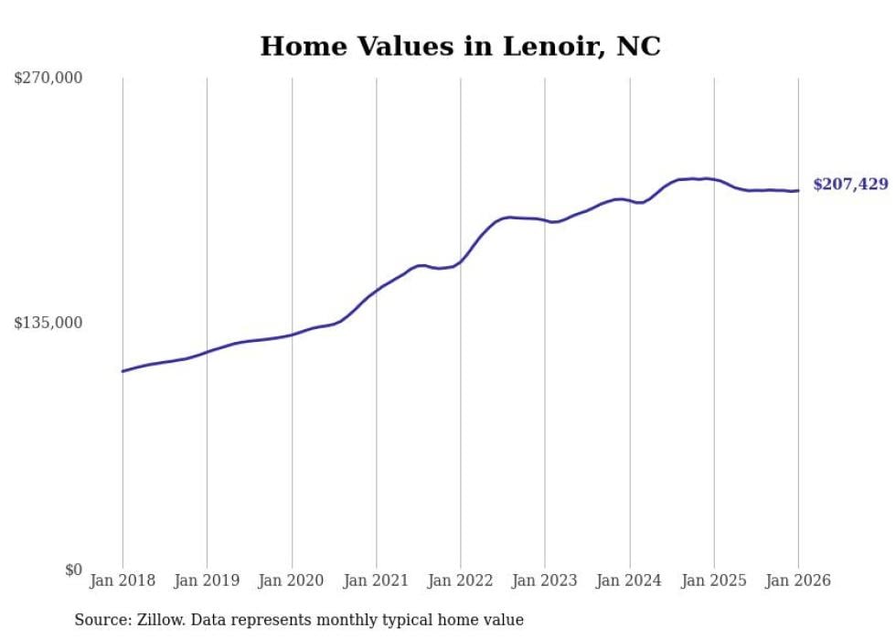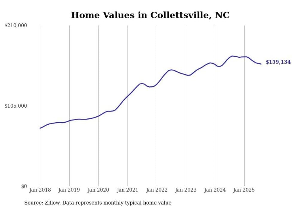 Stacker compiled a list of cities with the most expensive homes in the Hickory metro area using data from Zillow. Charts show the monthly typical home value since January 2018. All 25 cities and towns with data available were included in the list.