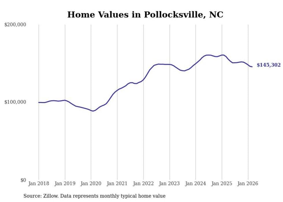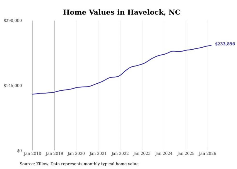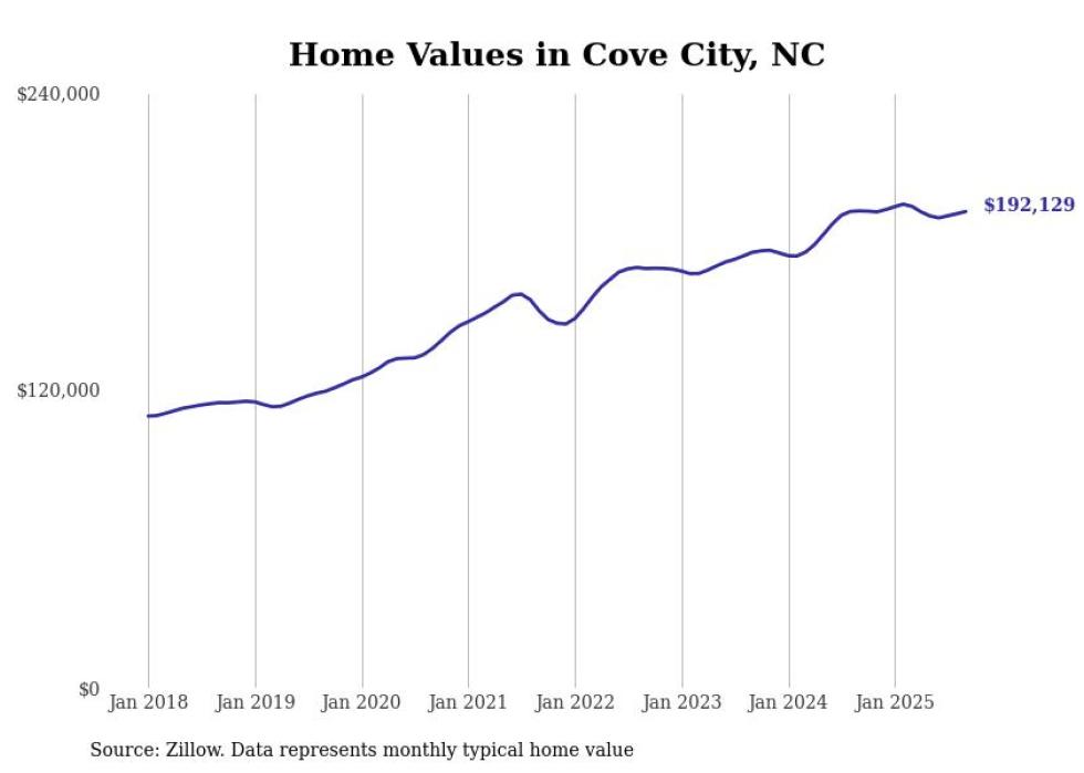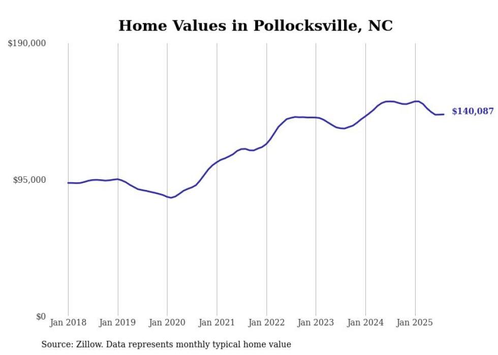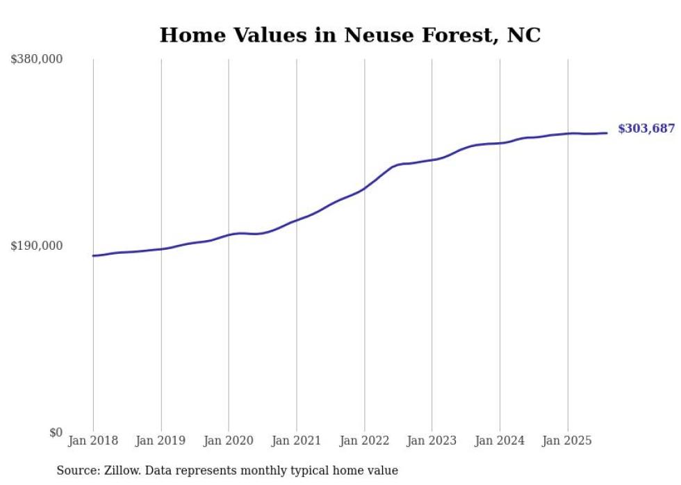 Stacker compiled a list of cities with the most expensive homes in the New Bern, NC metro area using data from Zillow. Charts show the monthly typical home value since January 2018.