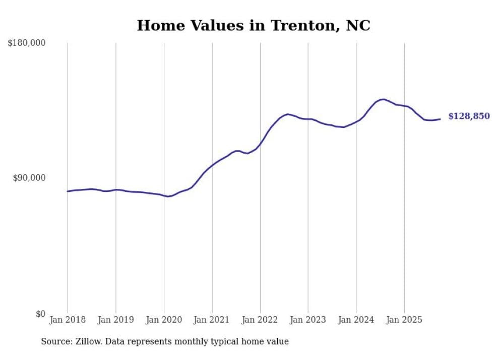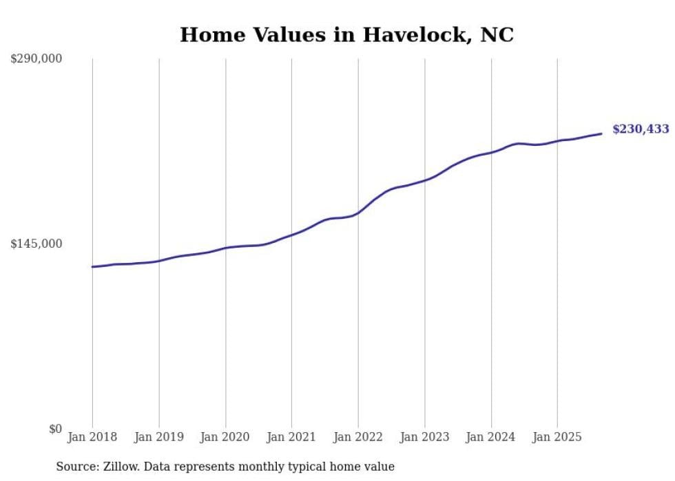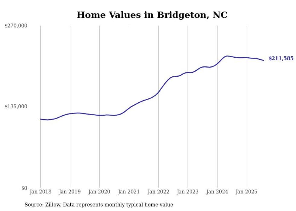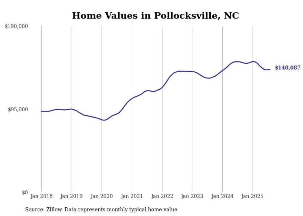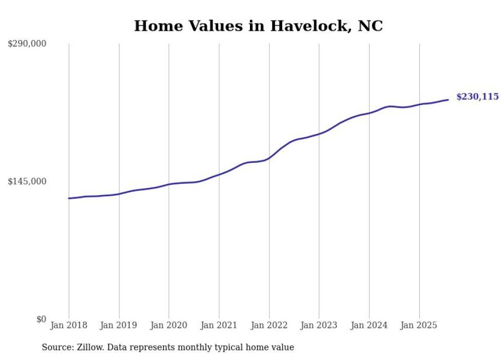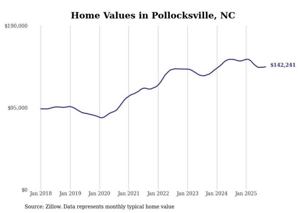 Stacker compiled a list of cities with the most expensive homes in the New Bern metro area using data from Zillow. Charts show the monthly typical home value since January 2018. All 21 cities and towns with data available were included in the list.