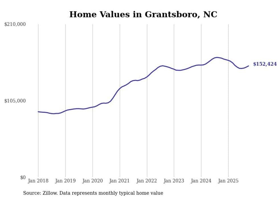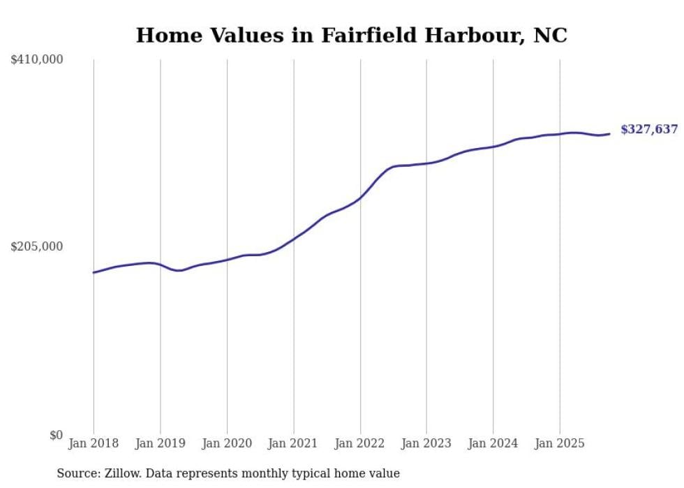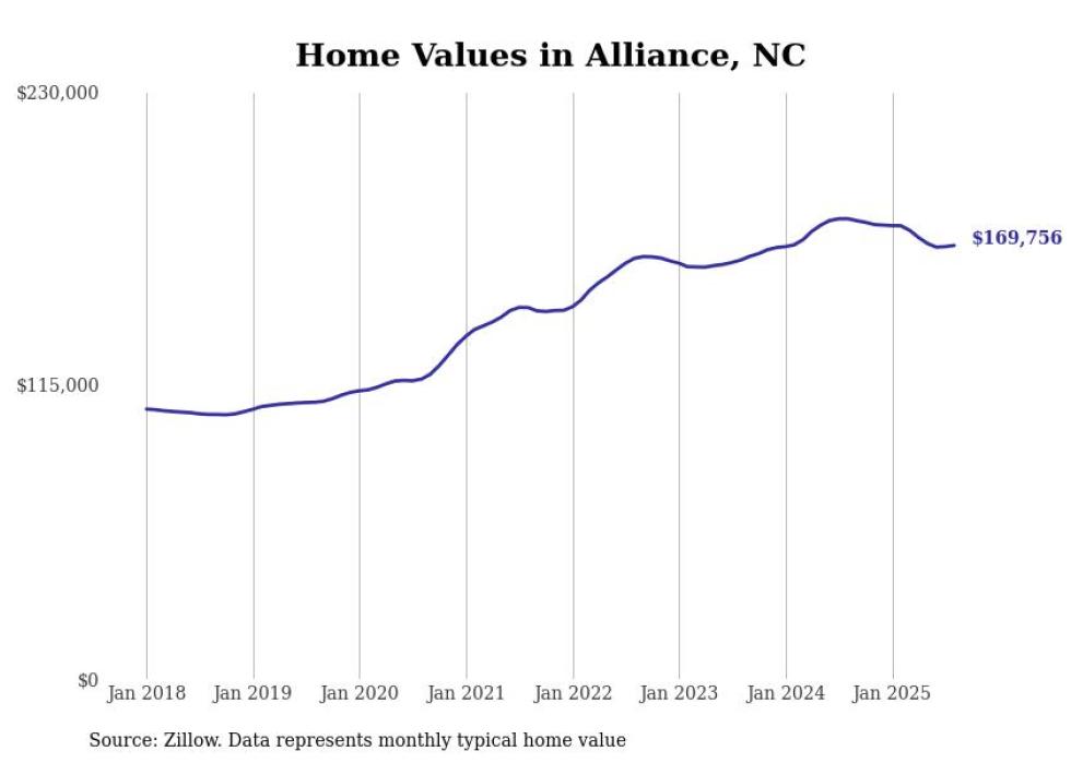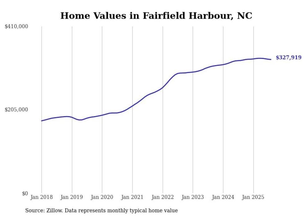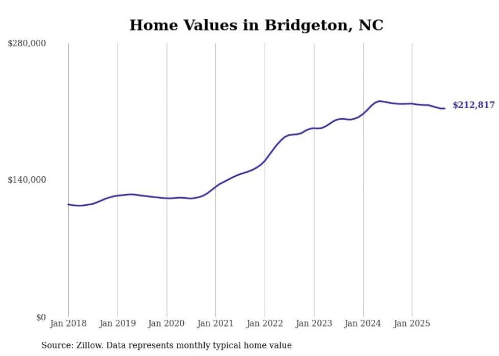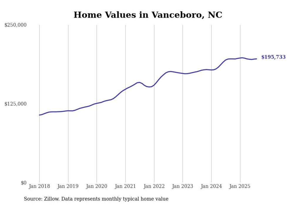 Stacker compiled a list of cities with the most expensive homes in the New Bern metro area using data from Zillow. Charts show the monthly typical home value since January 2018. All 21 cities and towns with data available were included in the list.