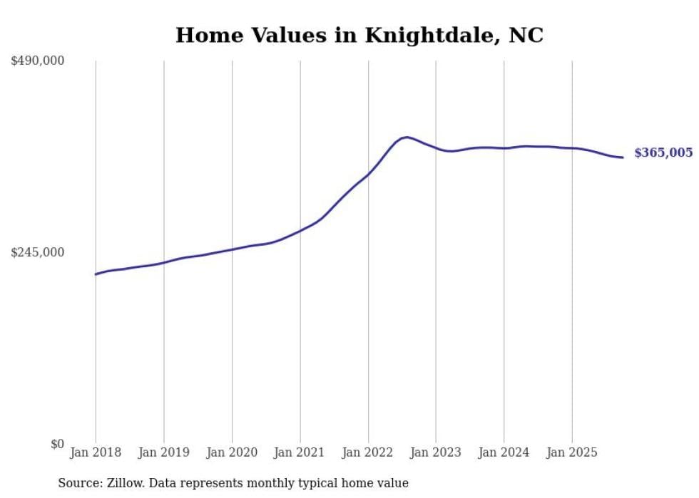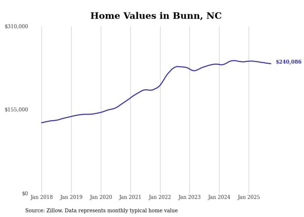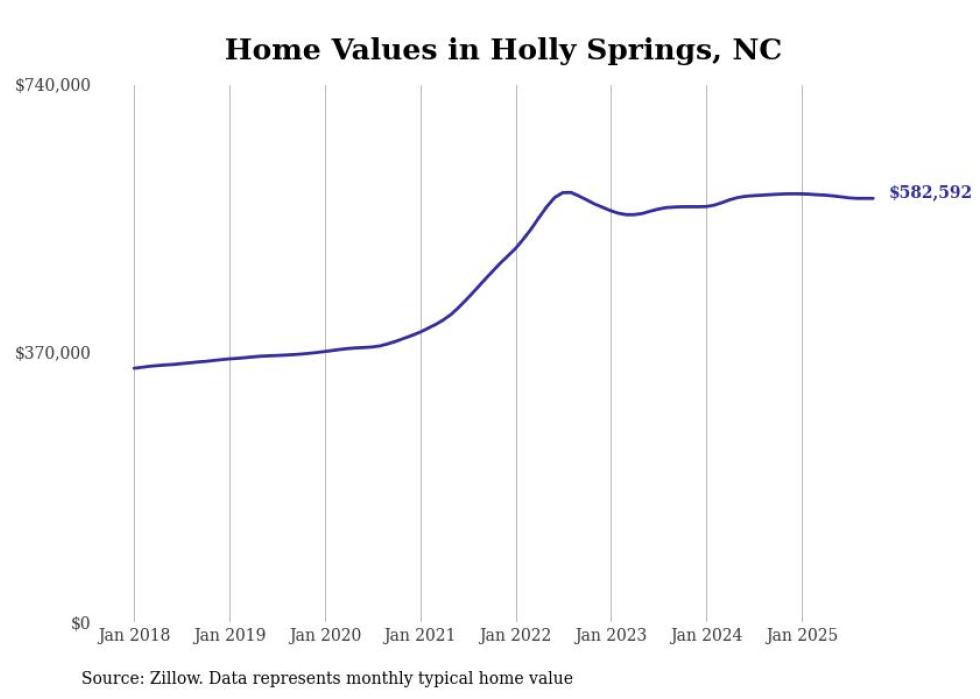 Stacker compiled a list of cities with the most expensive homes in the Raleigh metro area using data from Zillow. Charts show the monthly typical home value since January 2018. All 25 cities and towns with data available were included in the list.