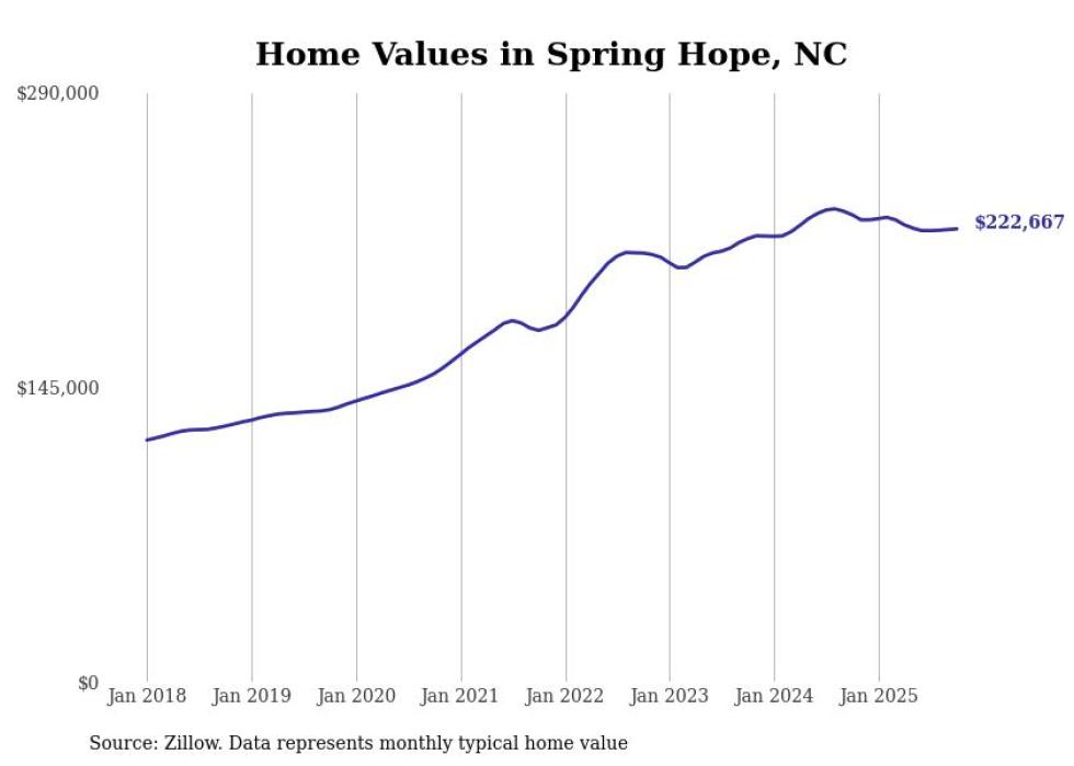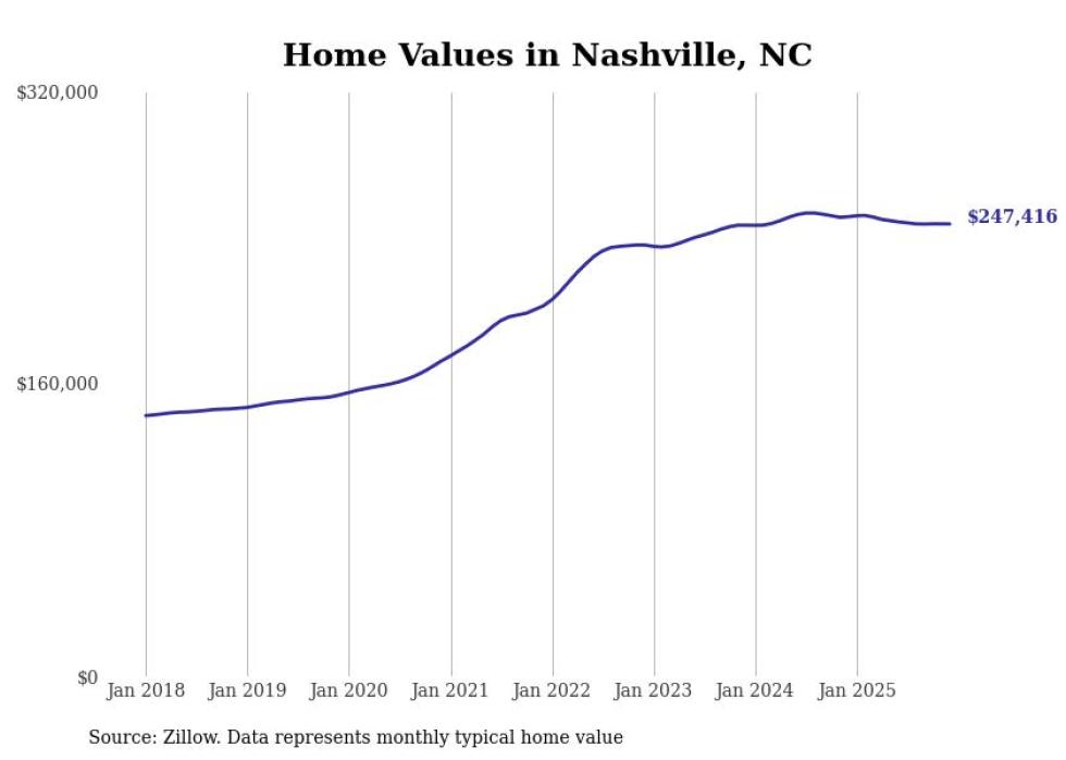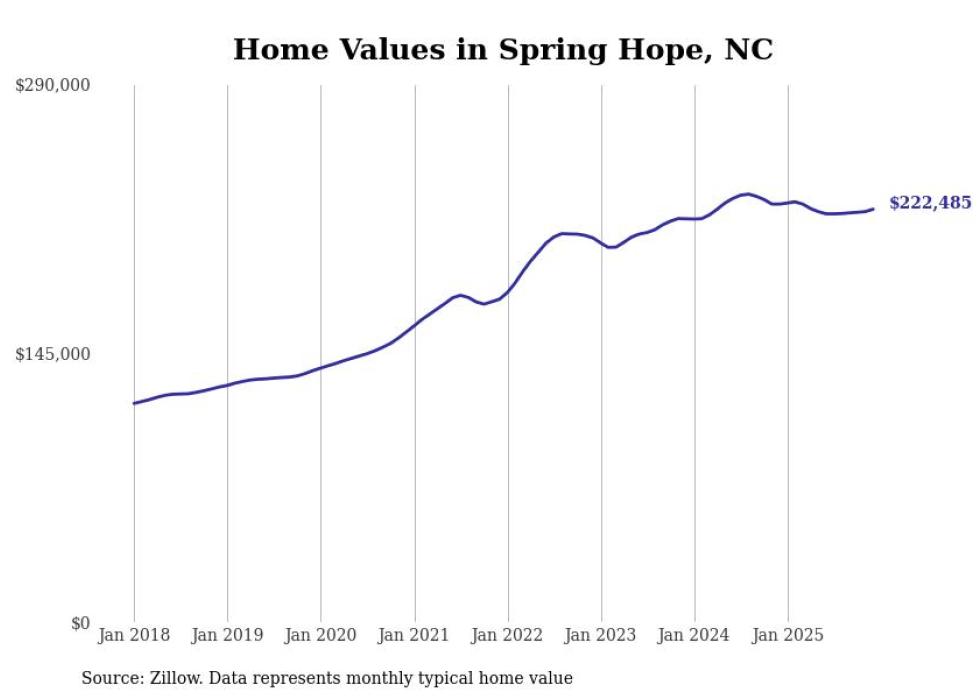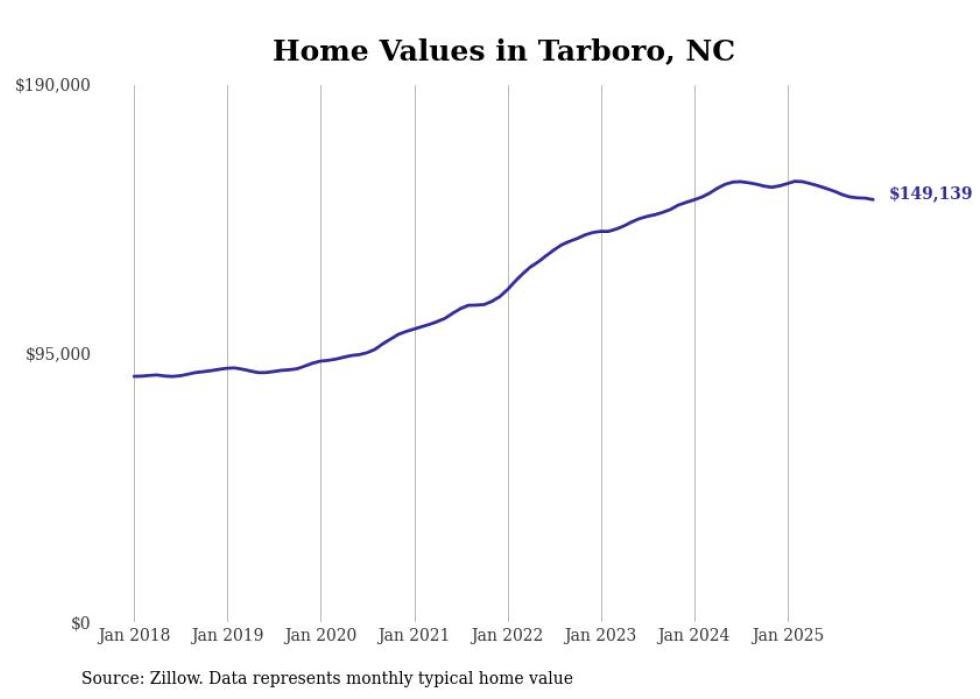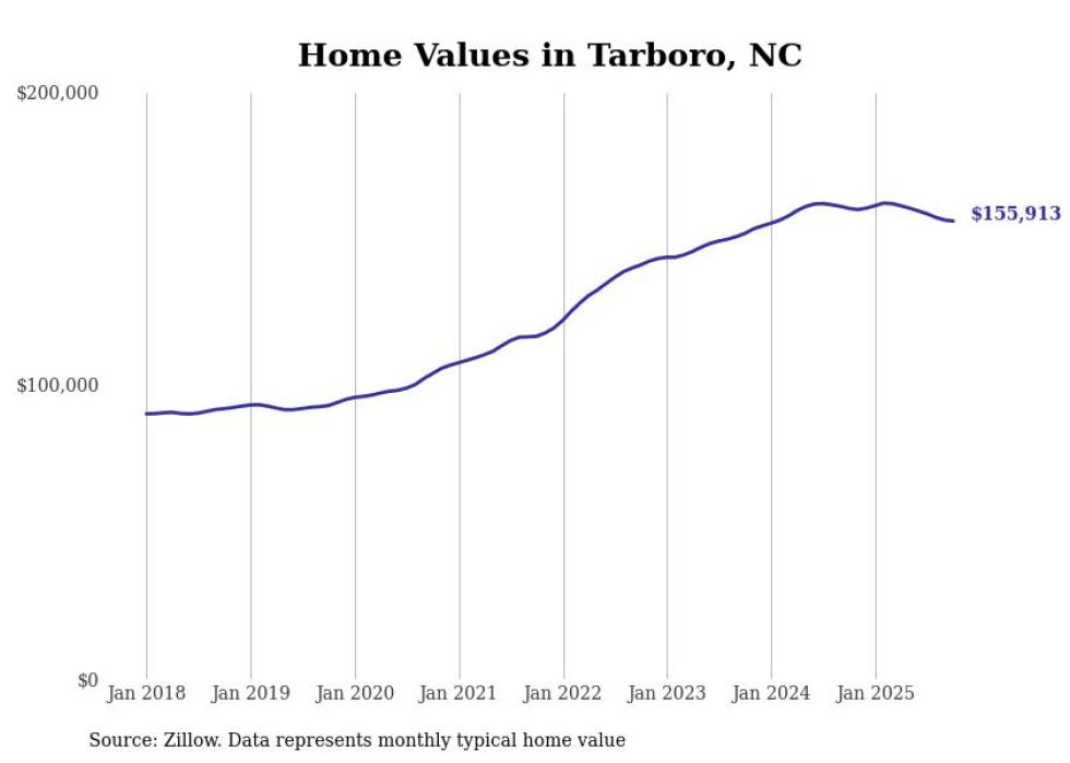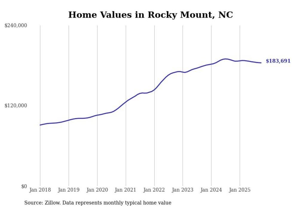 Stacker compiled a list of cities with the most expensive homes in the Rocky Mount metro area using data from Zillow. Charts show the monthly typical home value since January 2018. All 13 cities and towns with data available were included in the list.