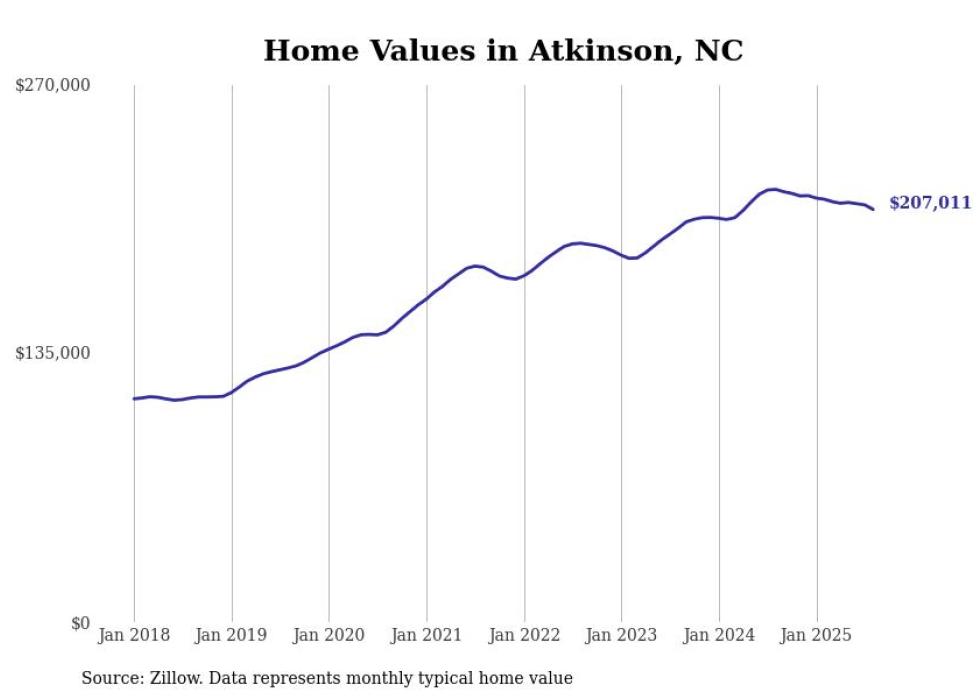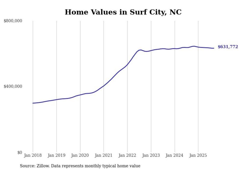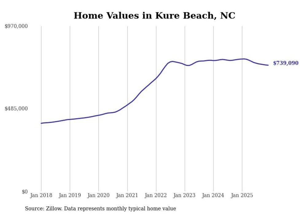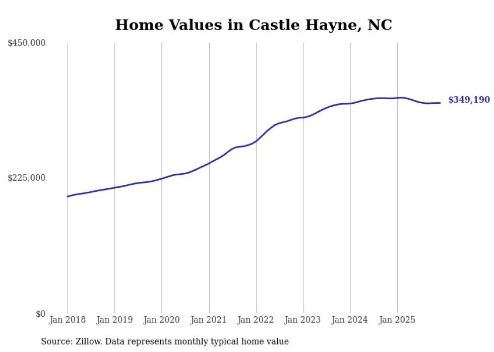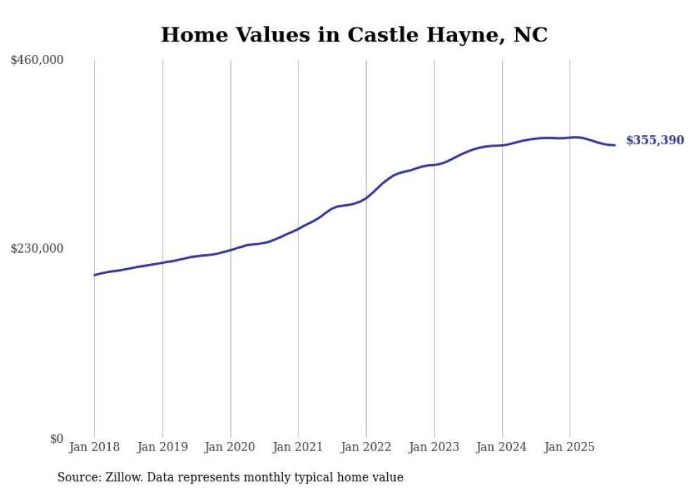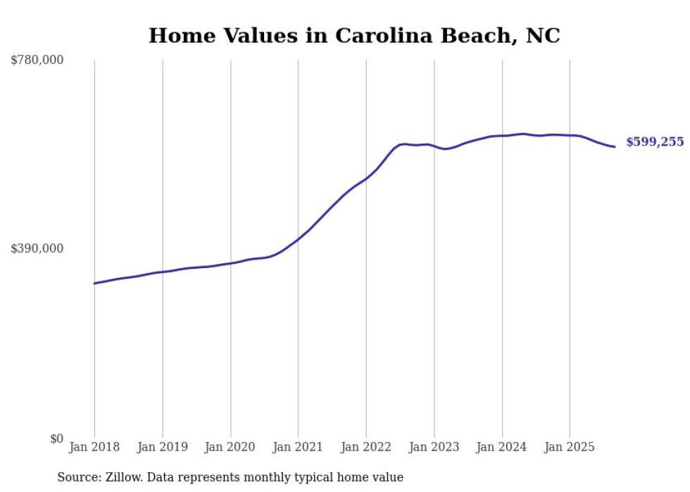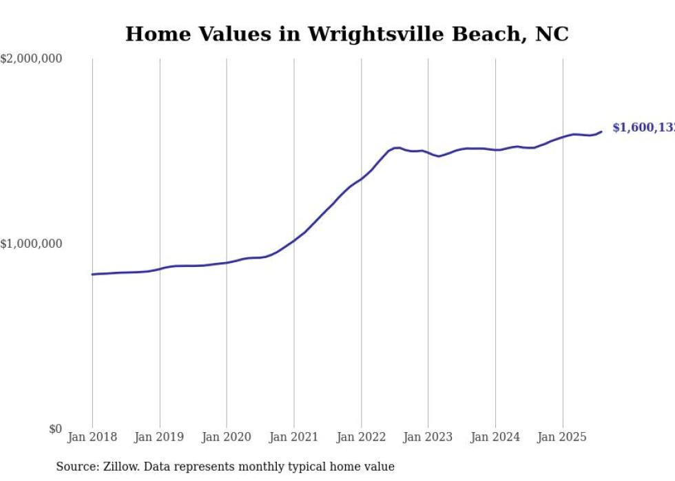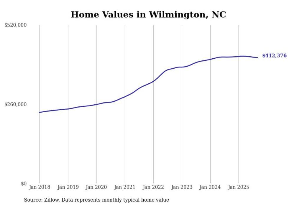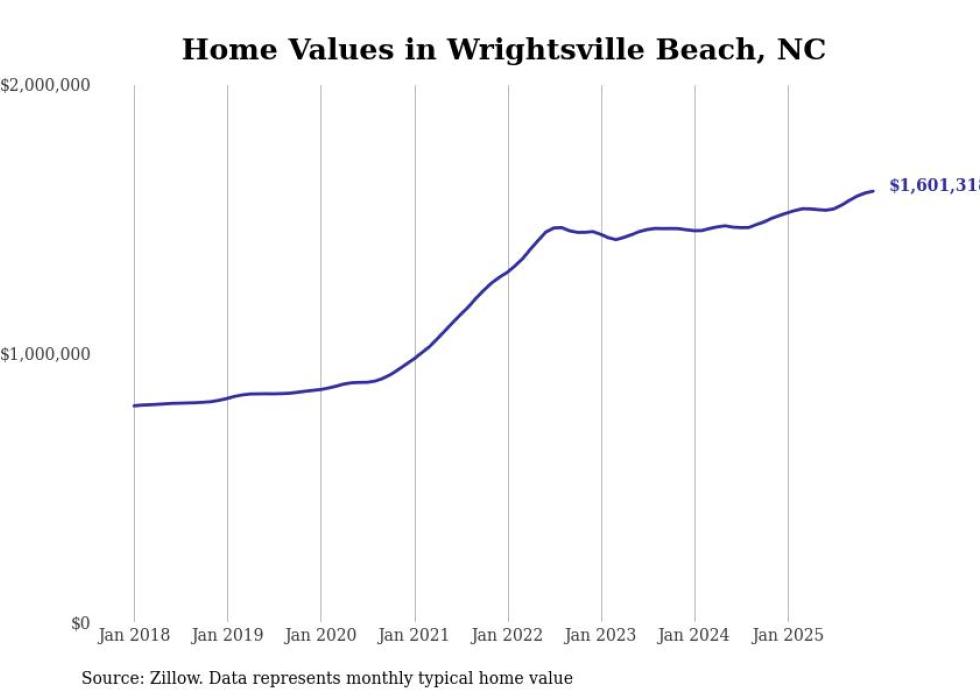 Stacker compiled a list of cities with the most expensive homes in the Wilmington, NC metro area using data from Zillow. Charts show the monthly typical home value since January 2018.