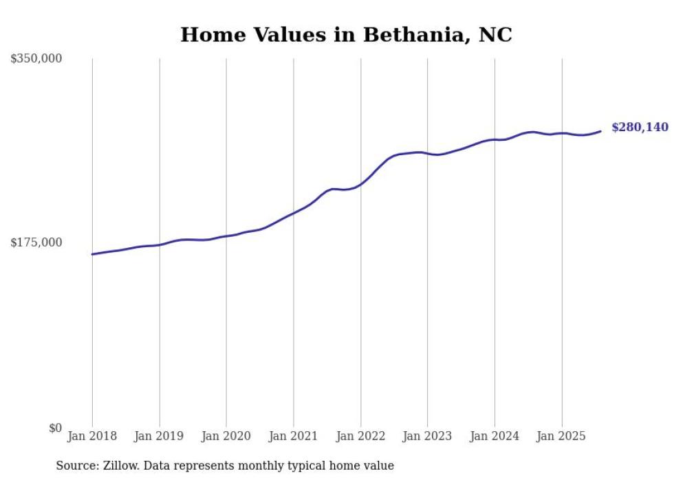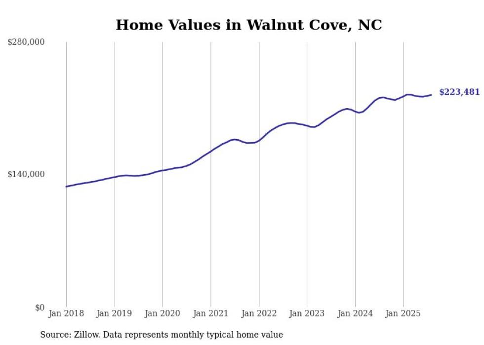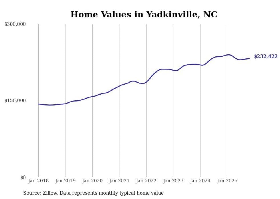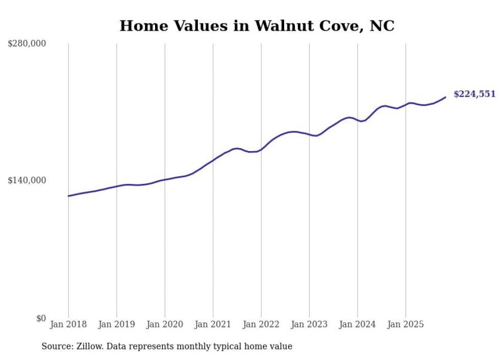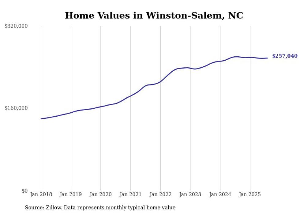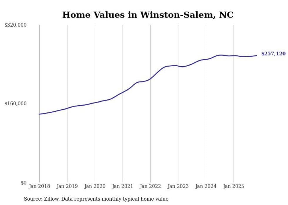 Stacker compiled a list of cities with the most expensive homes in the Winston-Salem, NC metro area using data from Zillow. Charts show the monthly typical home value since January 2018.