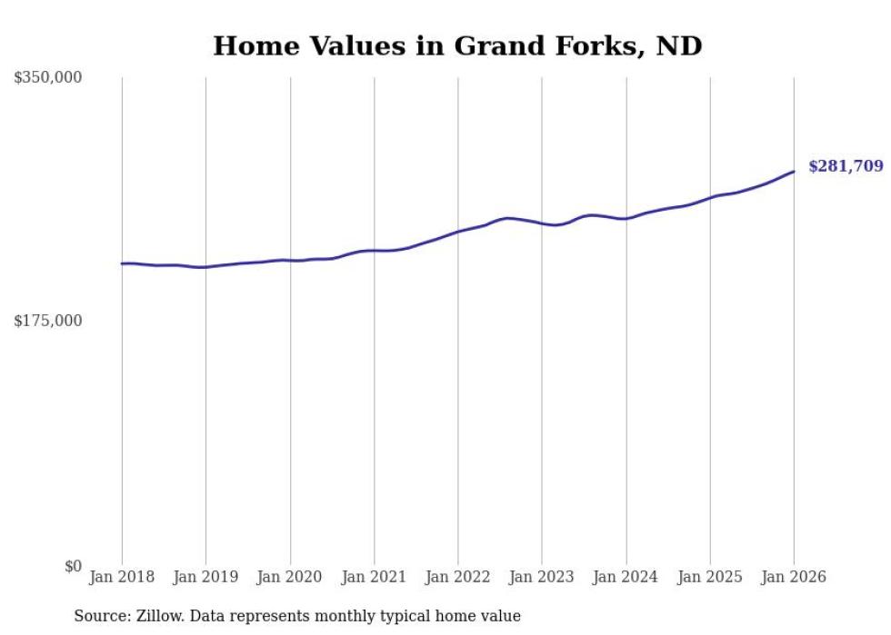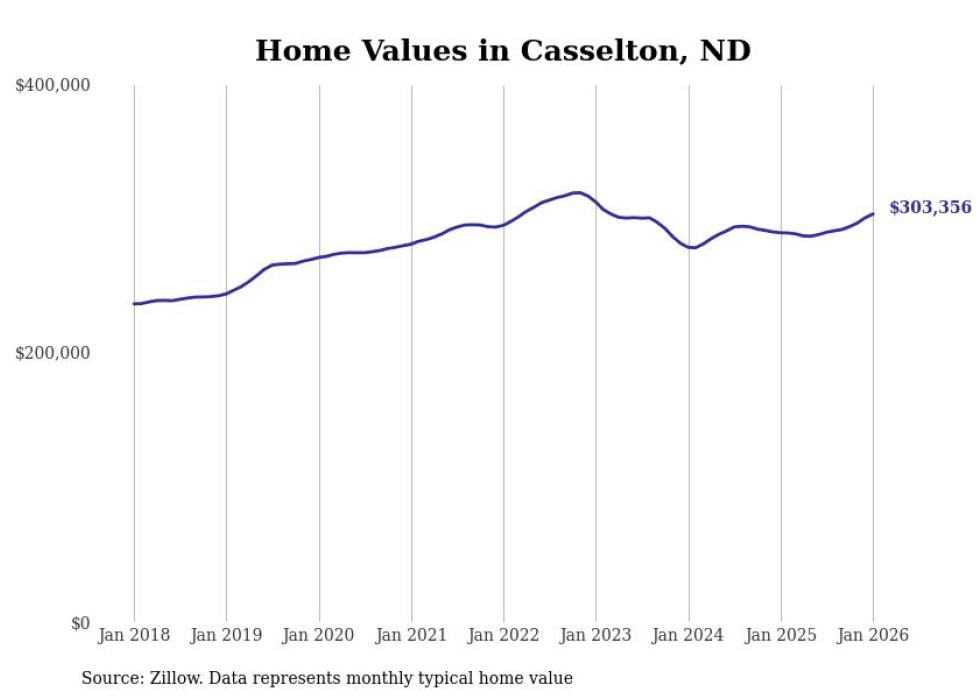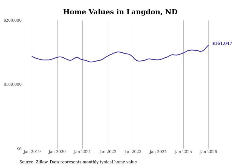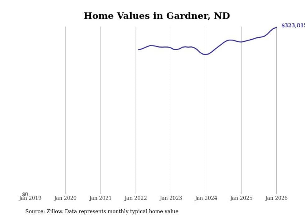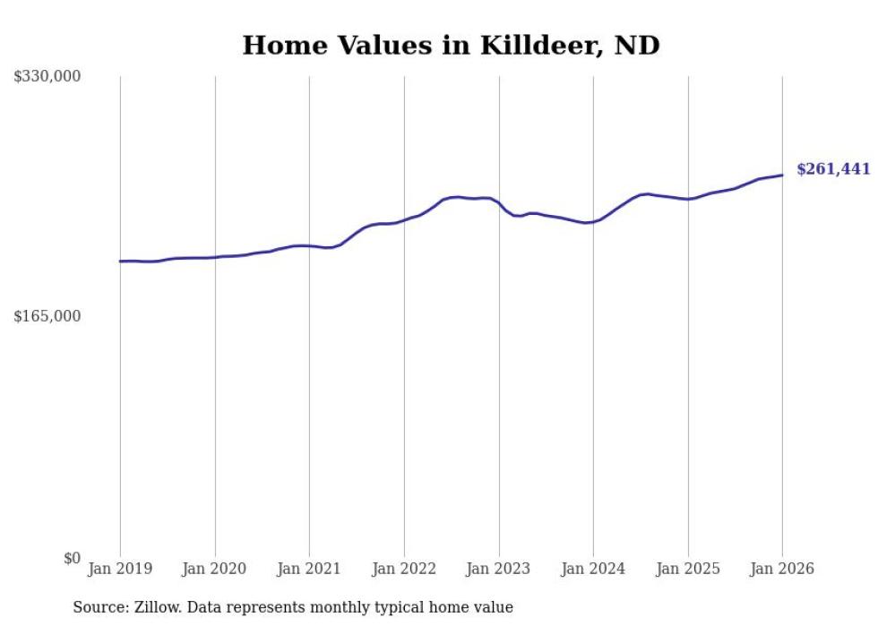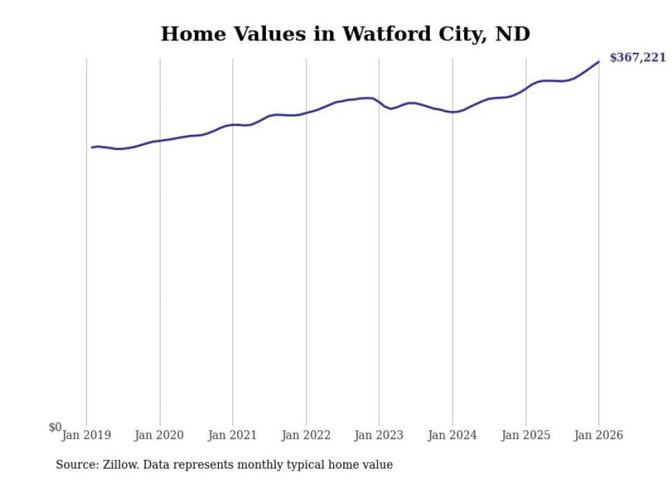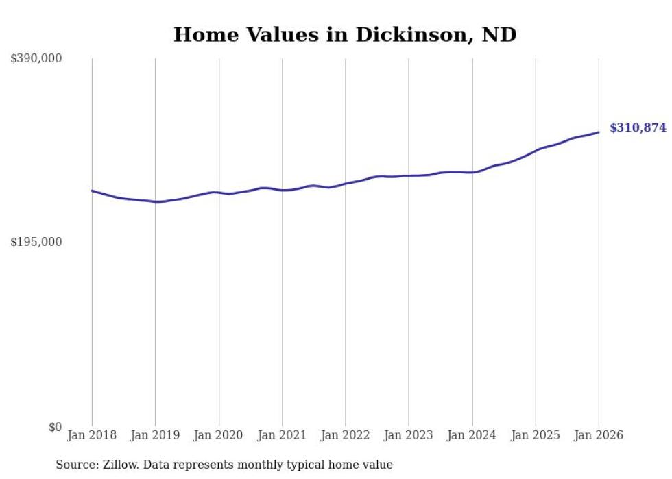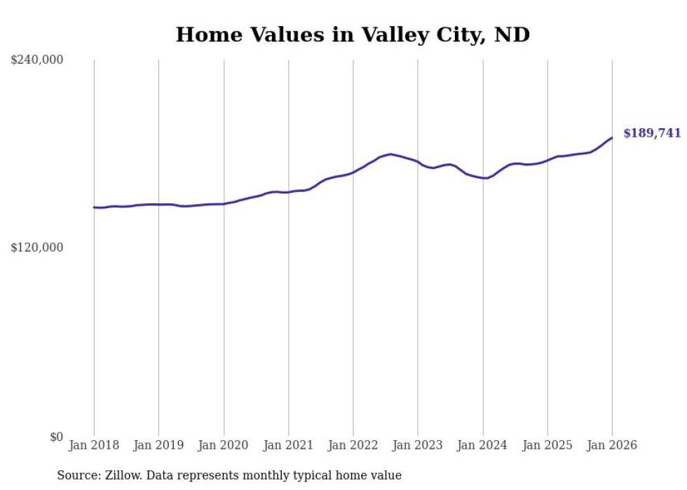 Stacker compiled a list of cities with the fastest-growing home prices in North Dakota using data from Zillow. Cities are ranked by the dollar change in the Zillow Home Values Index for all homes from the 12 months ending January 2026. The charts in this story were created automatically using Matplotlib. Data was available for 50 cities and towns in North Dakota.