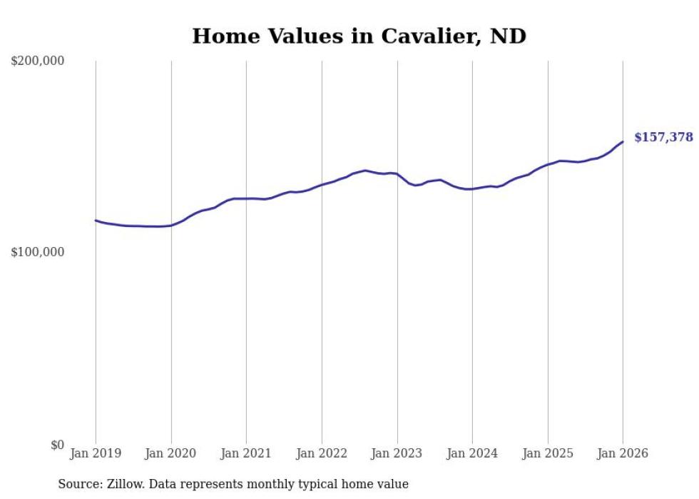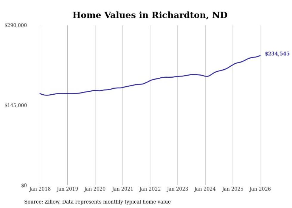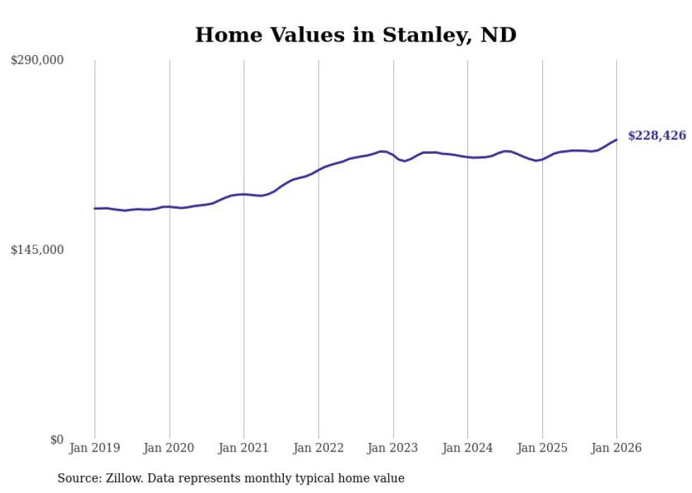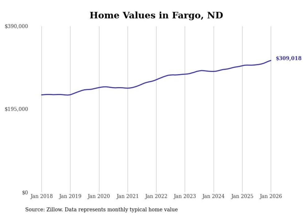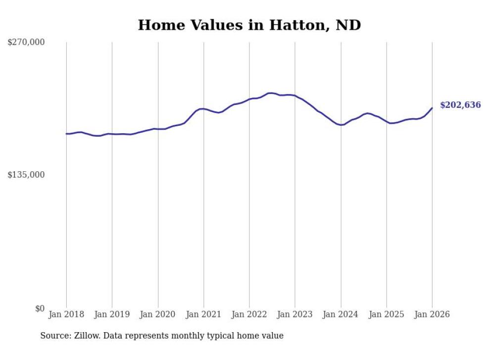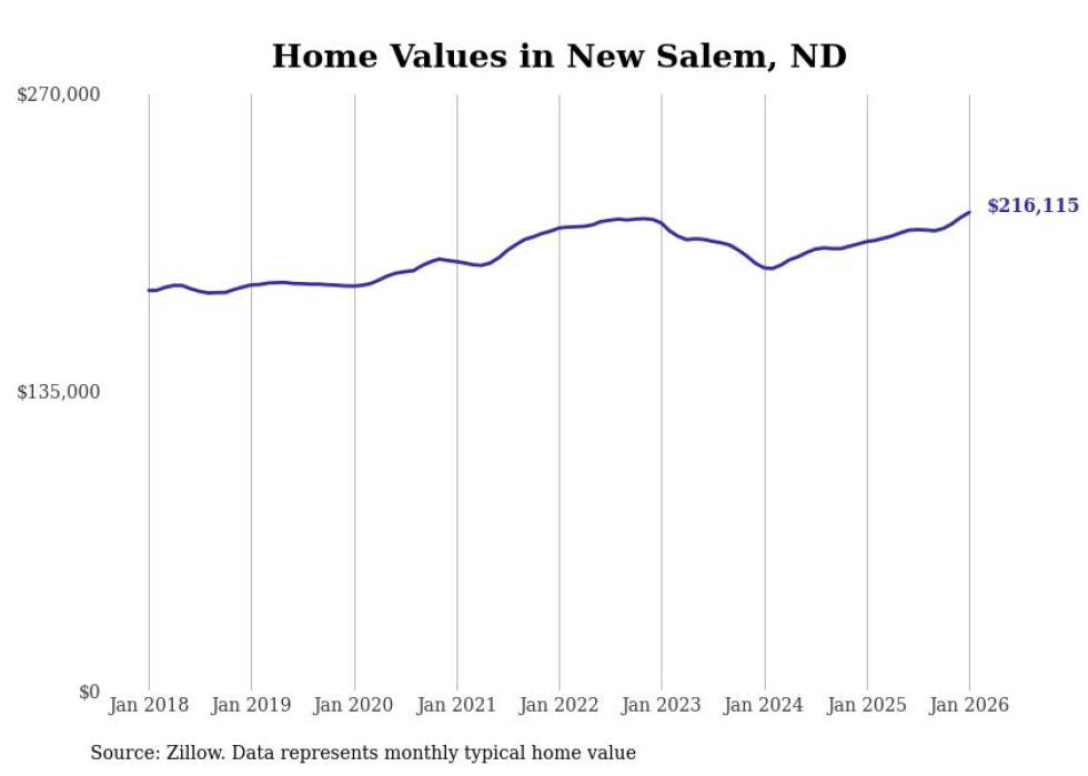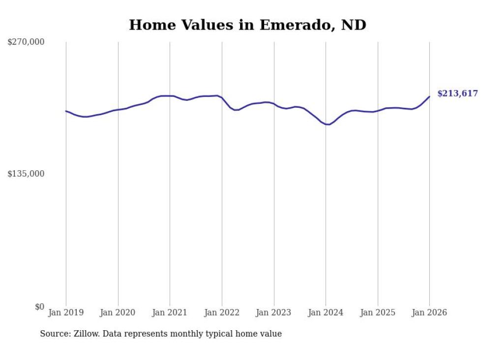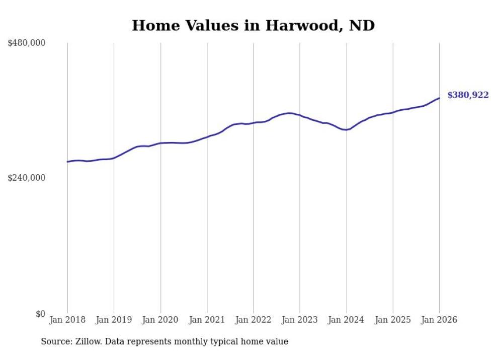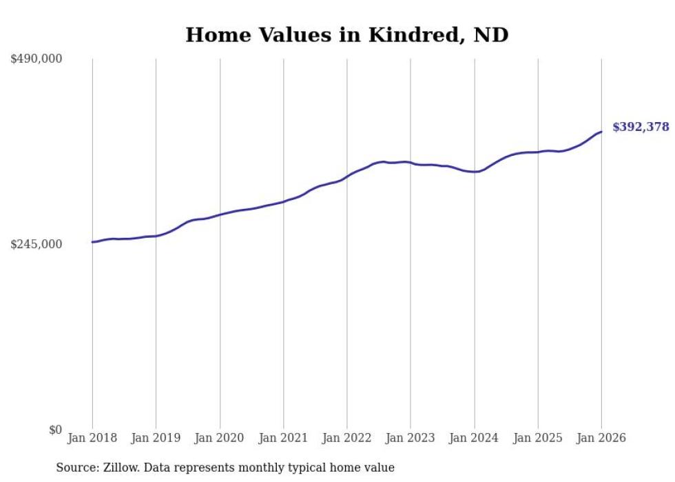 Stacker compiled a list of cities with the fastest-growing home prices in North Dakota using data from Zillow. Cities are ranked by the dollar change in the Zillow Home Values Index for all homes from the 12 months ending January 2026. The charts in this story were created automatically using Matplotlib. Data was available for 50 cities and towns in North Dakota.