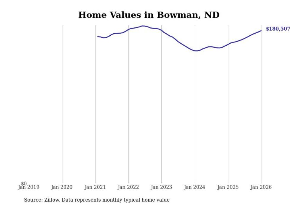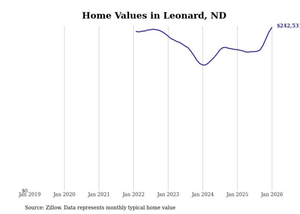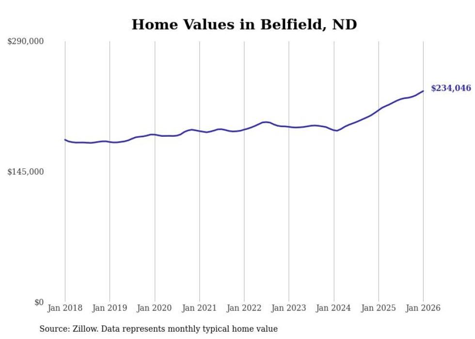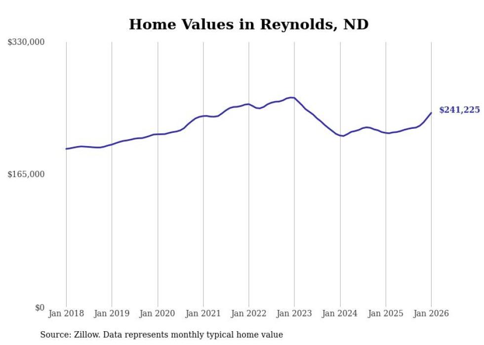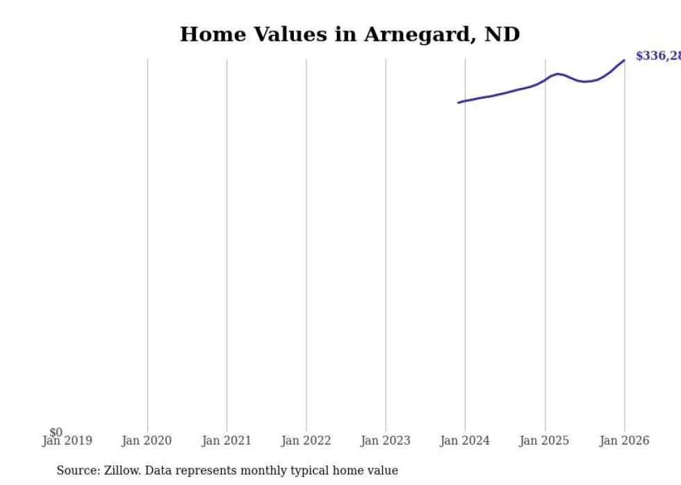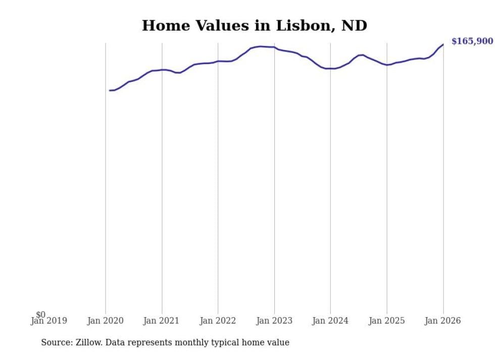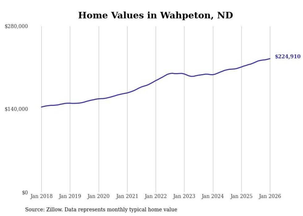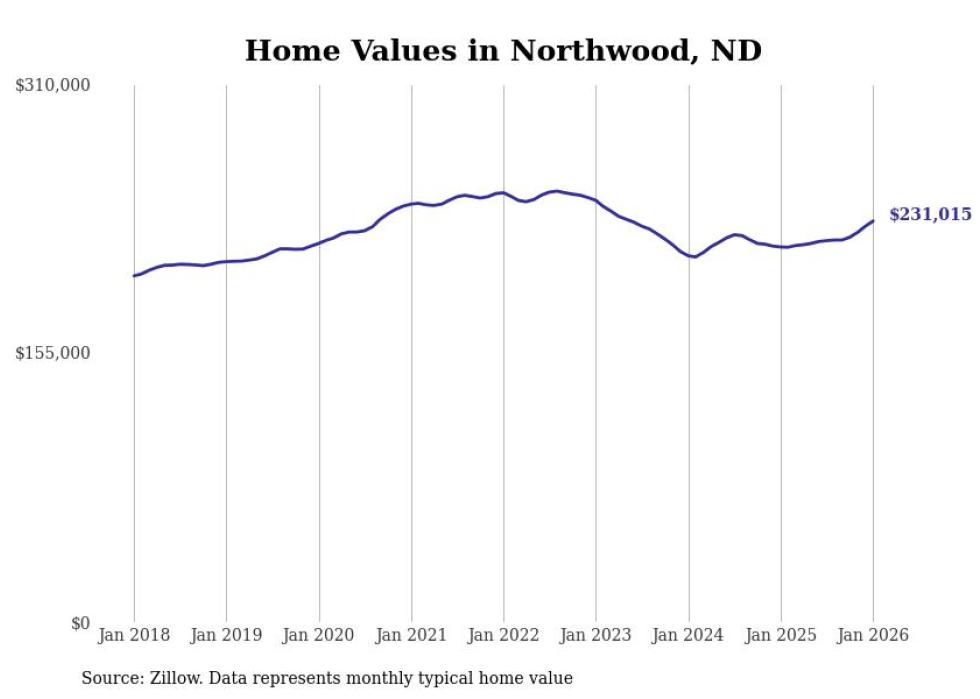 Stacker compiled a list of cities with the fastest-growing home prices in North Dakota using data from Zillow. Cities are ranked by the dollar change in the Zillow Home Values Index for all homes from the 12 months ending January 2026. The charts in this story were created automatically using Matplotlib. Data was available for 50 cities and towns in North Dakota.