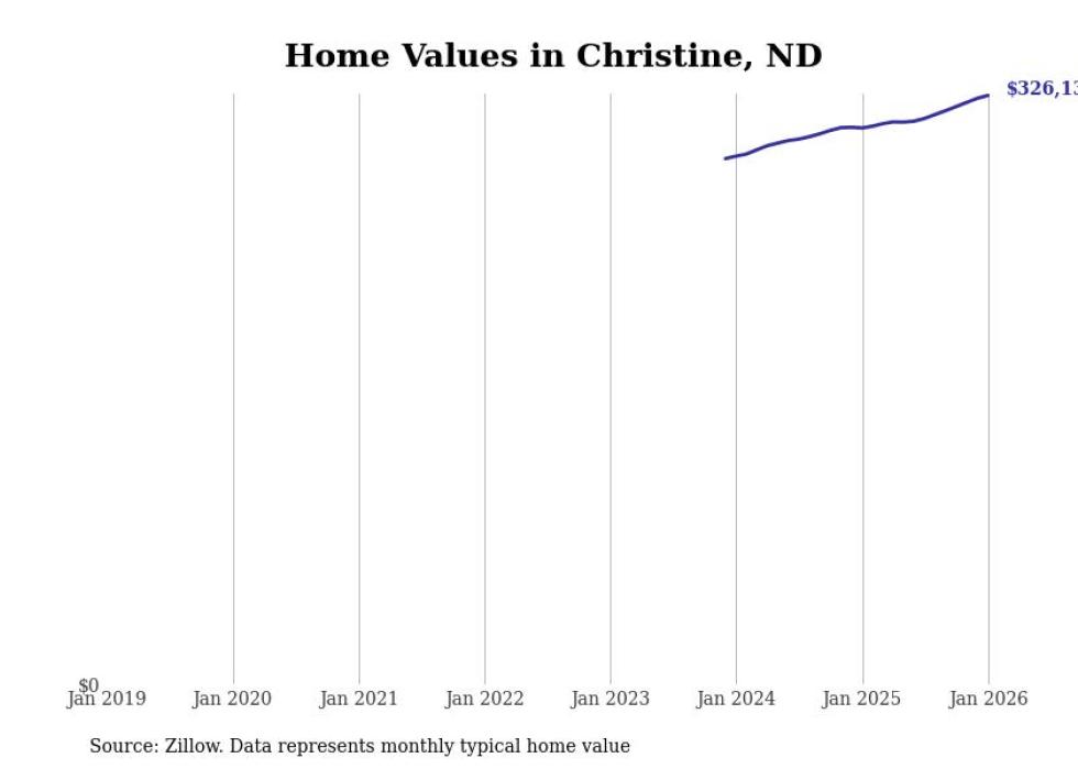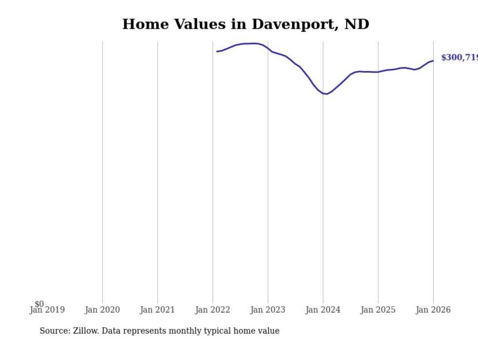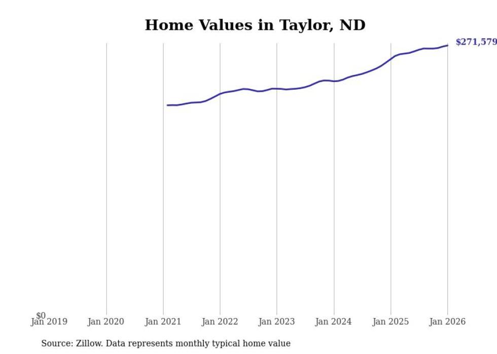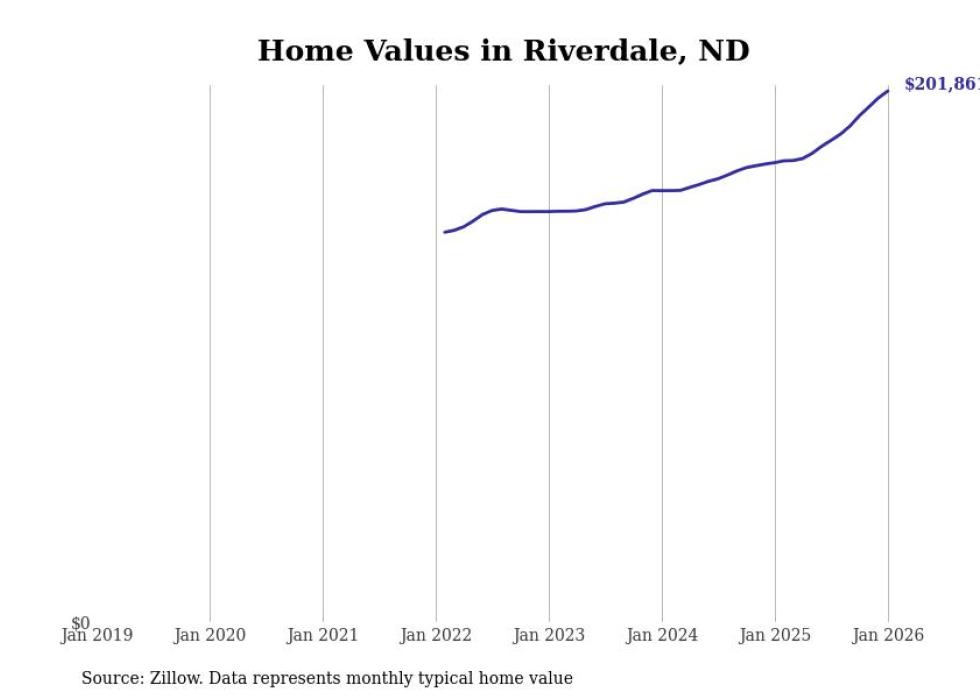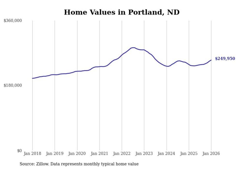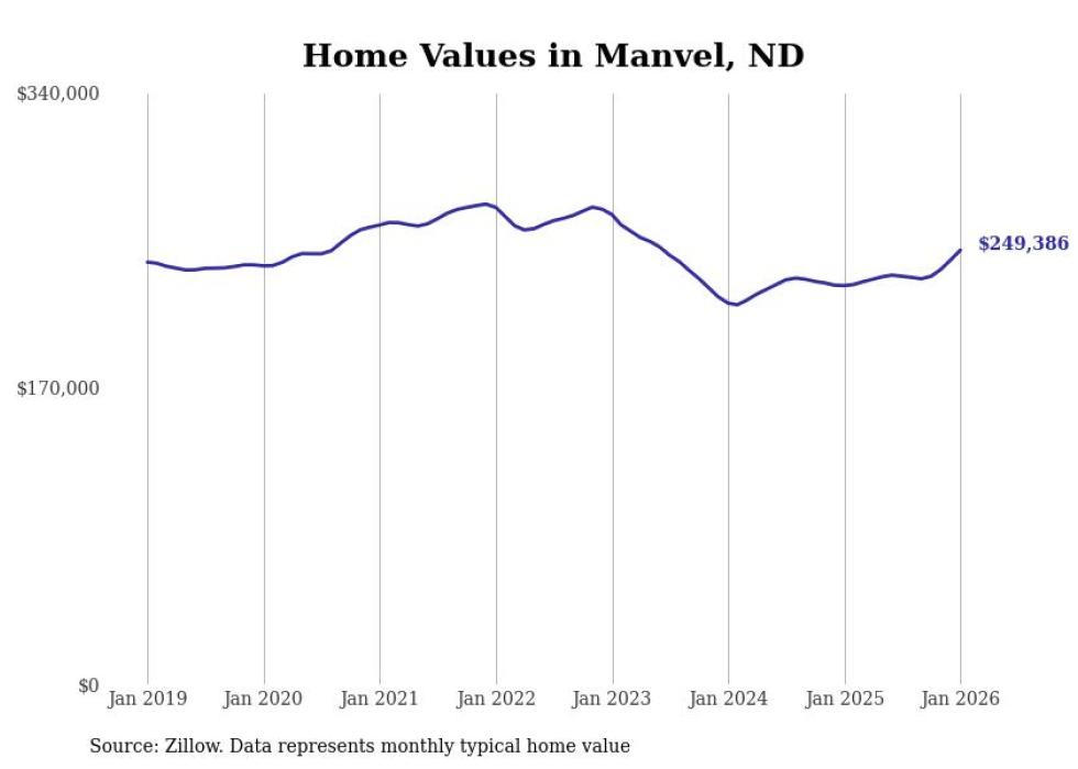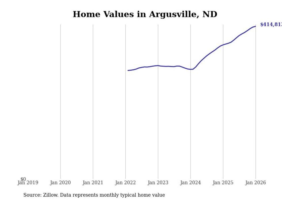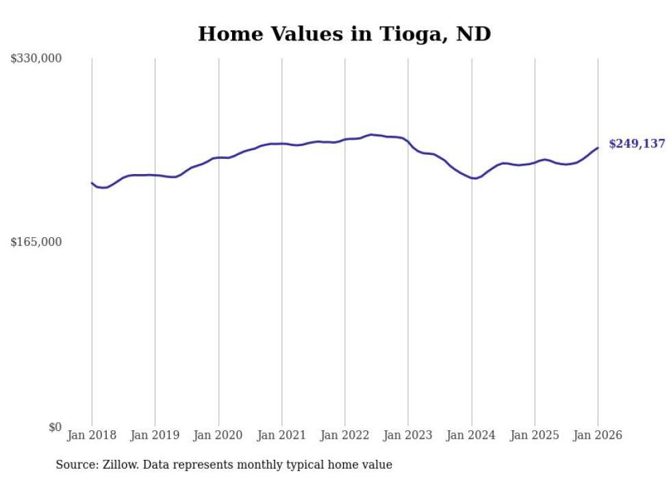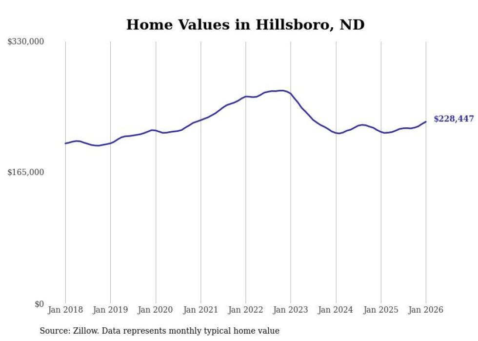 Stacker compiled a list of cities with the fastest-growing home prices in North Dakota using data from Zillow. Cities are ranked by the dollar change in the Zillow Home Values Index for all homes from the 12 months ending January 2026. The charts in this story were created automatically using Matplotlib. Data was available for 50 cities and towns in North Dakota.
