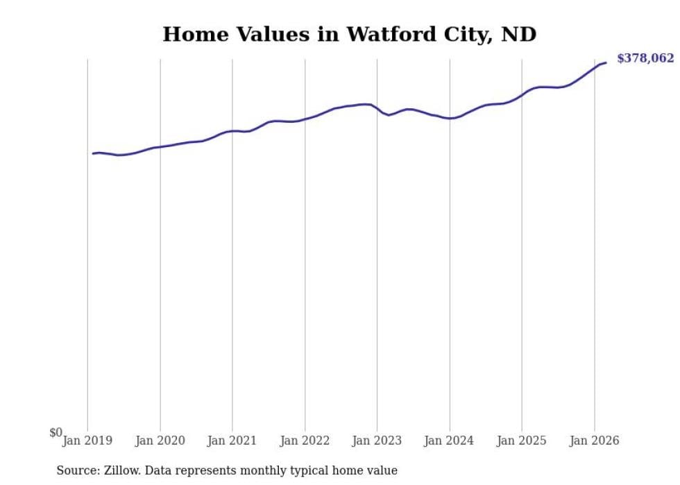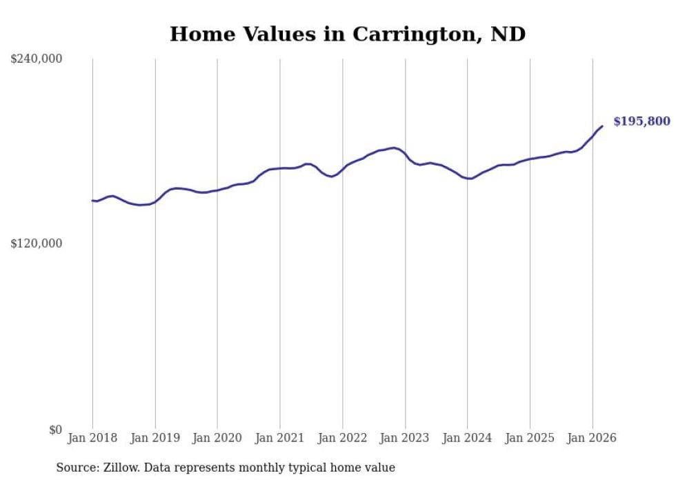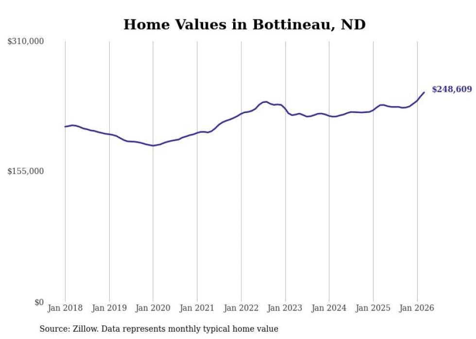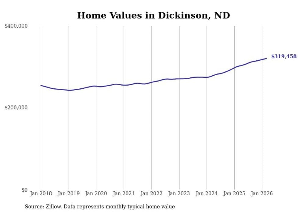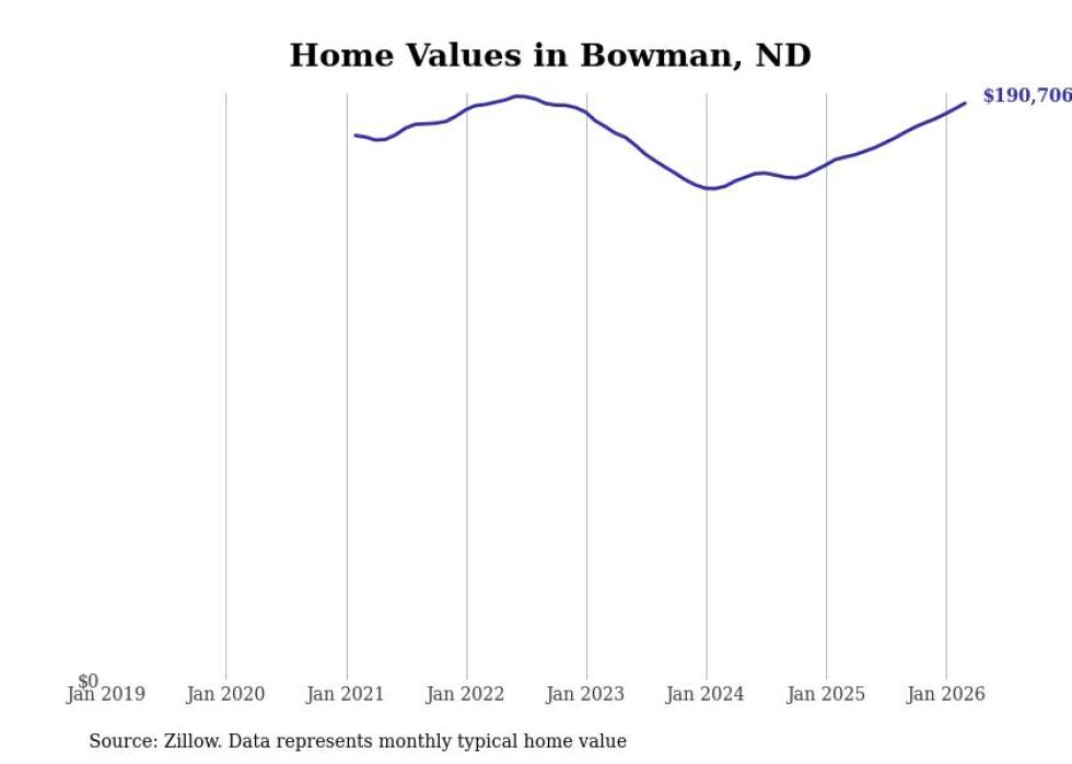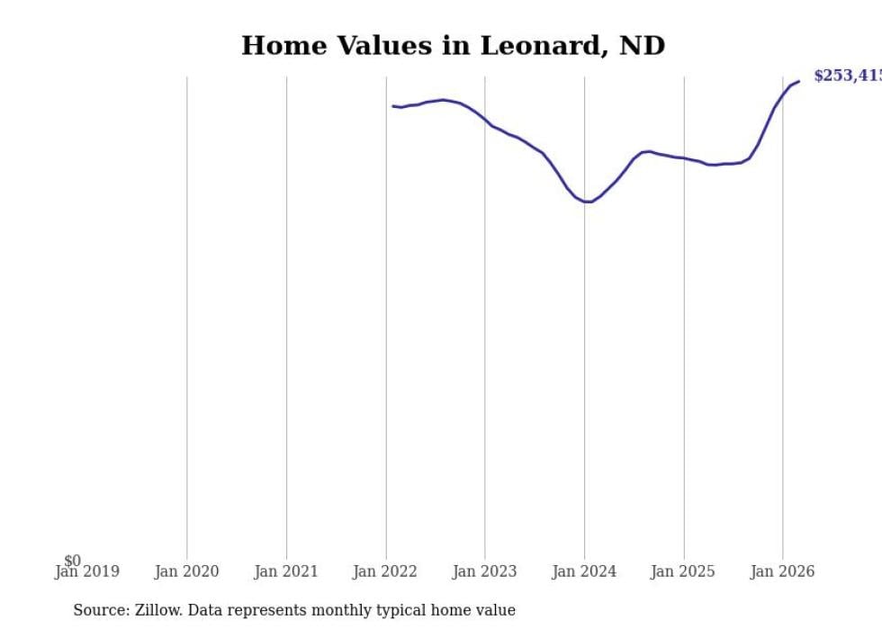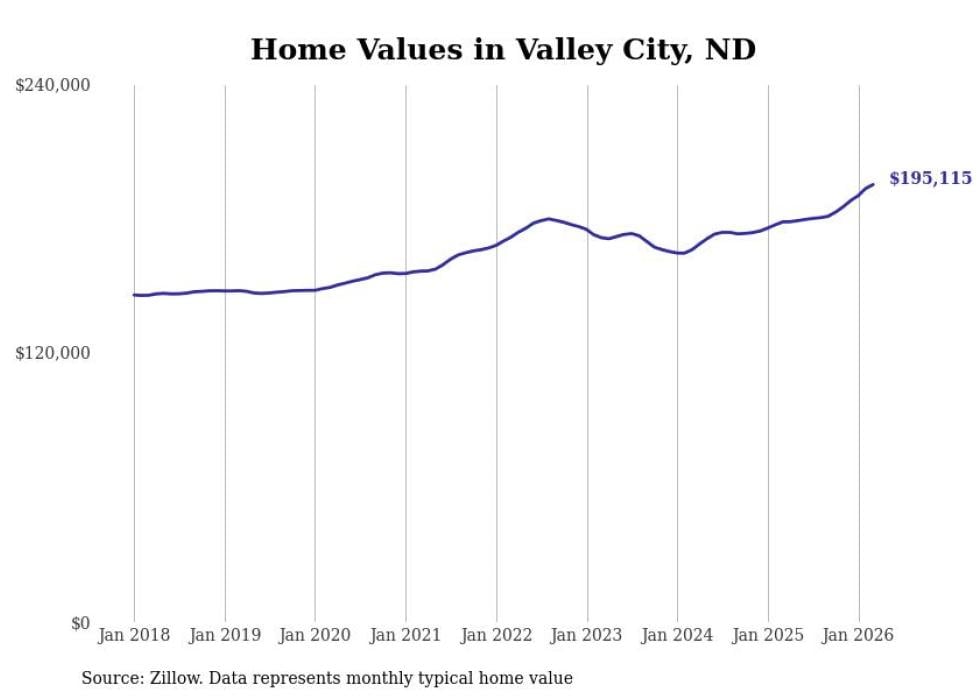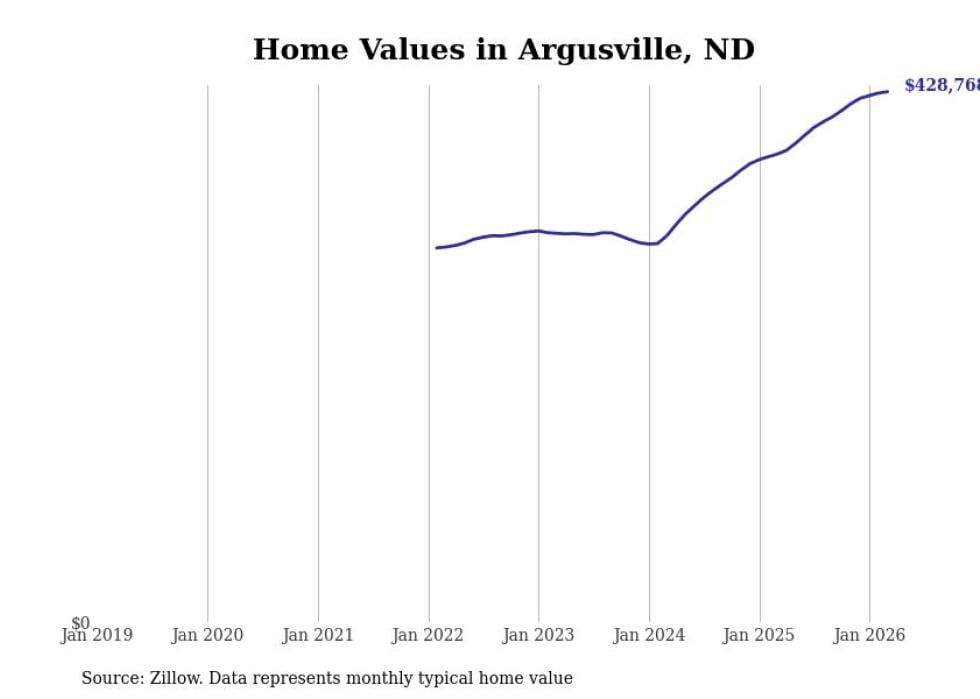 Stacker compiled a list of cities with the fastest-growing home prices in North Dakota using data from Zillow. Cities are ranked by the dollar change in the Zillow Home Values Index for all homes from the 12 months ending March 2026. The charts in this story were created automatically using Matplotlib. Data was available for 50 cities and towns in North Dakota.