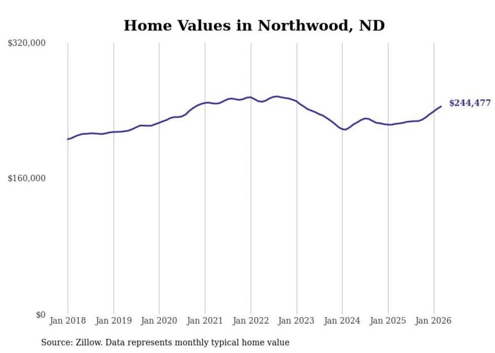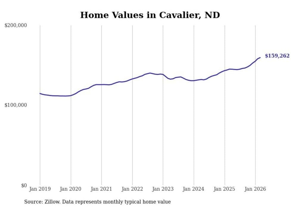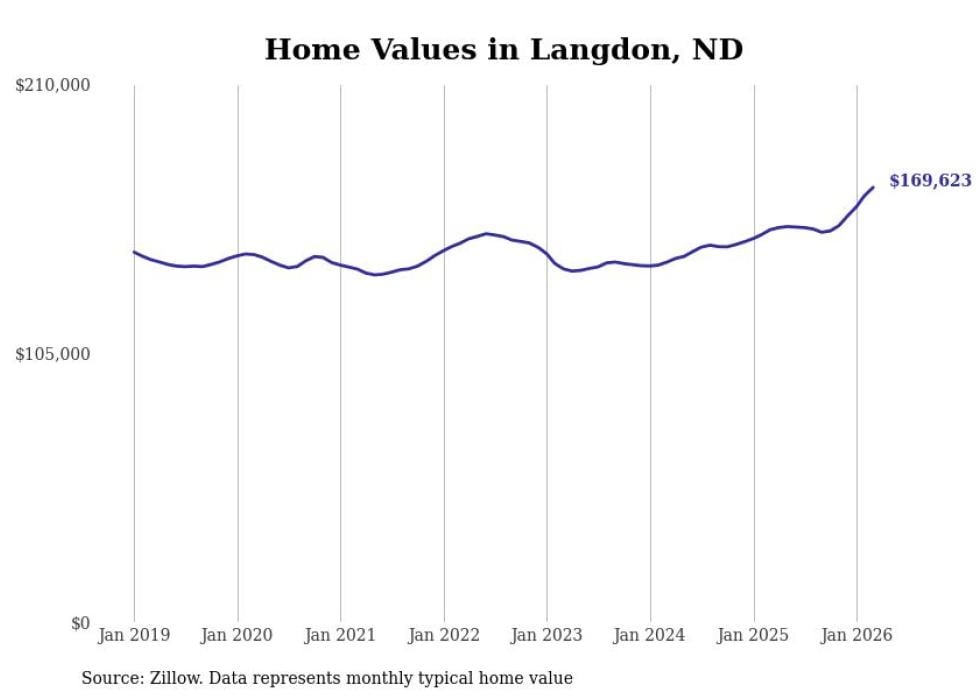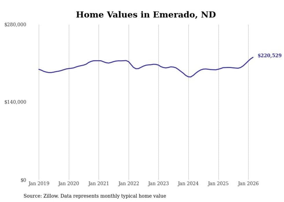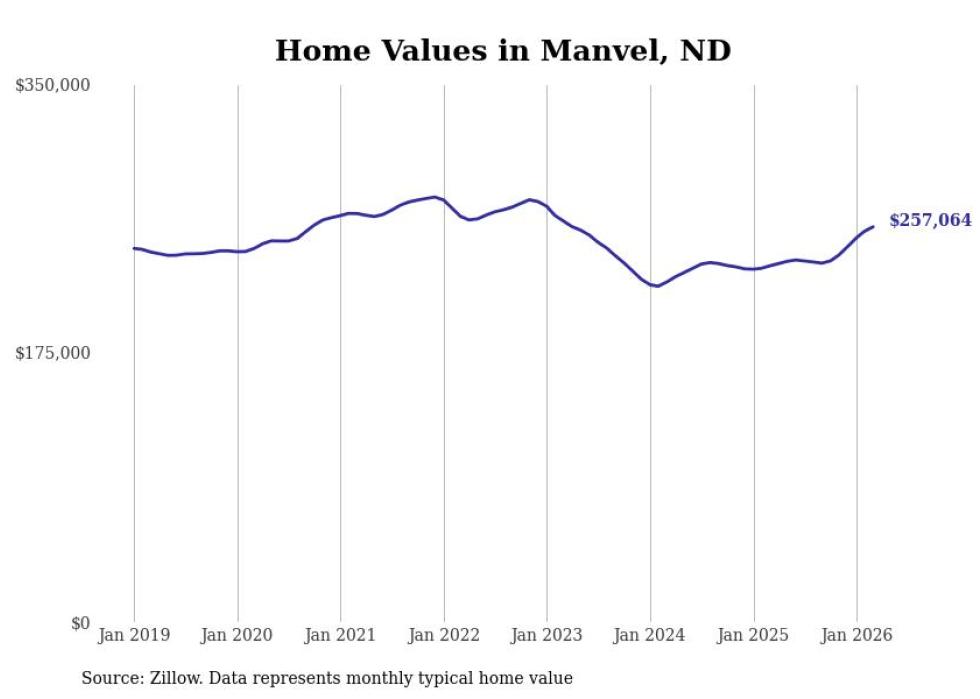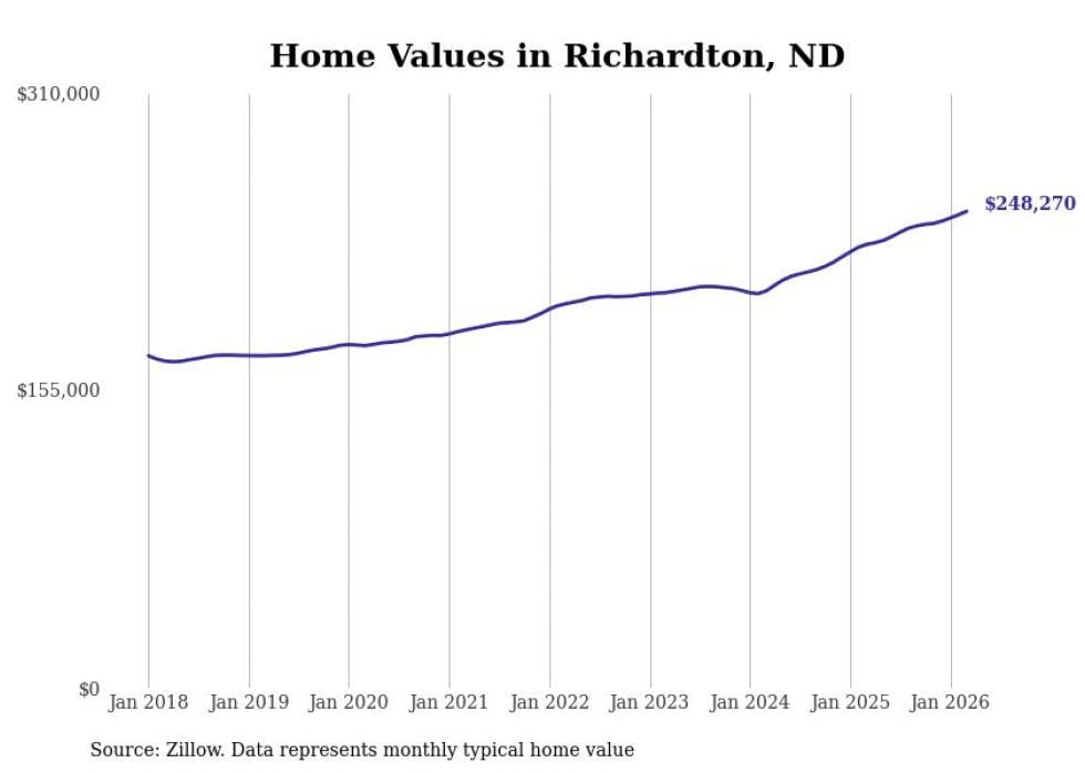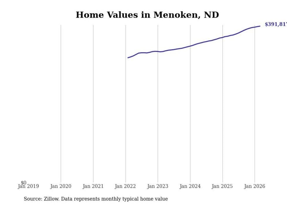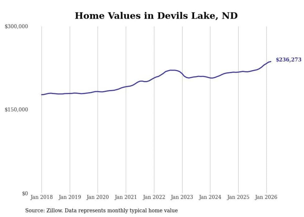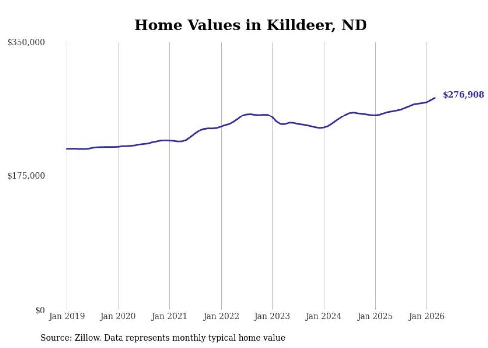 Stacker compiled a list of cities with the fastest-growing home prices in North Dakota using data from Zillow. Cities are ranked by the dollar change in the Zillow Home Values Index for all homes from the 12 months ending March 2026. The charts in this story were created automatically using Matplotlib. Data was available for 50 cities and towns in North Dakota.