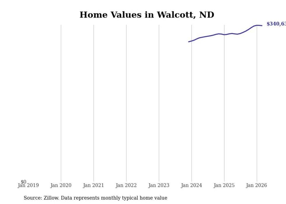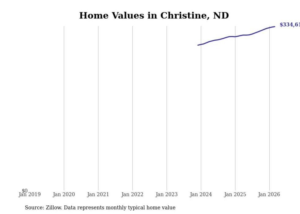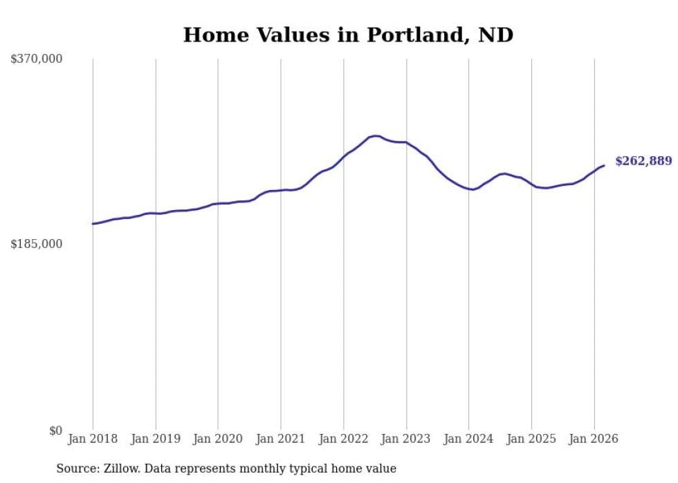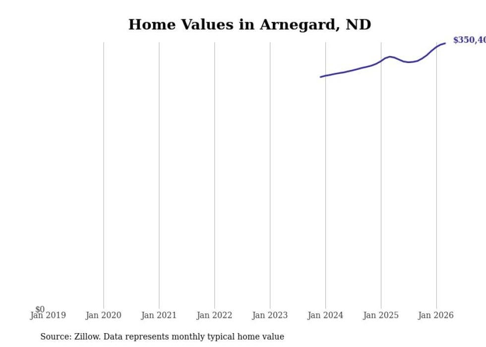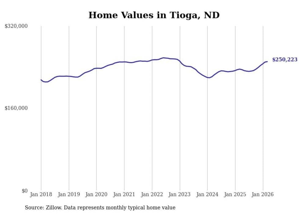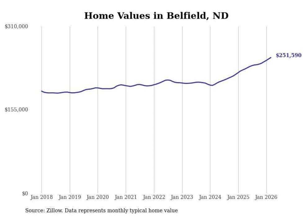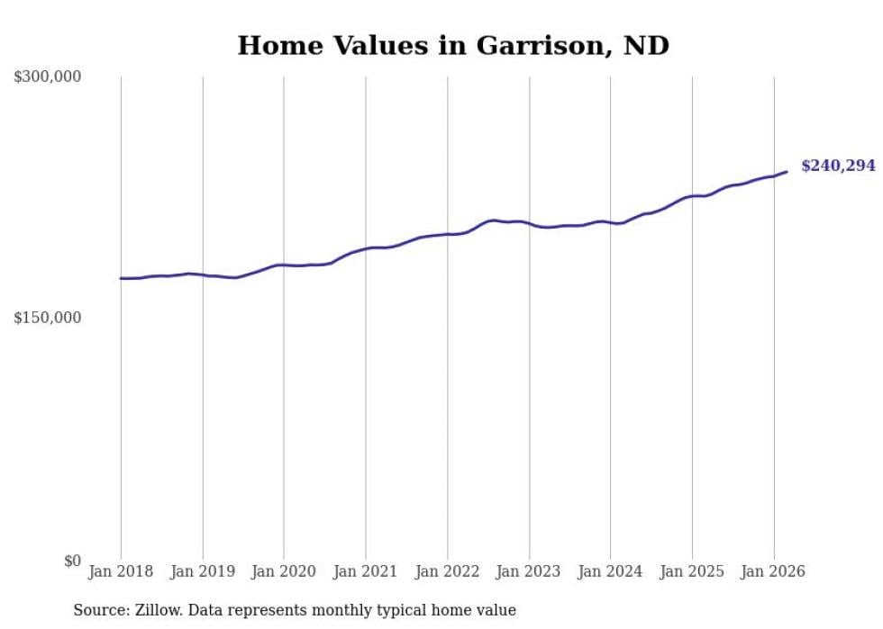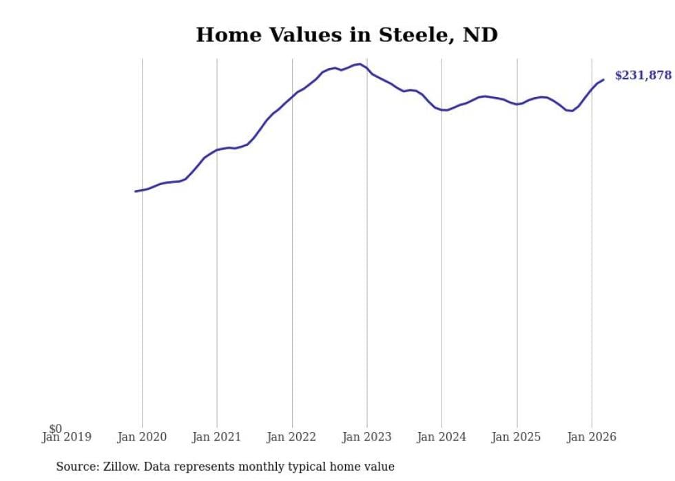 Stacker compiled a list of cities with the fastest-growing home prices in North Dakota using data from Zillow. Cities are ranked by the dollar change in the Zillow Home Values Index for all homes from the 12 months ending March 2026. The charts in this story were created automatically using Matplotlib. Data was available for 50 cities and towns in North Dakota.