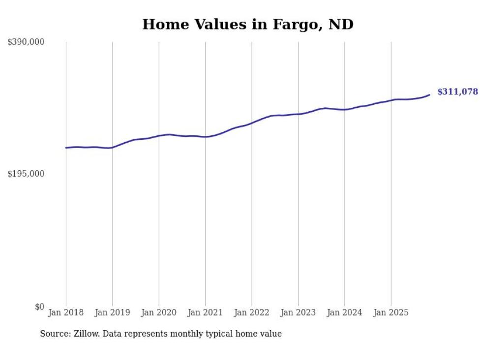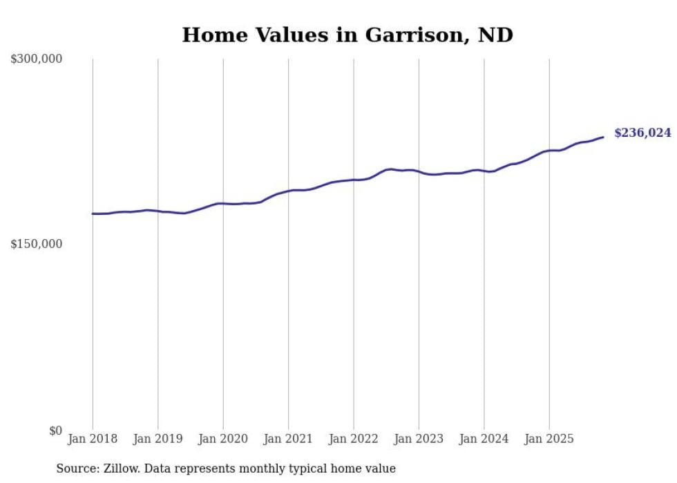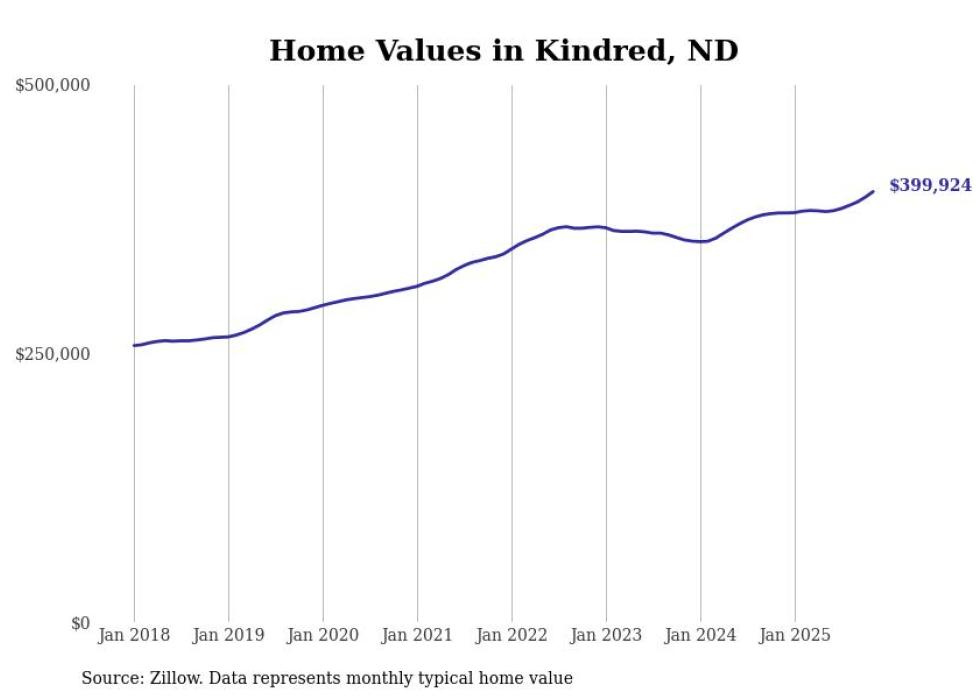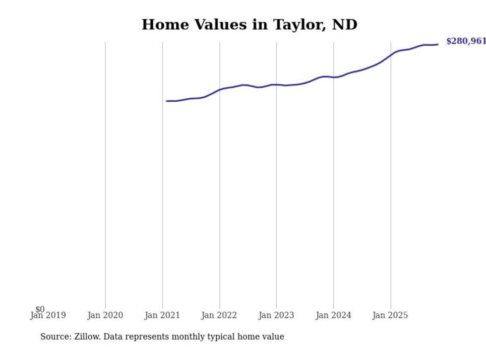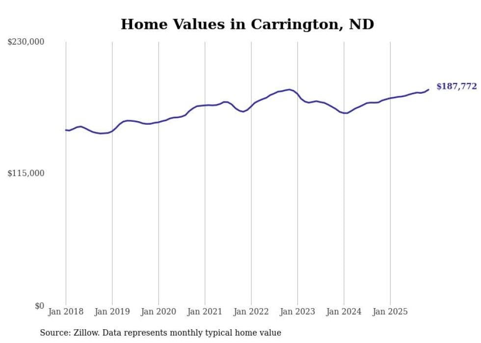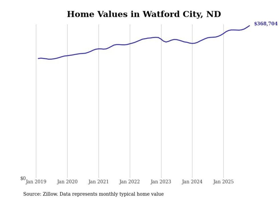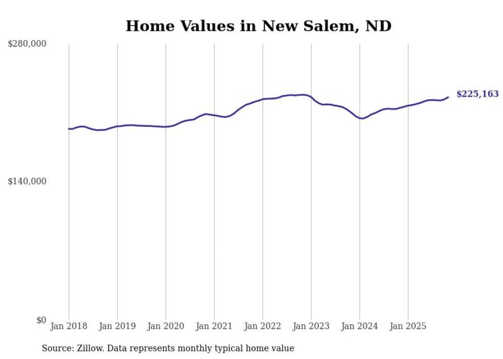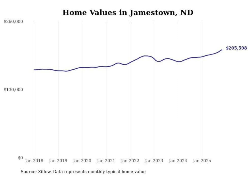 Stacker compiled a list of cities with the fastest-growing home prices in North Dakota using data from Zillow. Cities are ranked by the dollar change in the Zillow Home Values Index for all homes from the 12 months ending November 2025. The charts in this story were created automatically using Matplotlib. Data was available for 50 cities and towns in North Dakota.