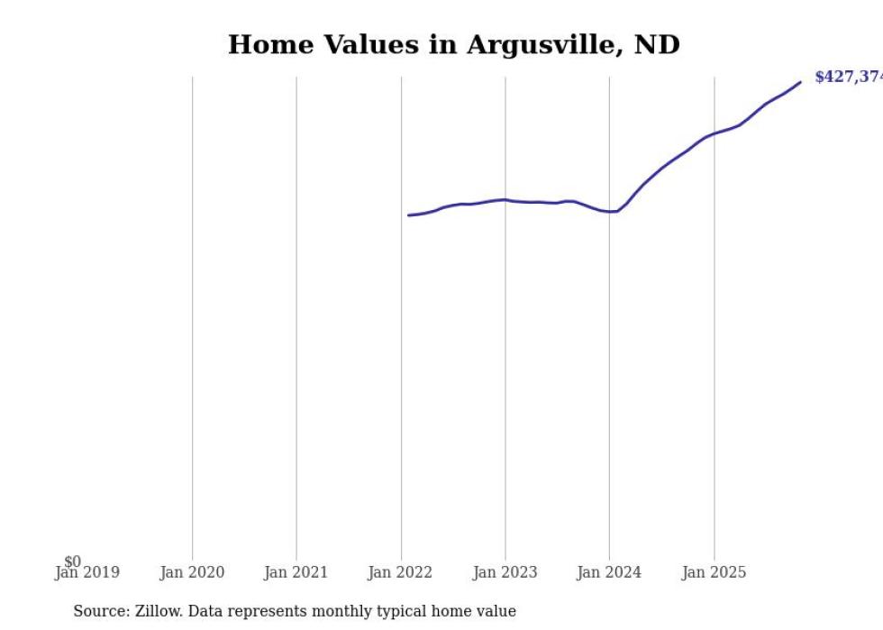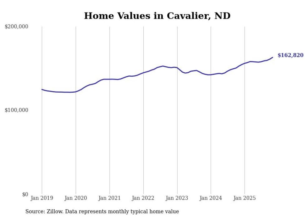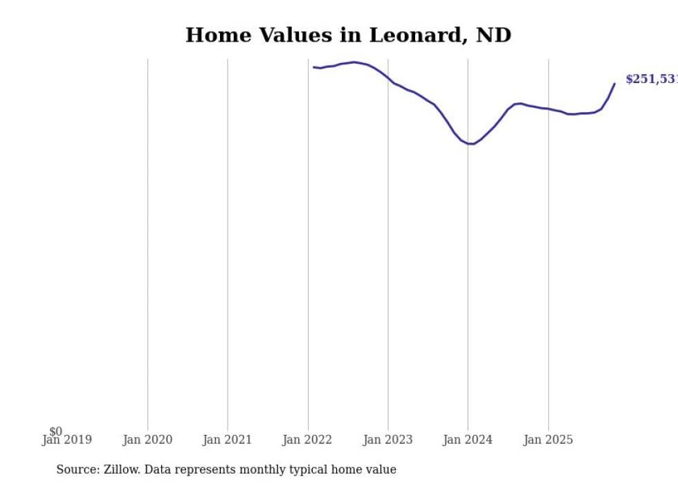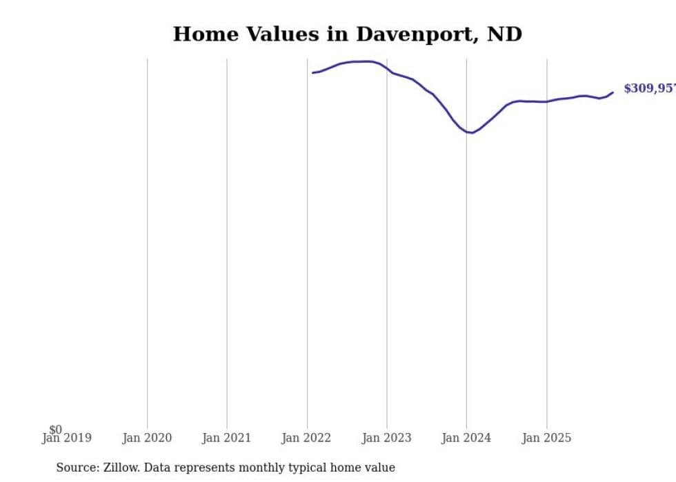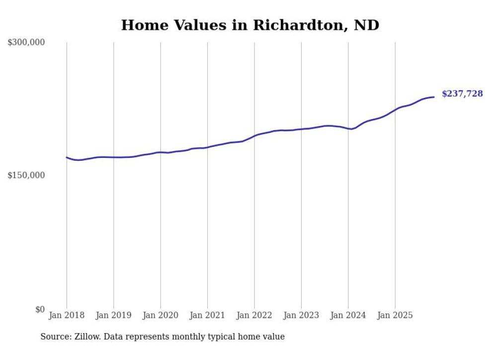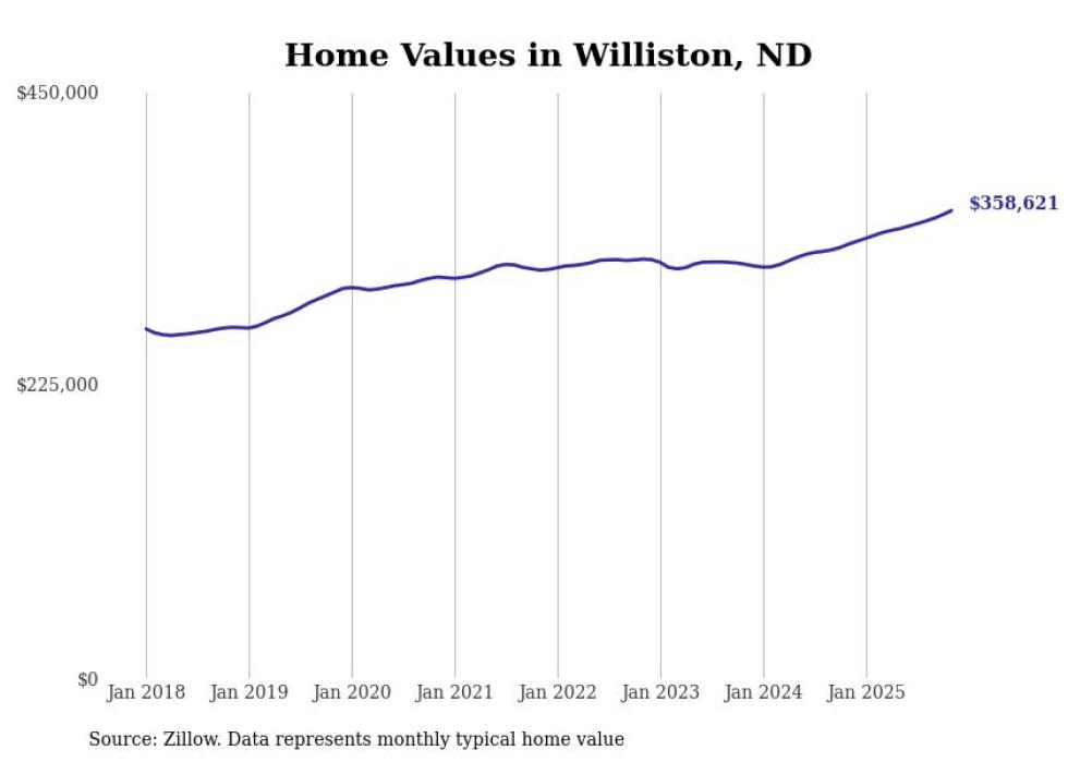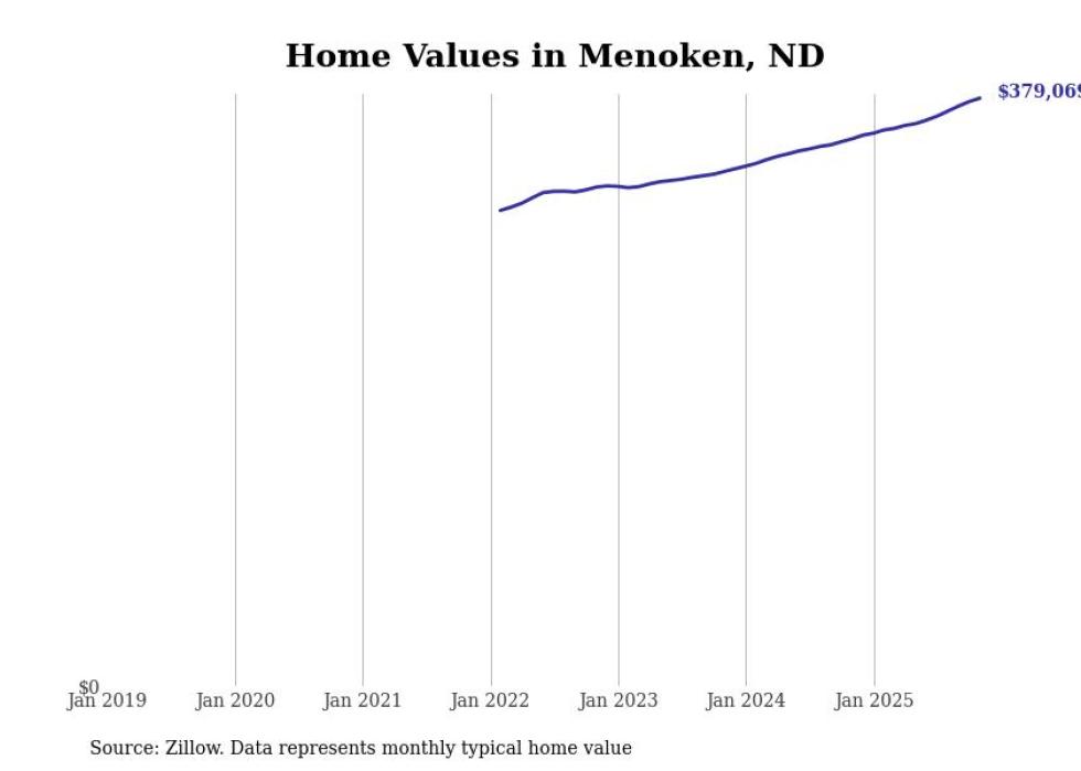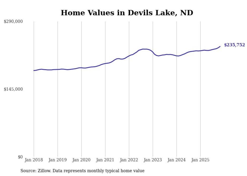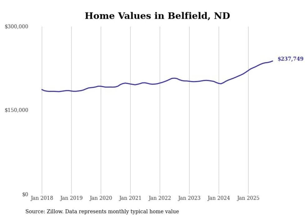 Stacker compiled a list of cities with the fastest-growing home prices in North Dakota using data from Zillow. Cities are ranked by the dollar change in the Zillow Home Values Index for all homes from the 12 months ending November 2025. The charts in this story were created automatically using Matplotlib. Data was available for 50 cities and towns in North Dakota.