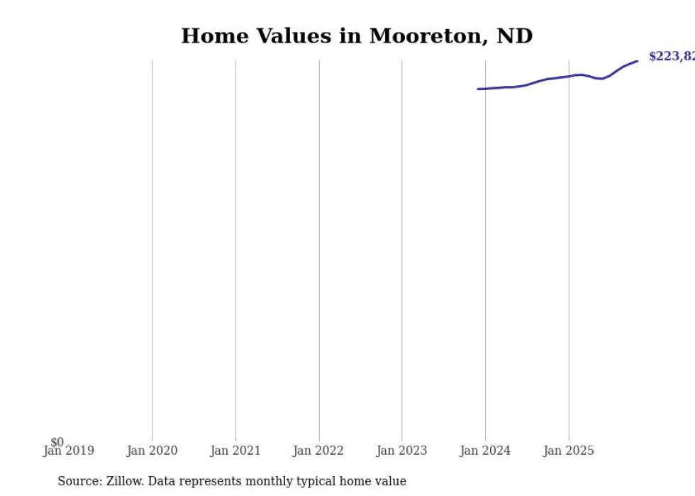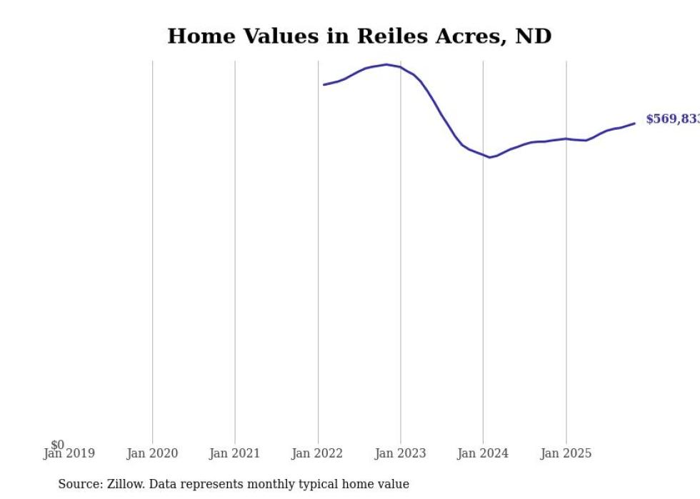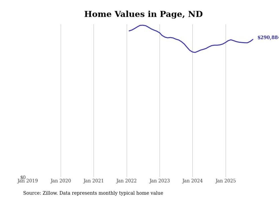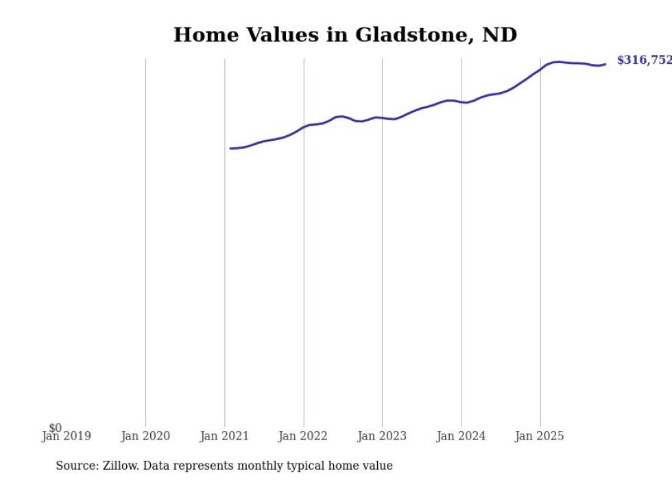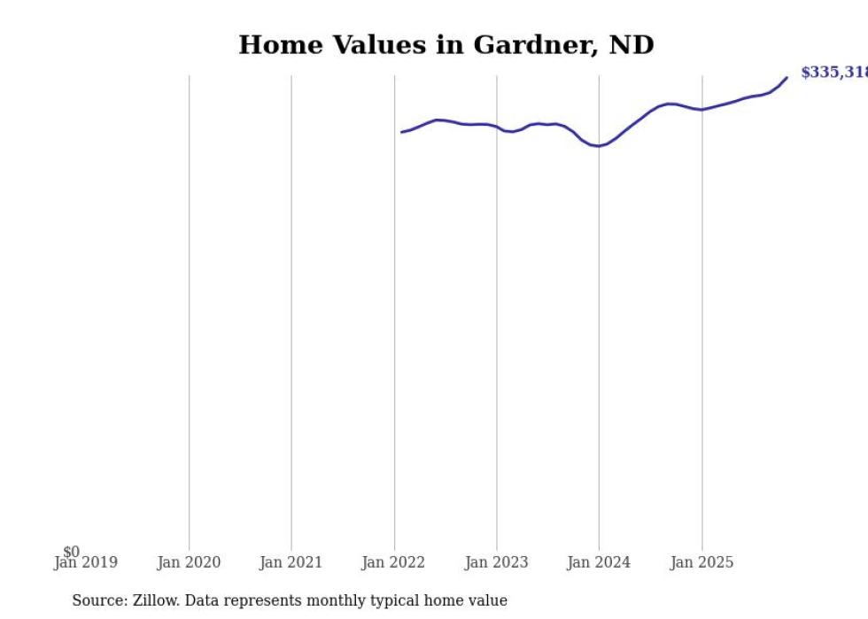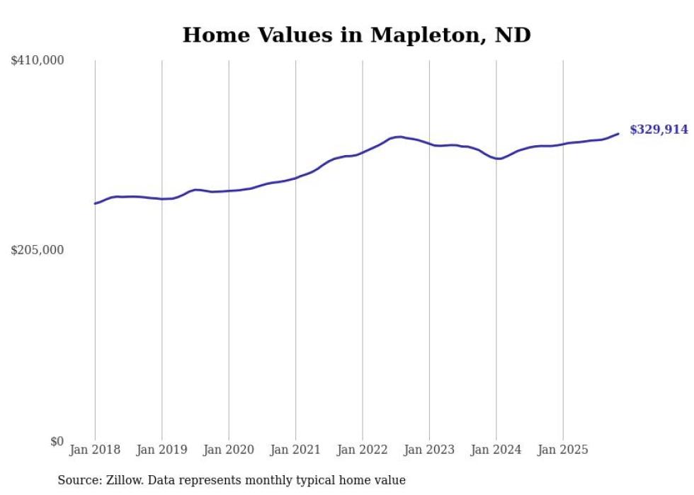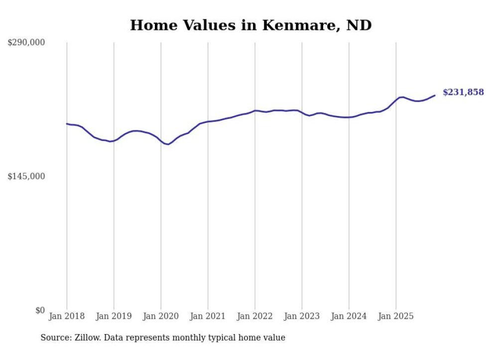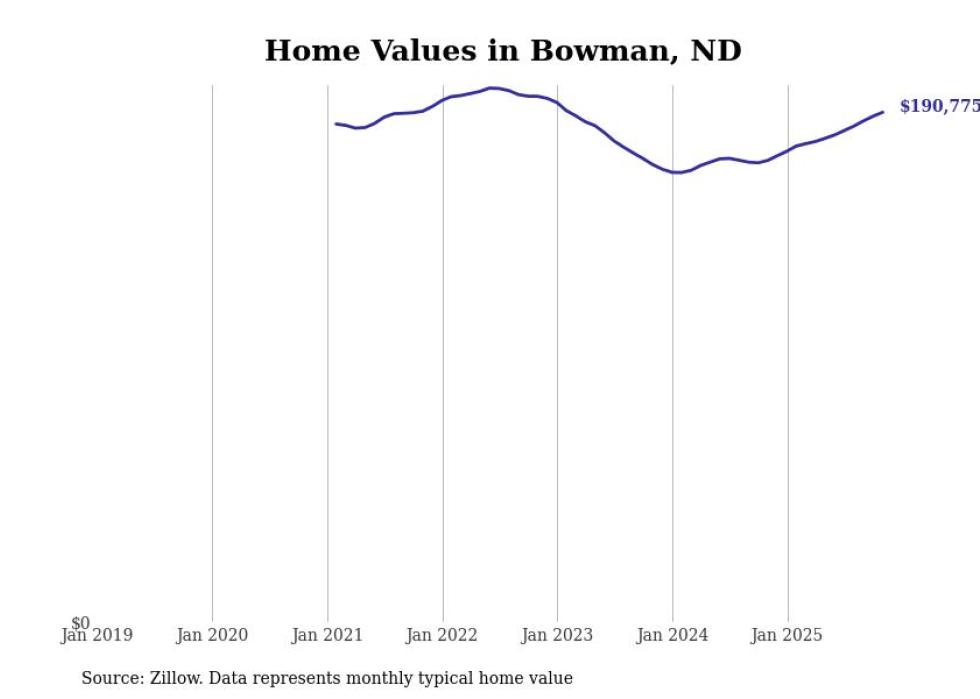 Stacker compiled a list of cities with the fastest-growing home prices in North Dakota using data from Zillow. Cities are ranked by the dollar change in the Zillow Home Values Index for all homes from the 12 months ending November 2025. The charts in this story were created automatically using Matplotlib. Data was available for 50 cities and towns in North Dakota.