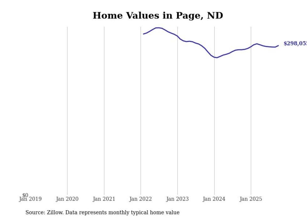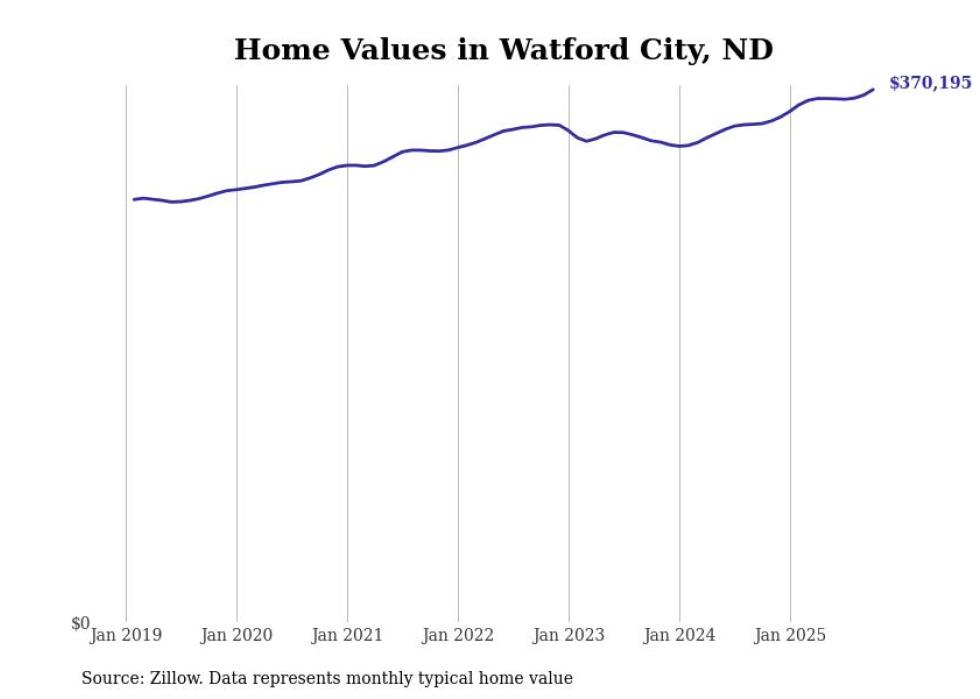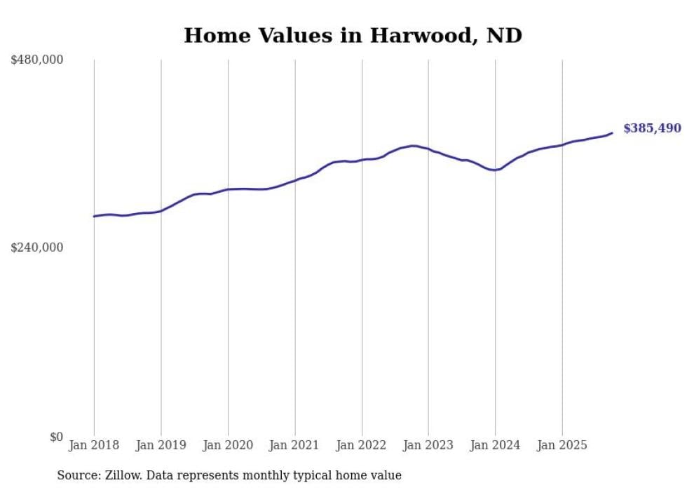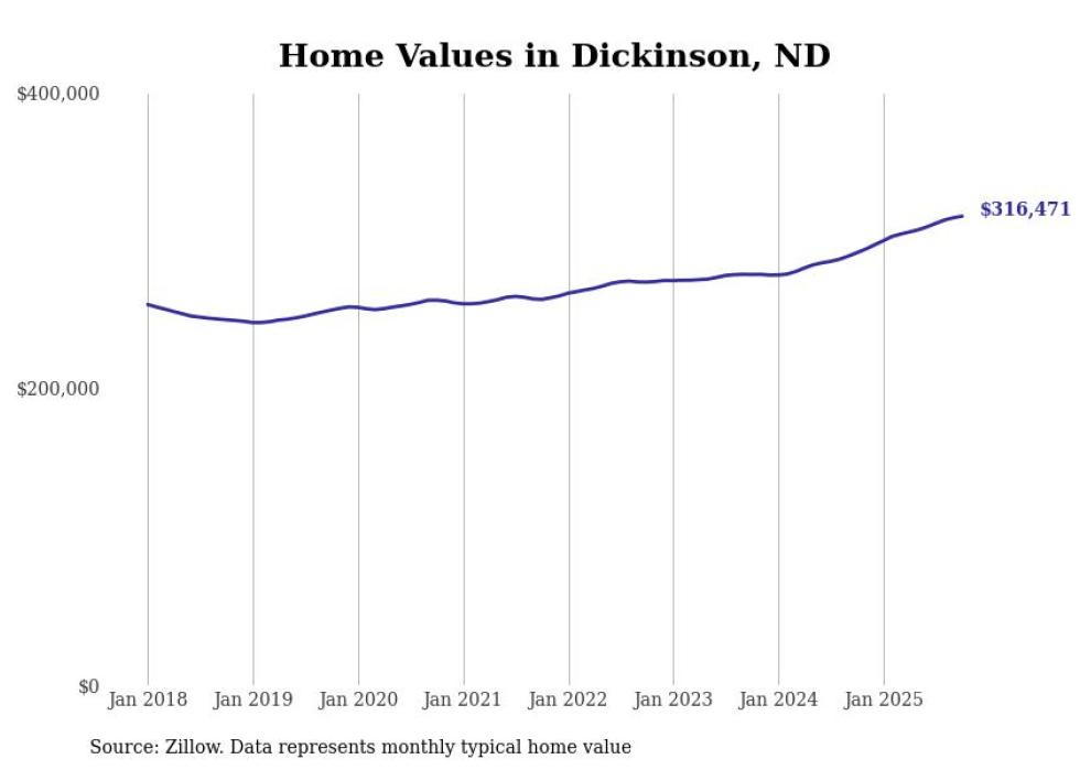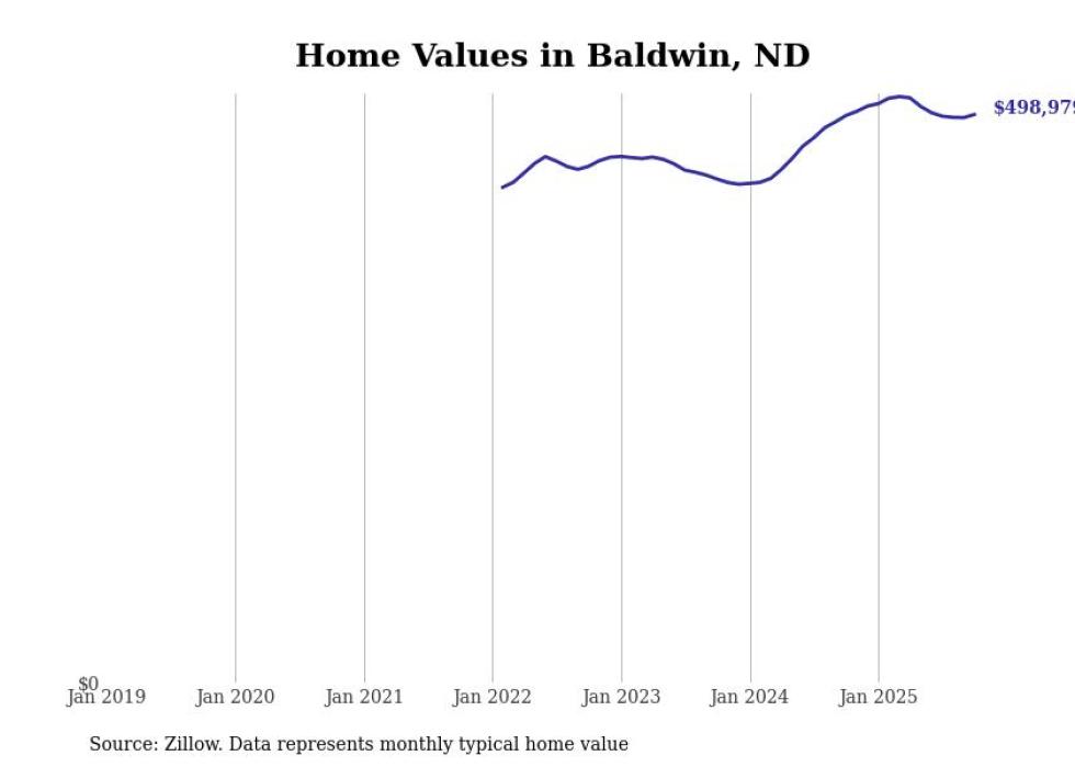Stacker compiled a list of cities with the most expensive homes in North Dakota using data from Zillow. Cities are ranked by the Zillow Home Values Index for all homes as of October 2025. The charts in this story were created automatically using Matplotlib.