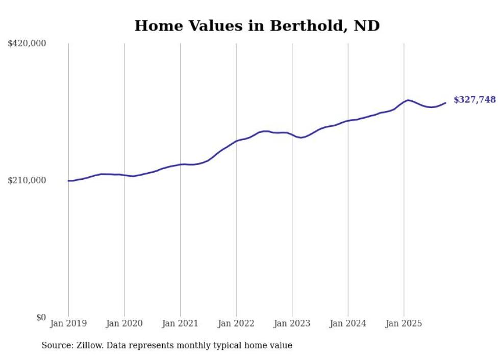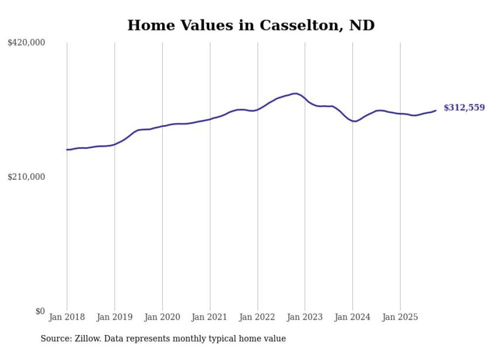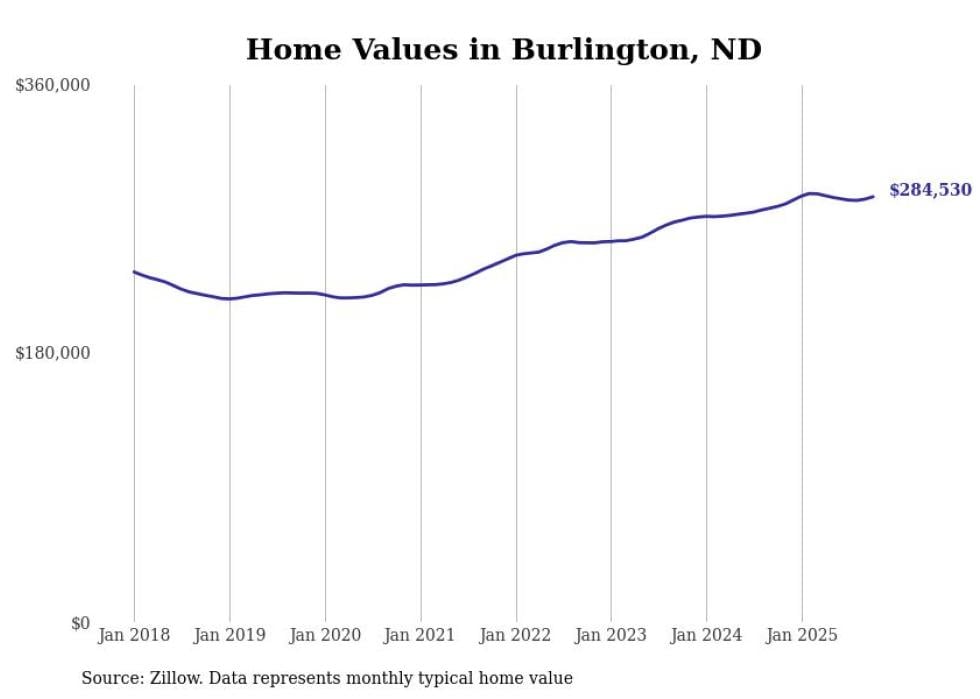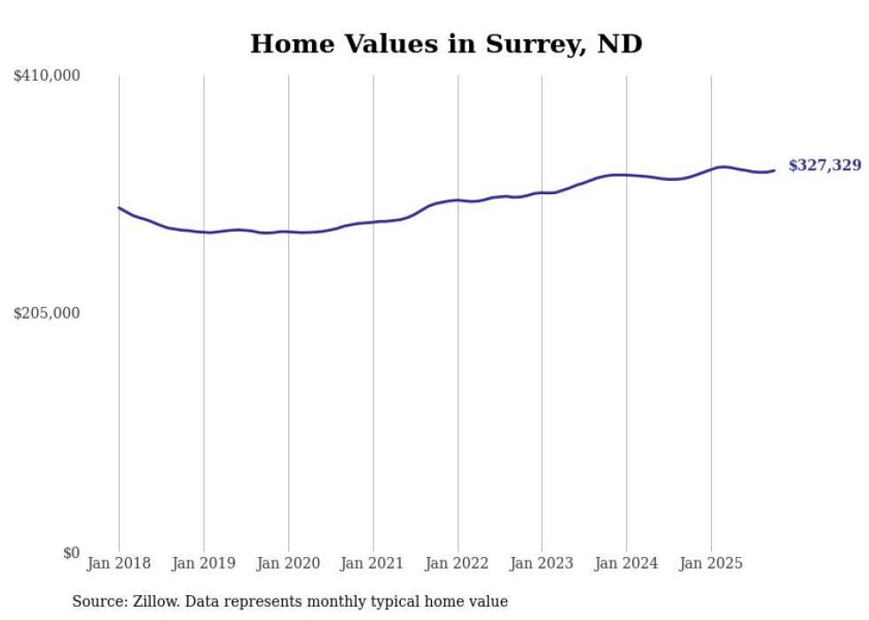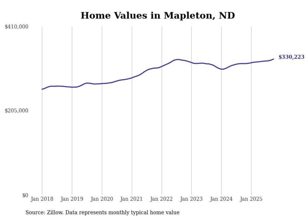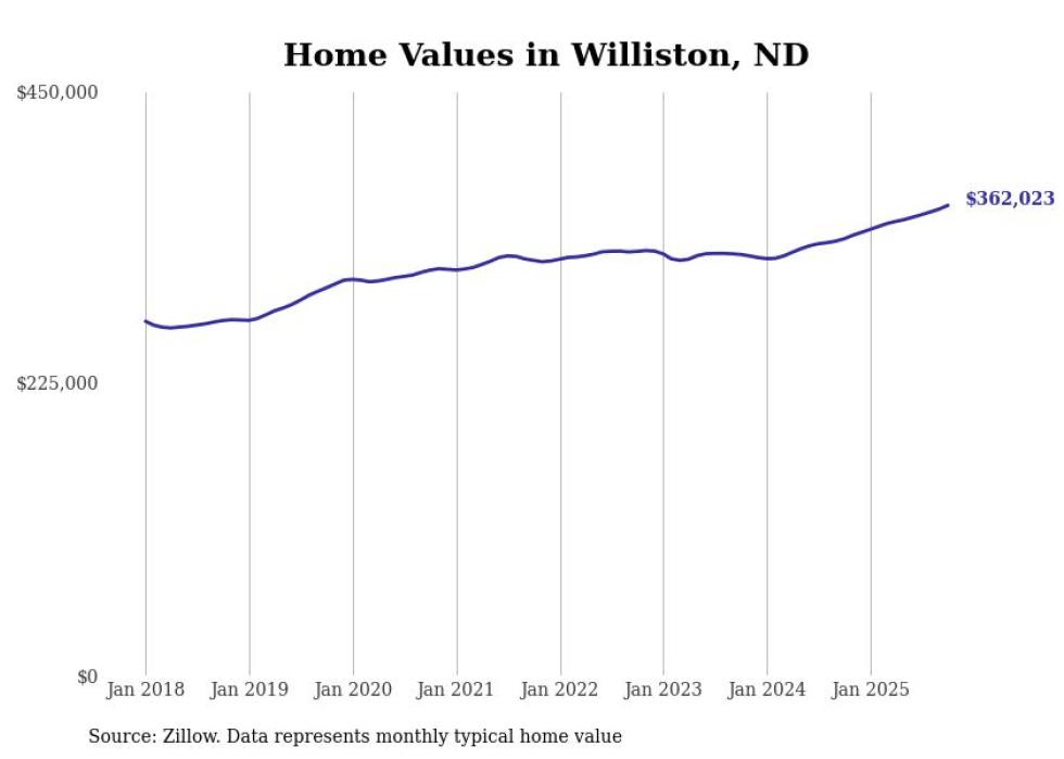 Stacker compiled a list of cities with the most expensive homes in North Dakota using data from Zillow. Cities are ranked by the Zillow Home Values Index for all homes as of October 2025. The charts in this story were created automatically using Matplotlib.