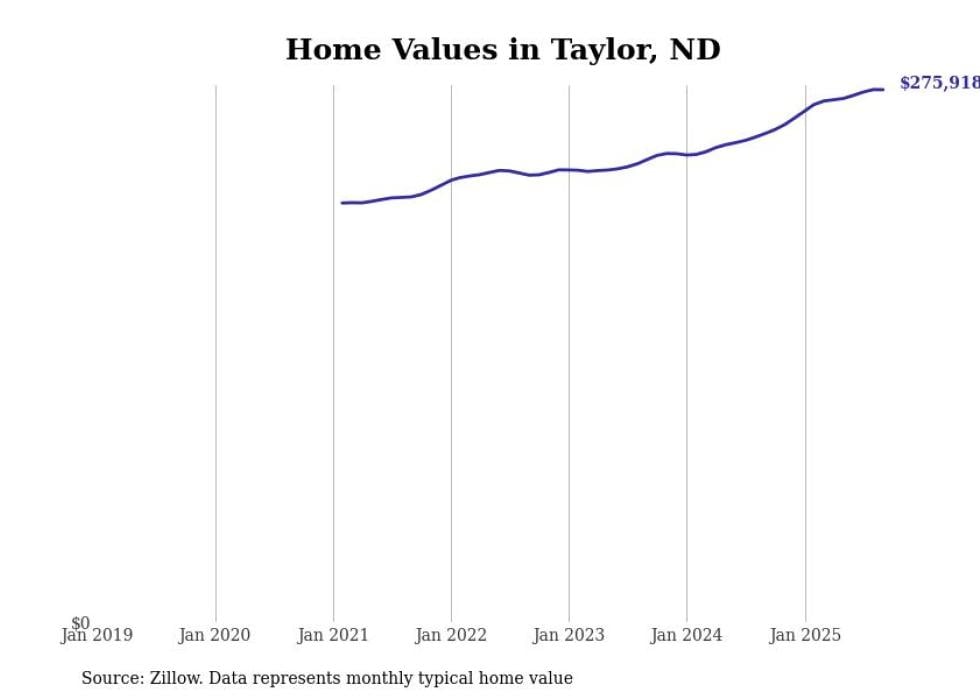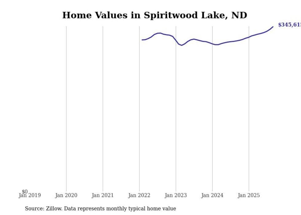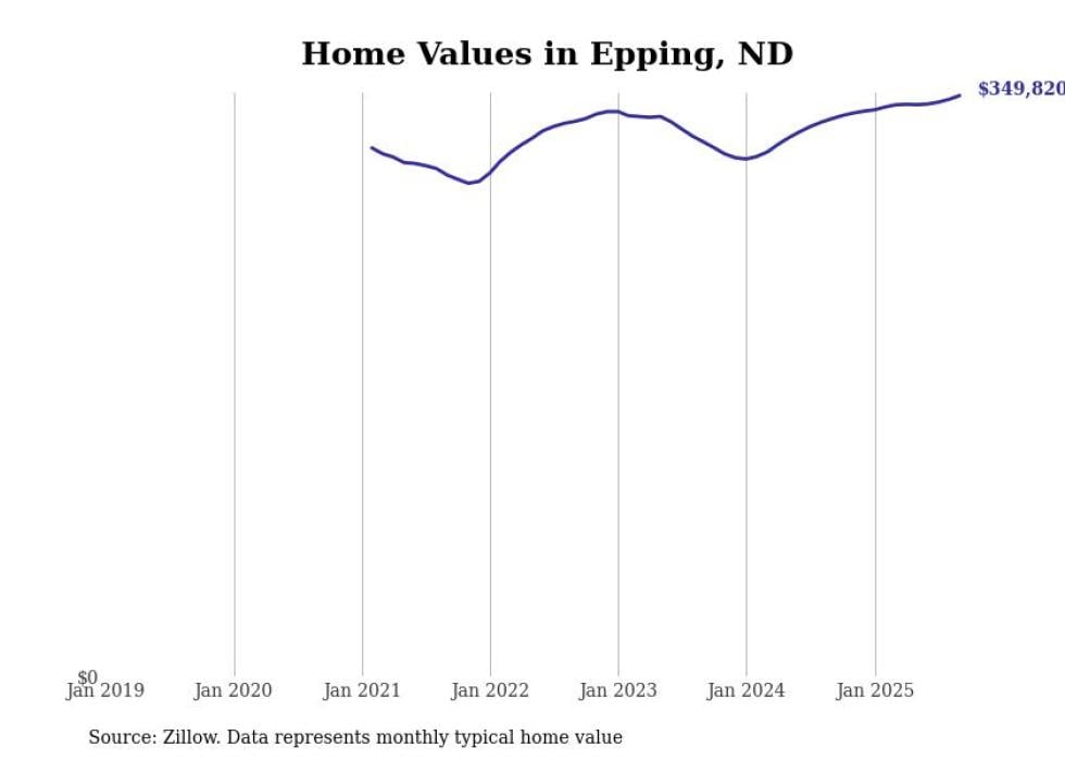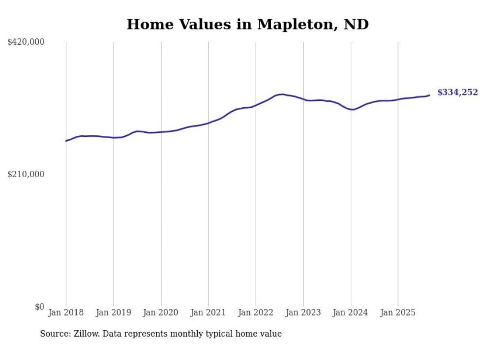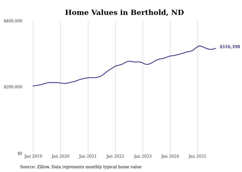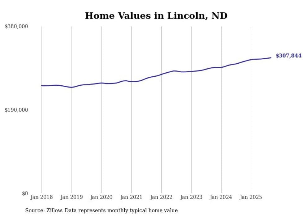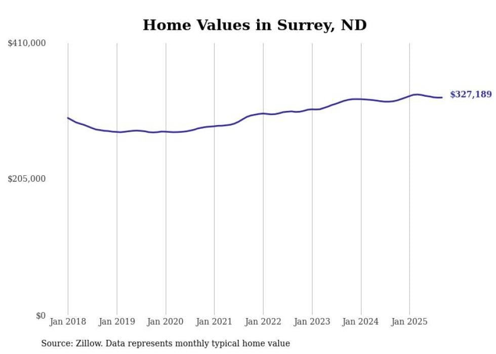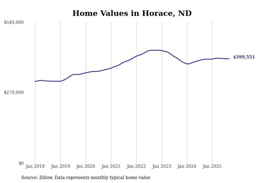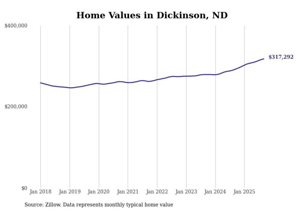 Stacker compiled a list of cities with the most expensive homes in North Dakota using data from Zillow. Cities are ranked by the Zillow Home Values Index for all homes as of September 2025. The charts in this story were created automatically using Matplotlib.