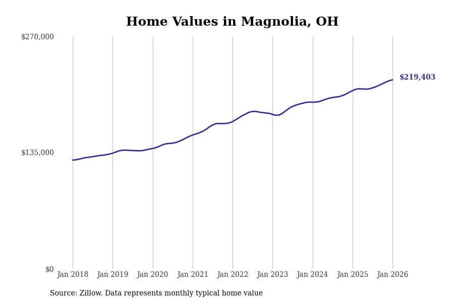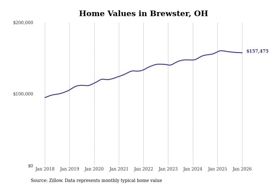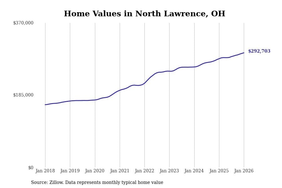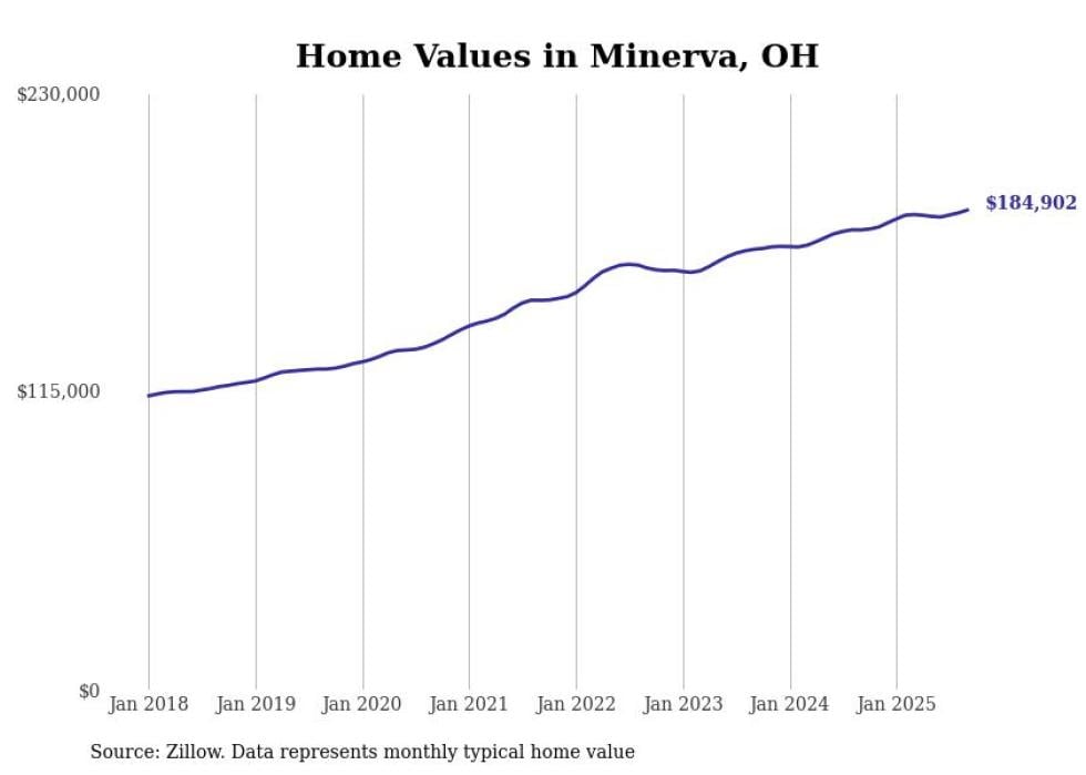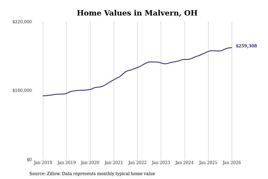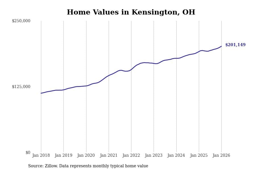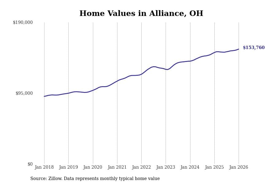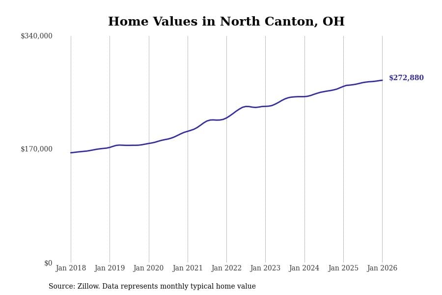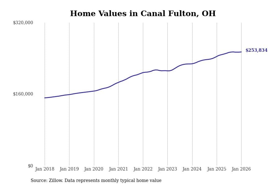 Stacker compiled a list of cities with the most expensive homes in the Canton metro area using data from Zillow. Charts show the monthly typical home value since January 2018. All 26 cities and towns with data available were included in the list.