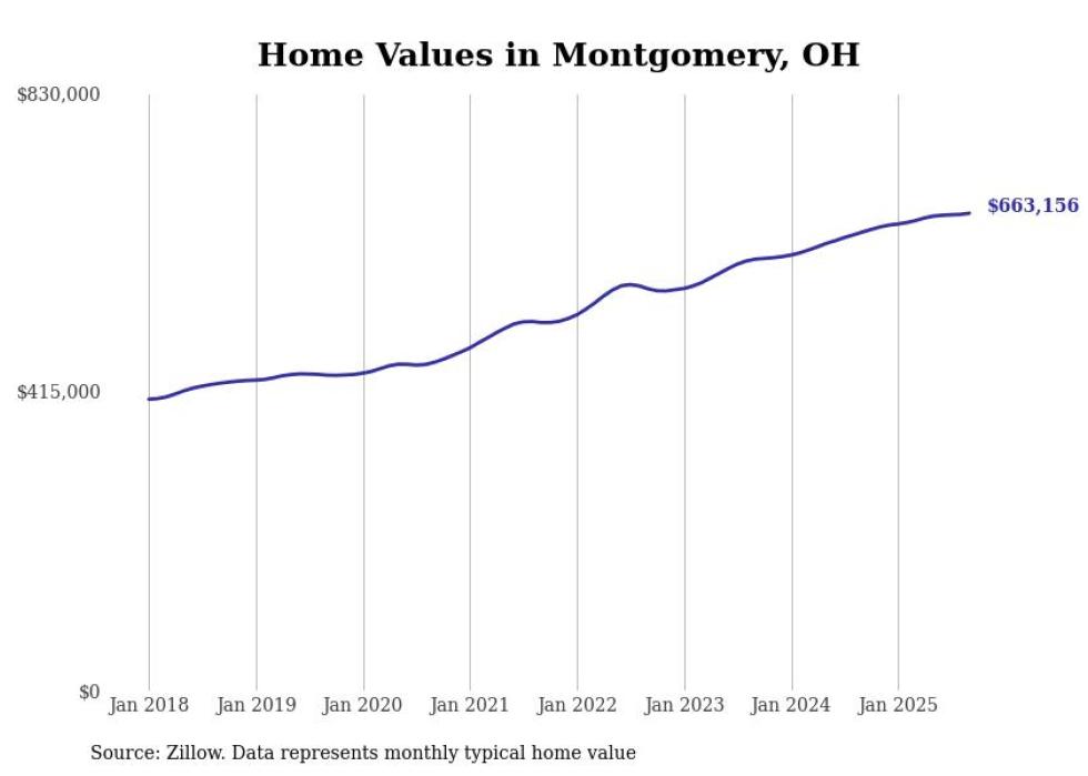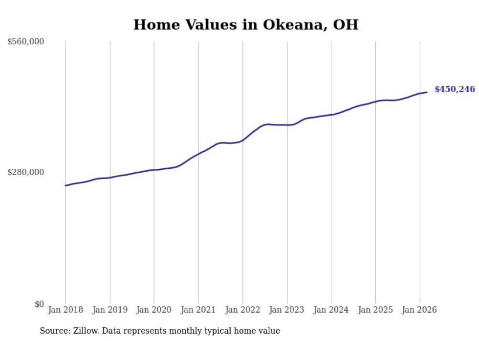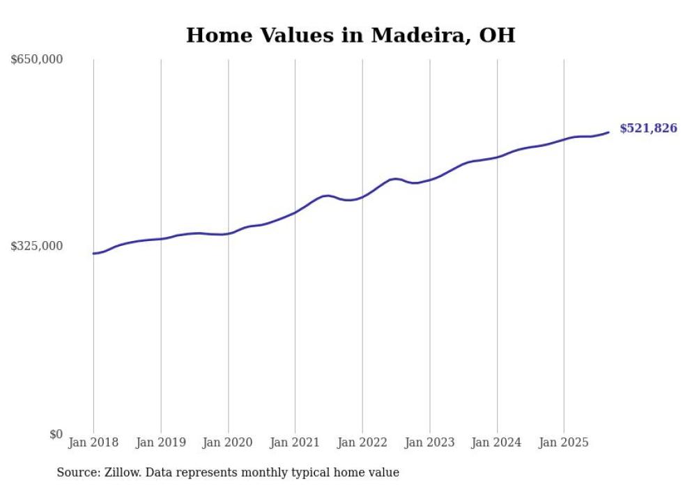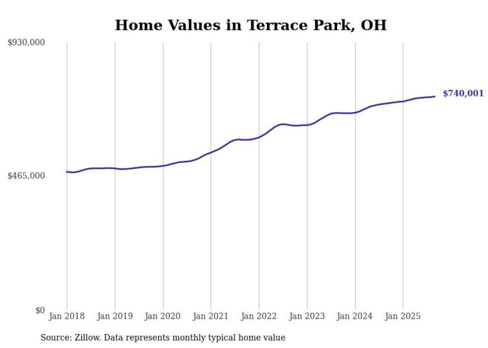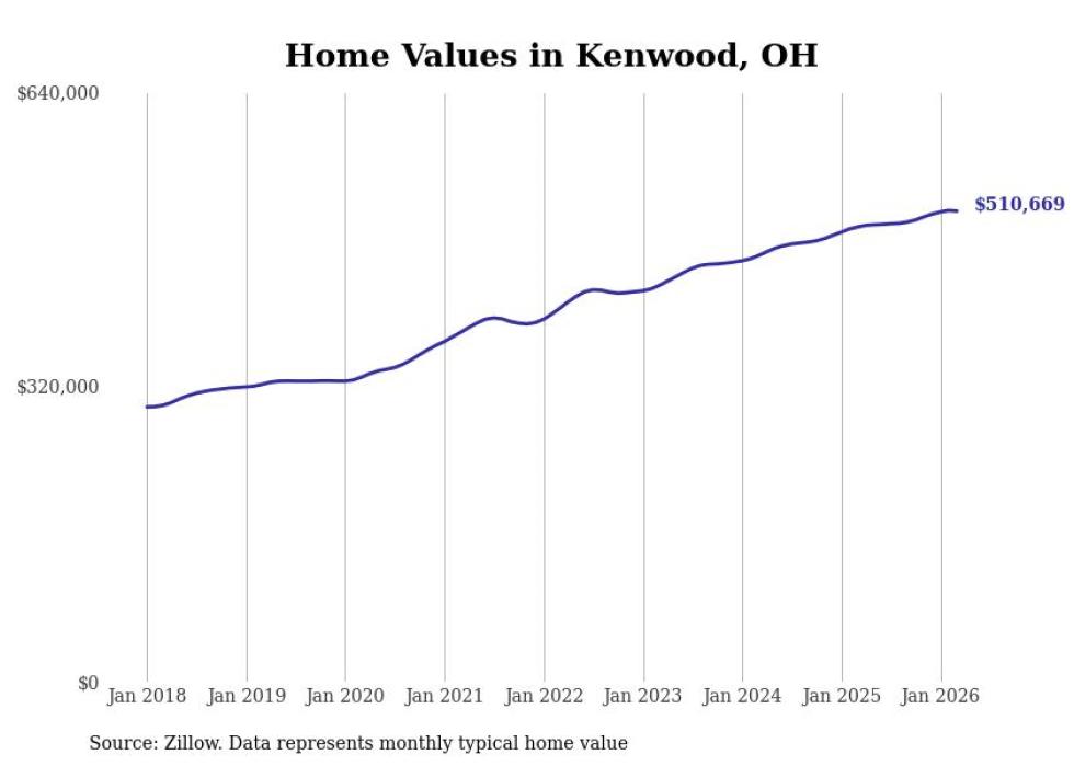 Stacker compiled a list of cities with the most expensive homes in the Cincinnati, OH-KY-IN metro area using data from Zillow. Charts show the monthly typical home value since January 2018.
